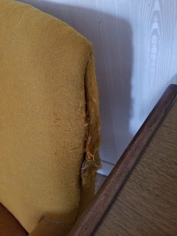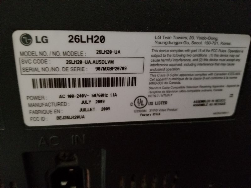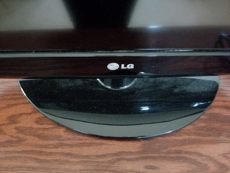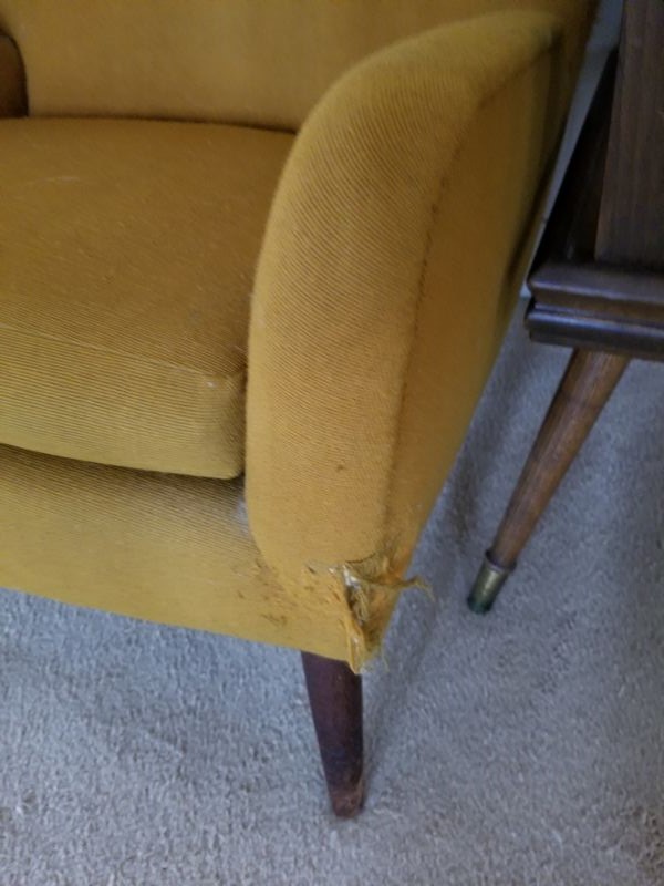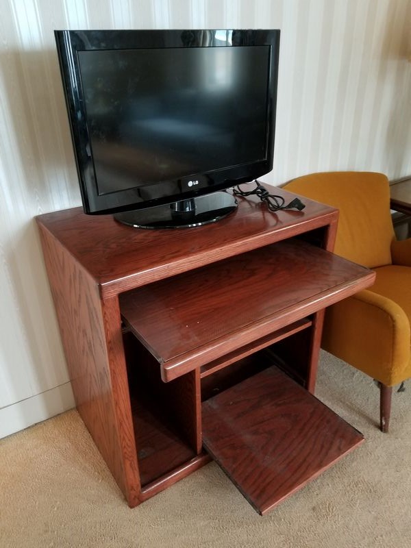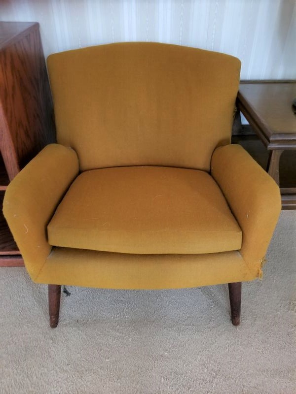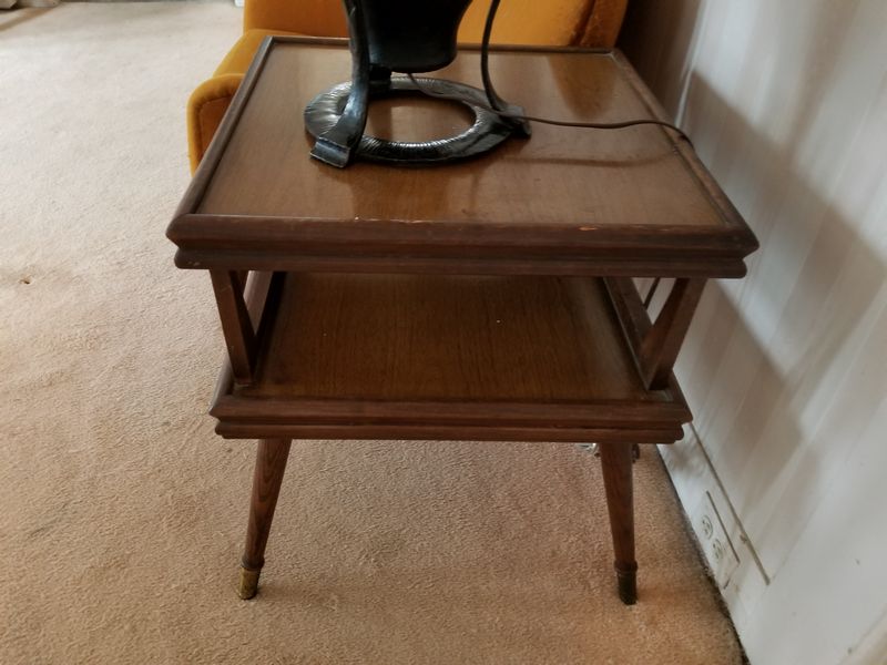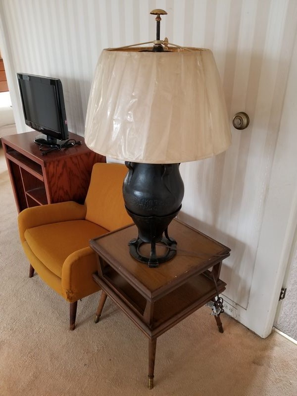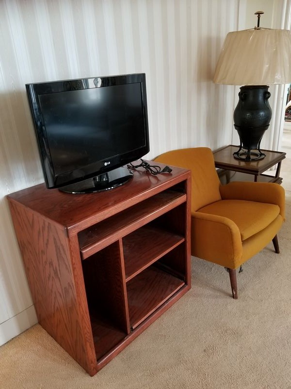 Mid Century Modern Den Furniture. Including mid-C modern upholstered chair (sign cat scratches, structure solid), 28"Wx26"Dx29"H; media cab with pull out drawers, 32"Wx20"Dx32"H; large end table, 21"sq x2'H; very large unique table lamp, 40"H; LG TV 26"diameter.