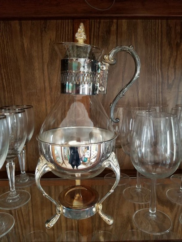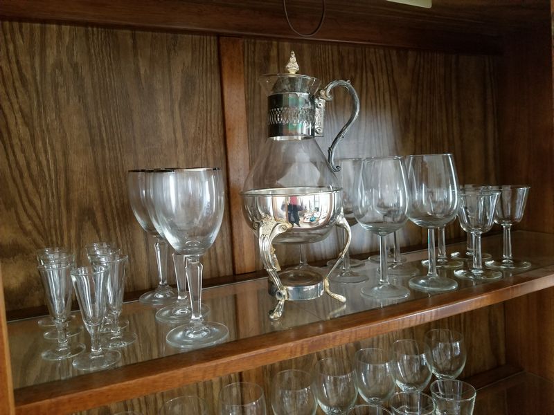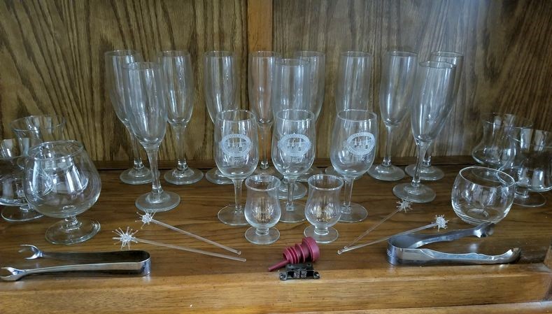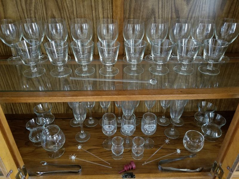 Bar Ware Featuring Vintage Glass Carafe. Many sets incl: set of seven cordials, ea. 4"H; set of seven red wine glasses; set of 10 beer glasses; set of eight cocktail glasses; set of 112 Champaign flutes; set of 4 aperitifs; other items seen on shelves. Cabinet in photo not included. Over 50 pieces.