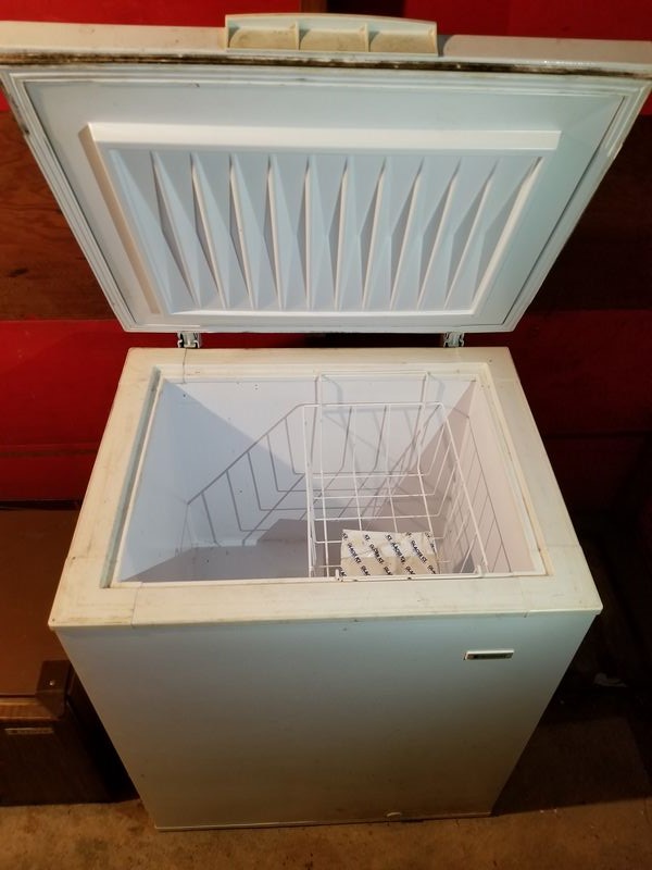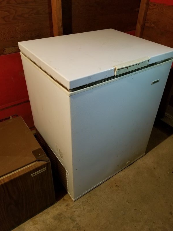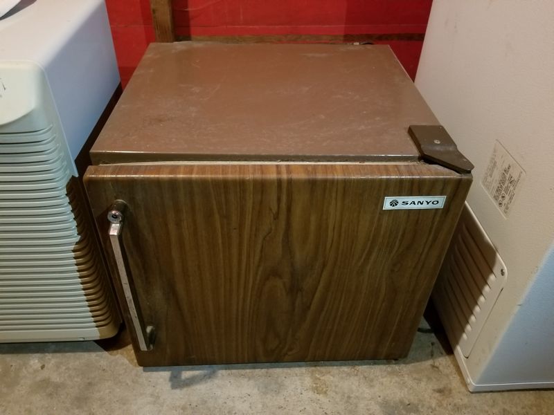 Frigidaire Freezer Chest, Dorm Fridge, Goldstar Humidifier. White Frigidaire small scale freezer chest, 27"Lx23"Dx34"H (very clean inside with tray); Sanyo brown dorm size fridge; Goldstar humidifier with manual. See photos for details and condition, Located in basement.