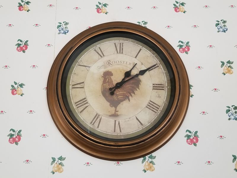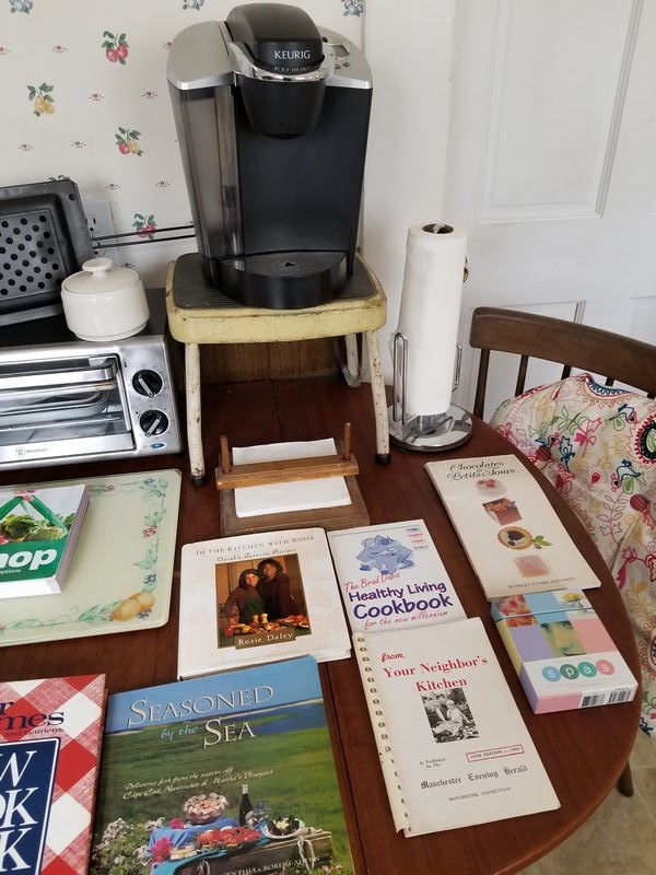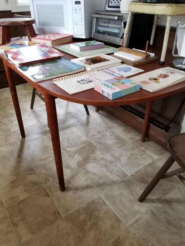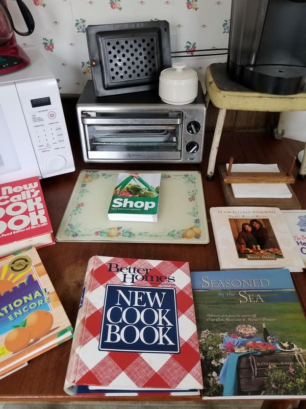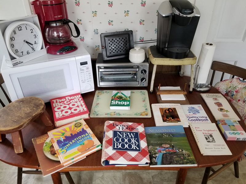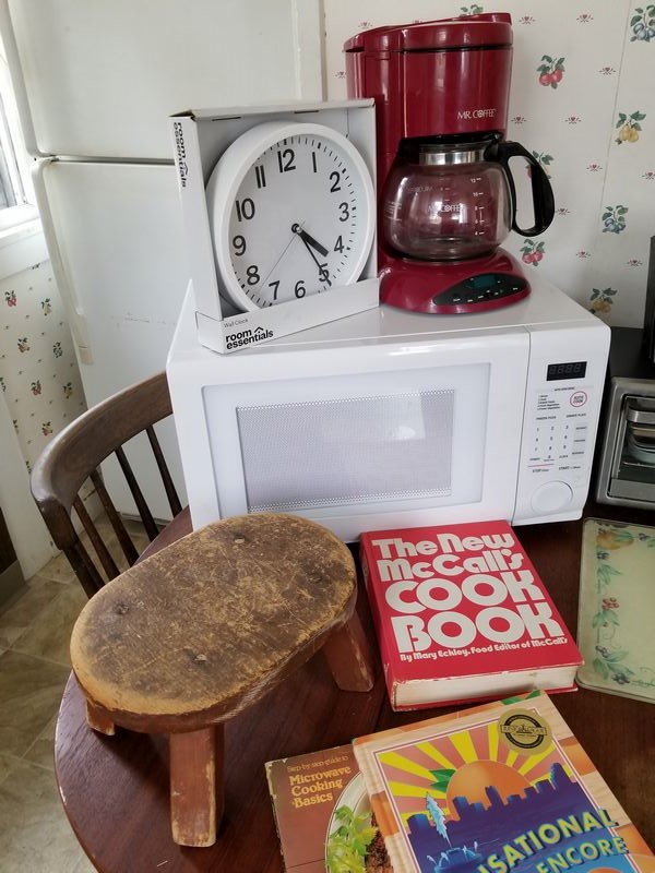 Kitchen Table, Microwave, Assort Kitchen Items. Vintage drop leaf table 59"L open (29" closed) x 3'Wx29"H; white modern microwave and Mr. Coffee red coffee maker; assorted cookbooks; toaster oven; stools; two wood chairs; two wall clocks, See photos for more details.
