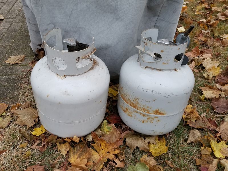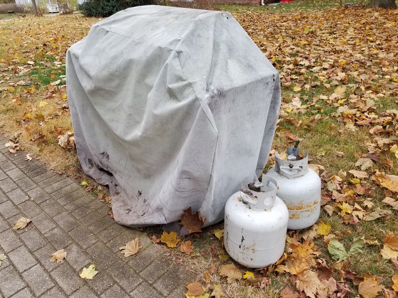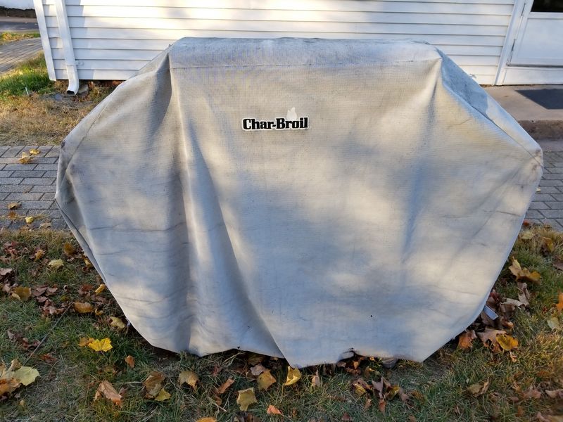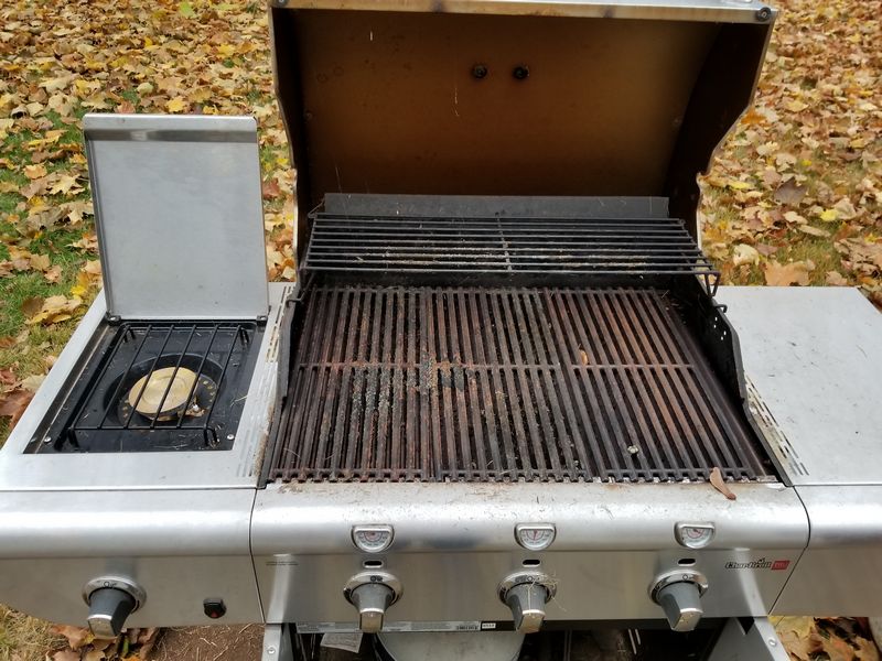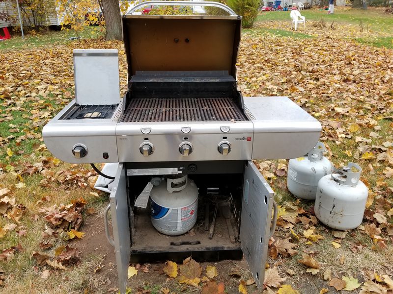 Charbroil Stainless Steel Gas Grill with Cover. Charbroil as grill with side burner, lower storage area and three inside burners. Comes with three propane tanks and grill cover. Grill is in good working condition, but req cleaning.