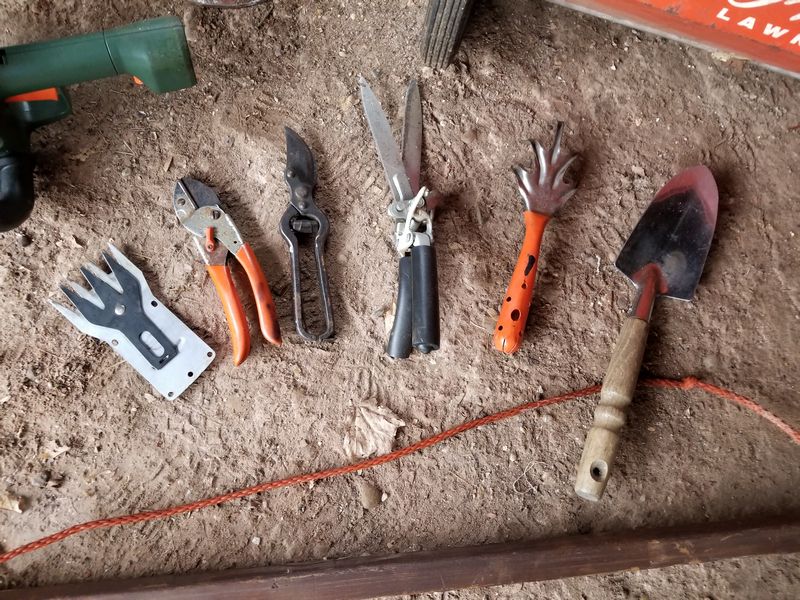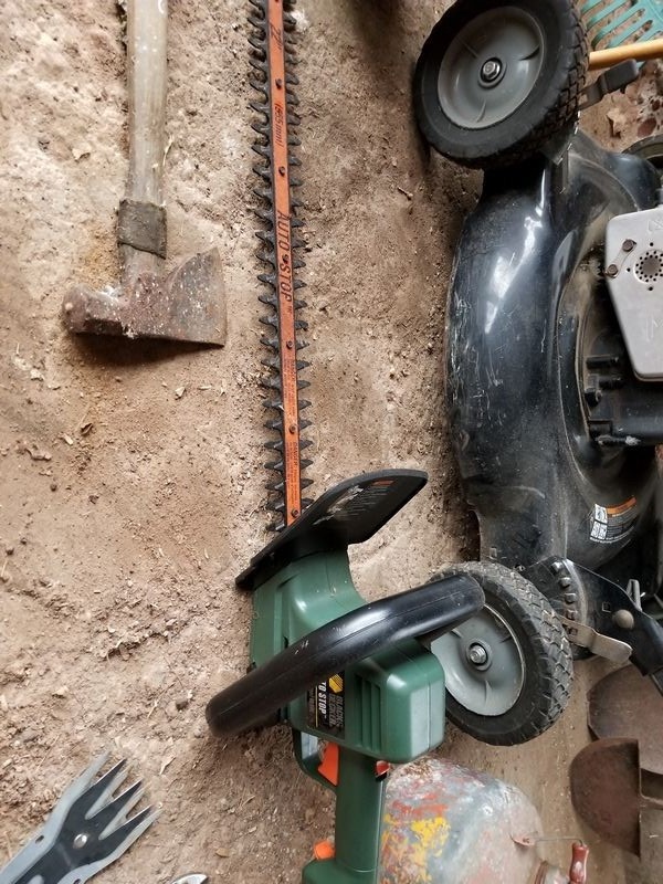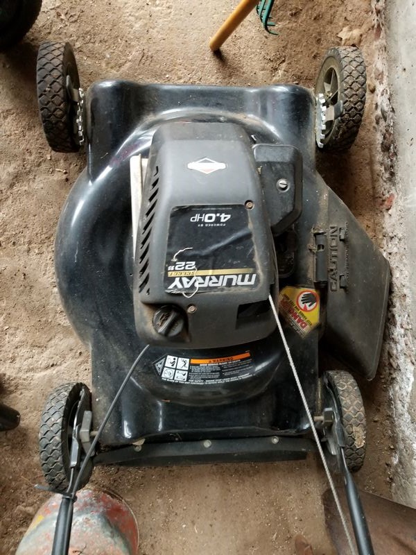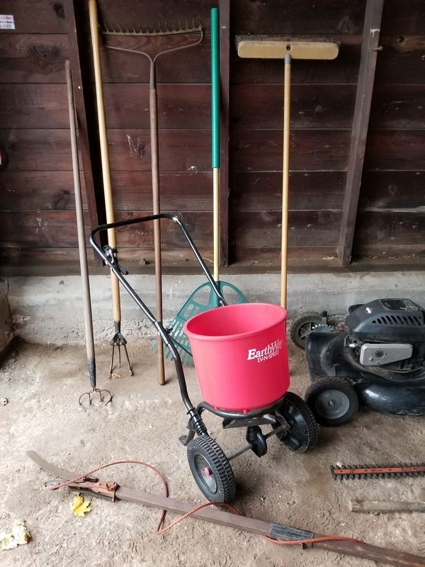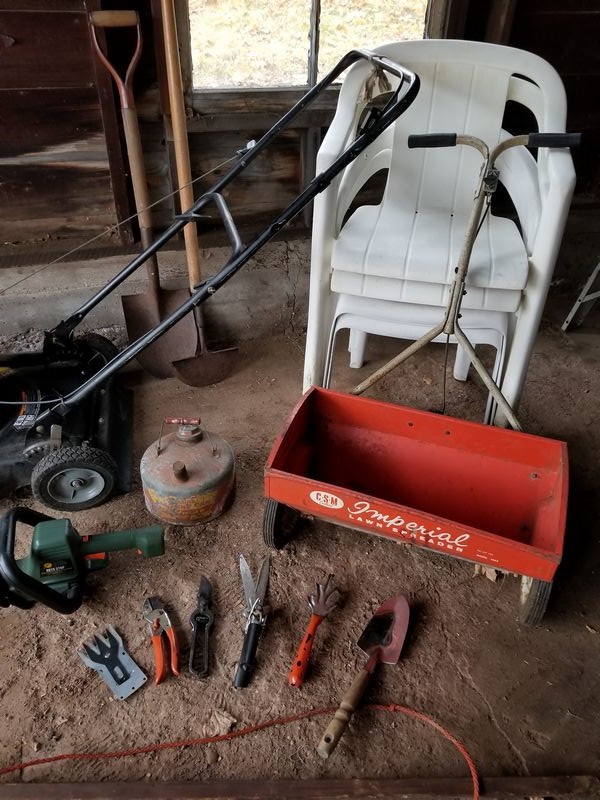 Lawn and Garden Equipment Featuring Murray Push Mower. Murray push mower with Briggs and Stratton motor; Black and Decker hedge trimmer; two seed spreaders; rakes; shovel; hand held garden equipment; set of four stacking outdoor plastic chairs; antique gas can; pole saw; and shop broom. Located in garage.