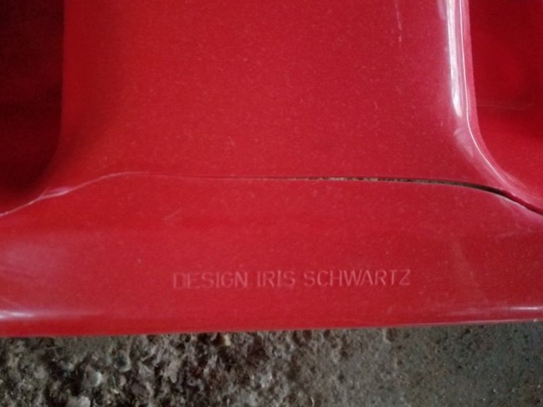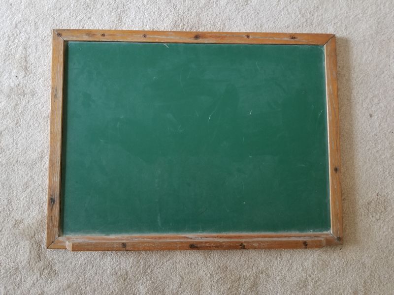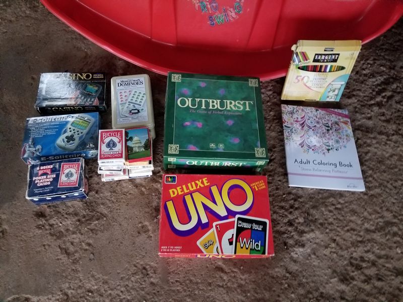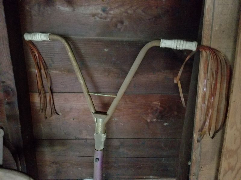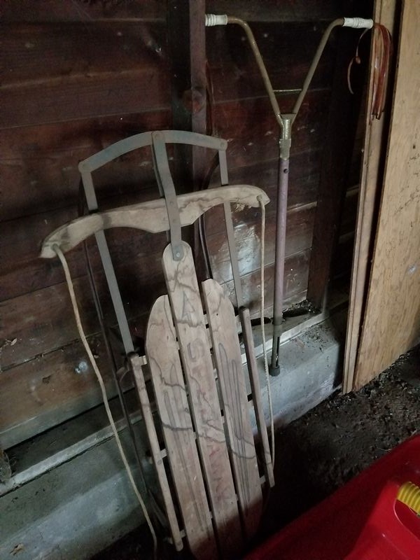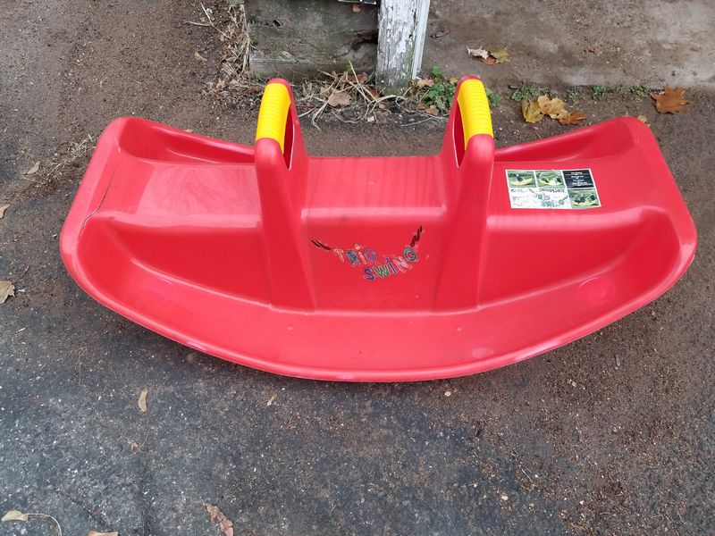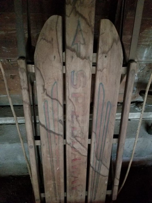 Children's Toys Featuring Vintage Pogo Stick and Teeter Totter. Vintage red plastic teeter totter by Schwartz; vintage Speedway sled; vintage pogo stick with orig tassels and handles intact (heavy patina); assorted board games and chalk board. (Small crack in teeter totter-see photo). Located in garage.