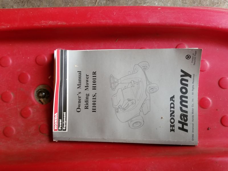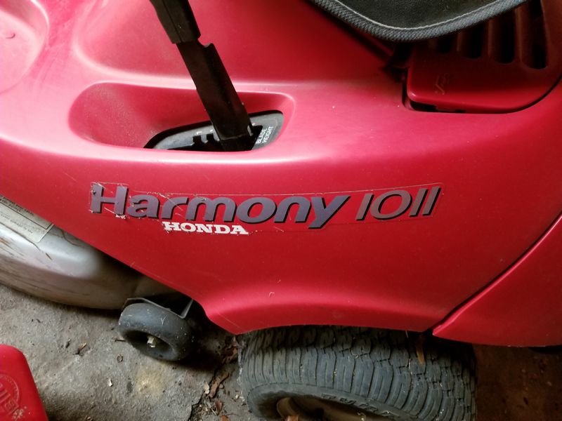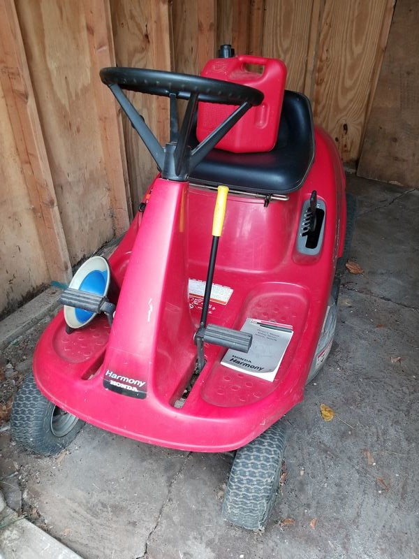 Honda Harmony 1011 Riding Lawn Mower. Honda Harmony 1011 riding mower with owner's manual, gas can and funnels. Located in shed.