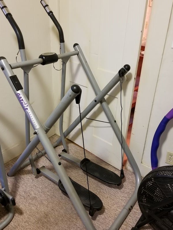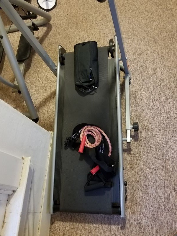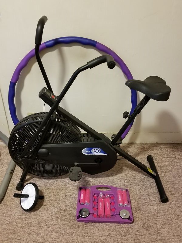 Fitness Equipment. Foldable Rock Fitness small scale treadmill, 21"Wx3'H open or 21"Wx 1.5'H closed; freestyle gazelle; Stamina 450 air resistance bike; other assorted items. See photos for details.