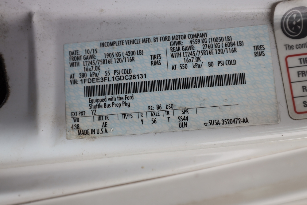 2016 Ford Paratransit Bus. VIN: 1FDEE3FL1GDC28131. Mileage: 193,779. Weak engine, weak transmission. Battery no good. Parts missing. Runs. Engine: 5.4 Liter. 8 Cylinder. Fuel: Gasoline. Title & key available. Fleet #: 1601.