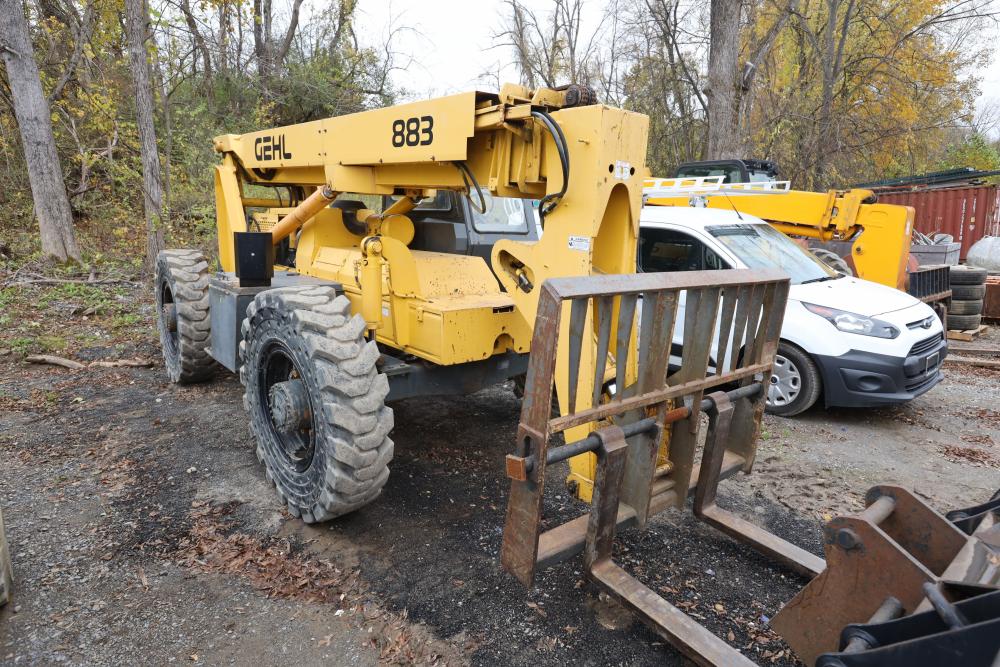 Gehl 883 telehandler part number 070PP128-1, John Deere engine, airless tires, with fork attachment, hour meter reading 6919 hours at time of photography. Runs and Drives, see video. See lots 52 for bucket not included in this lot.