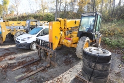 2006 JCB telehandler model 506CHL, with fork attachment, enclosed cab, hand and foot controls, hour meter reading 16902 at time of cataloging. PIN number 1184480. Runs and drives, see video.