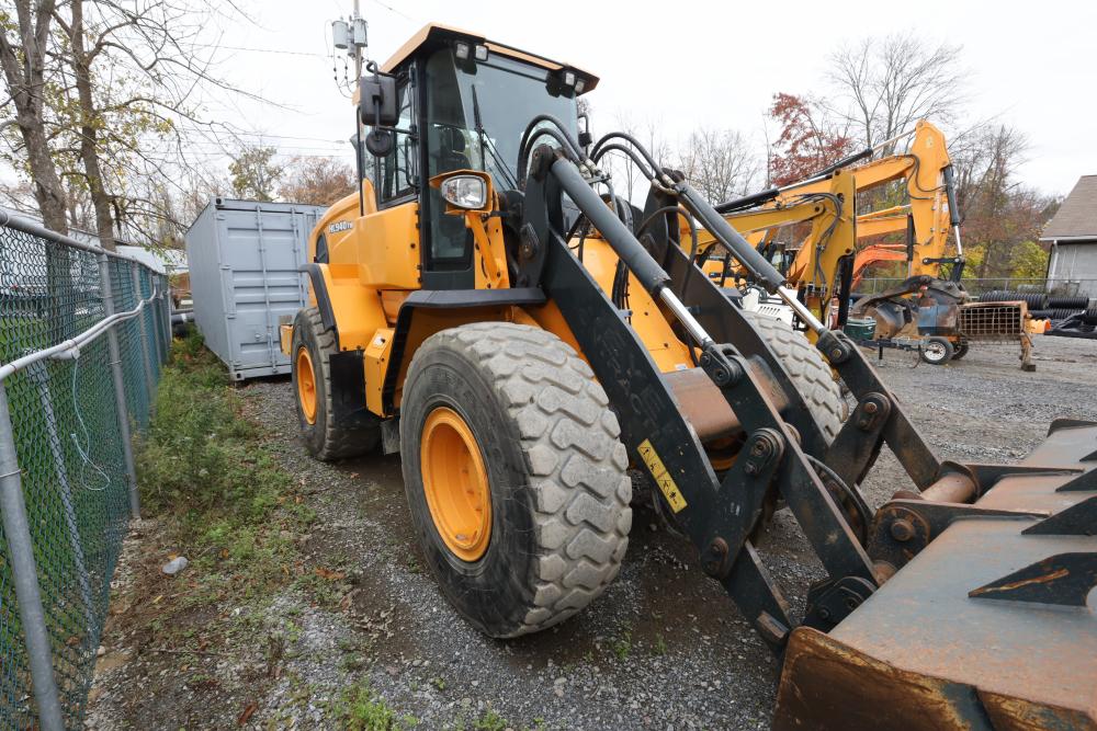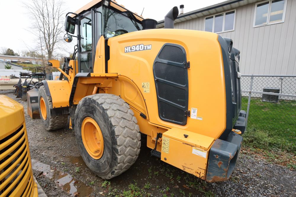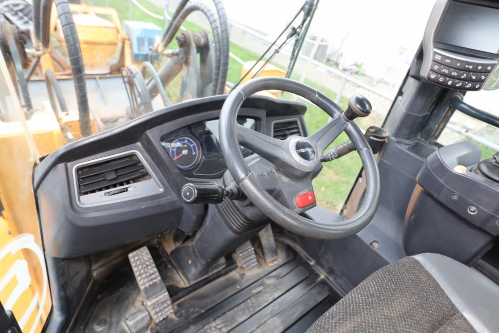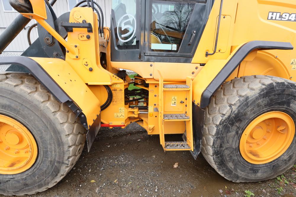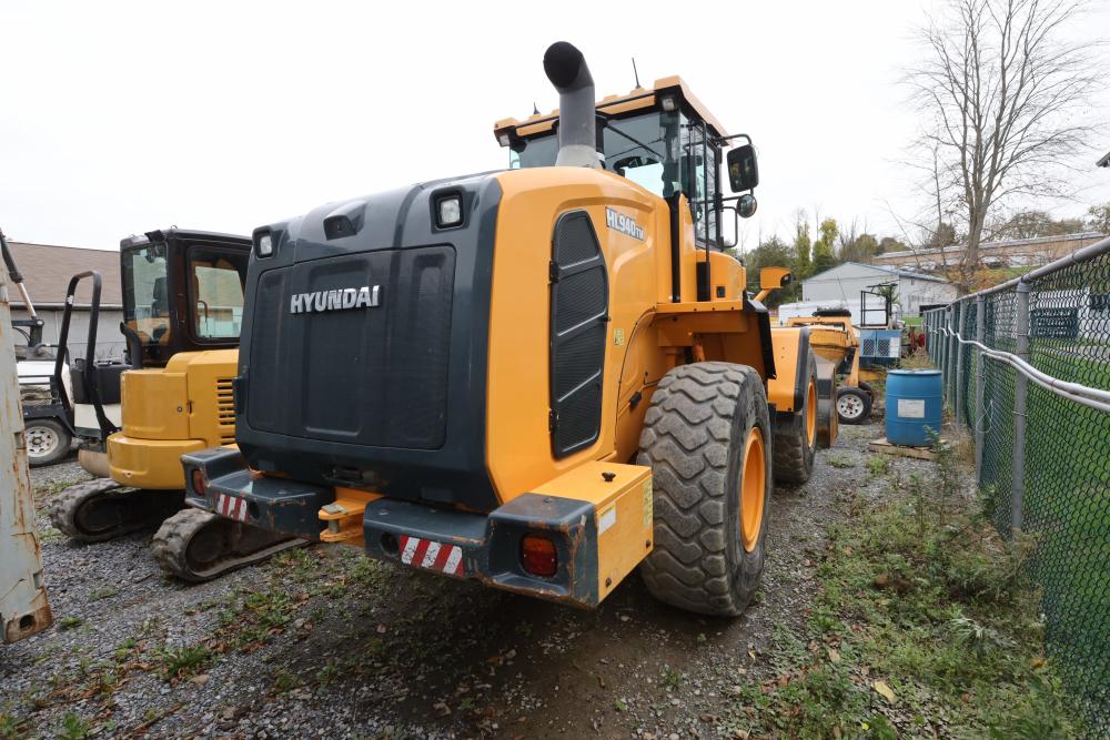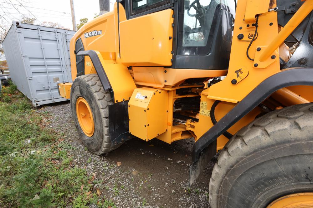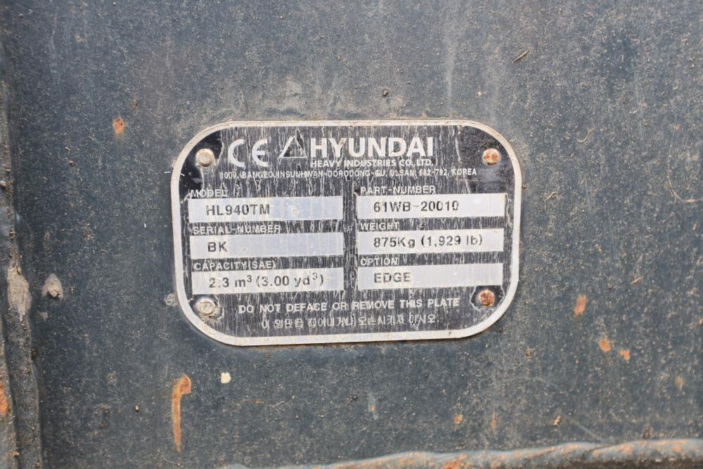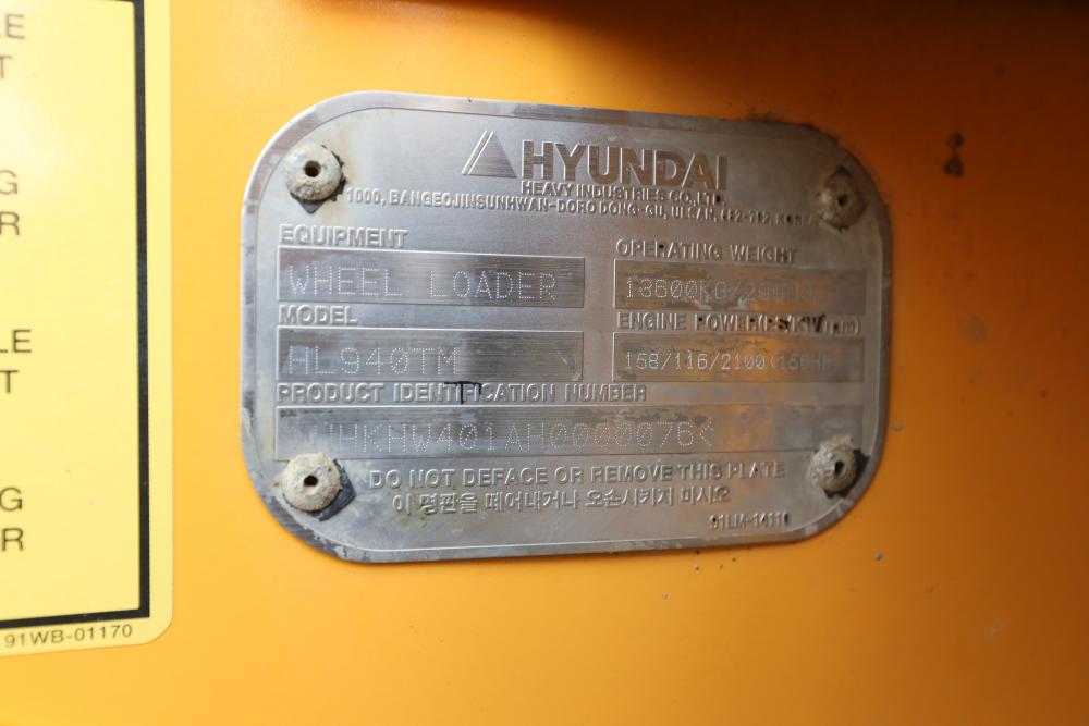Hyundai HL940TM articulating wheel loader with 3.00 yd bucket part number 61WB-20010, On-Board auto weighing system, backup camera, Heat, A/C, AM/FM/Bluetooth radio, hour meter reading 4540 at time of photography. Runs and drives, see video. See lots 50 and 51 for second bucket and forks not included in this lot.