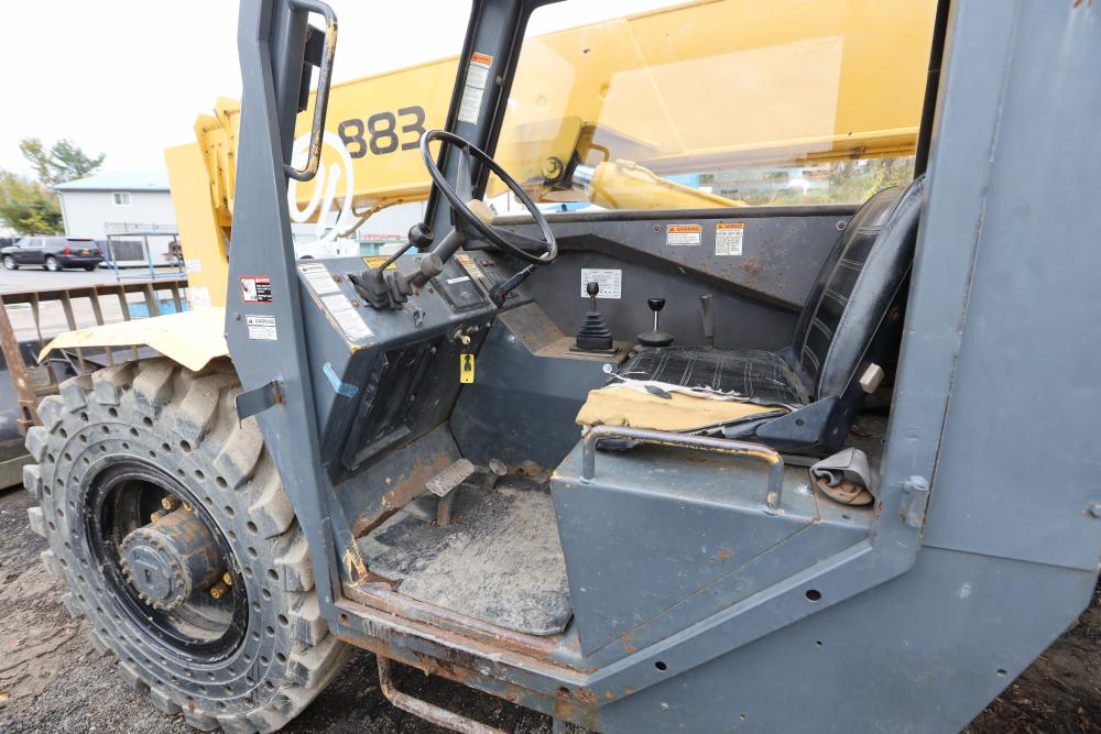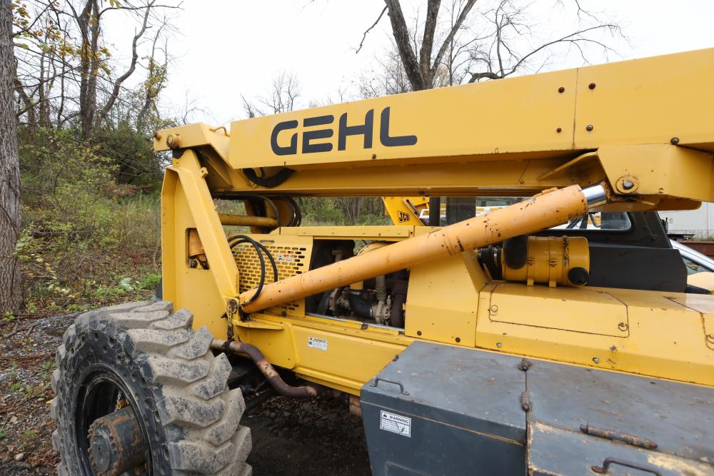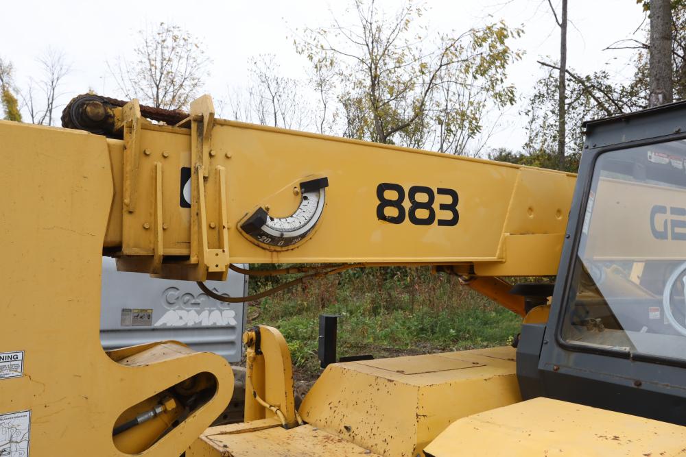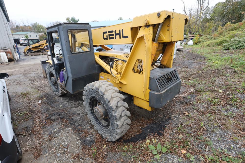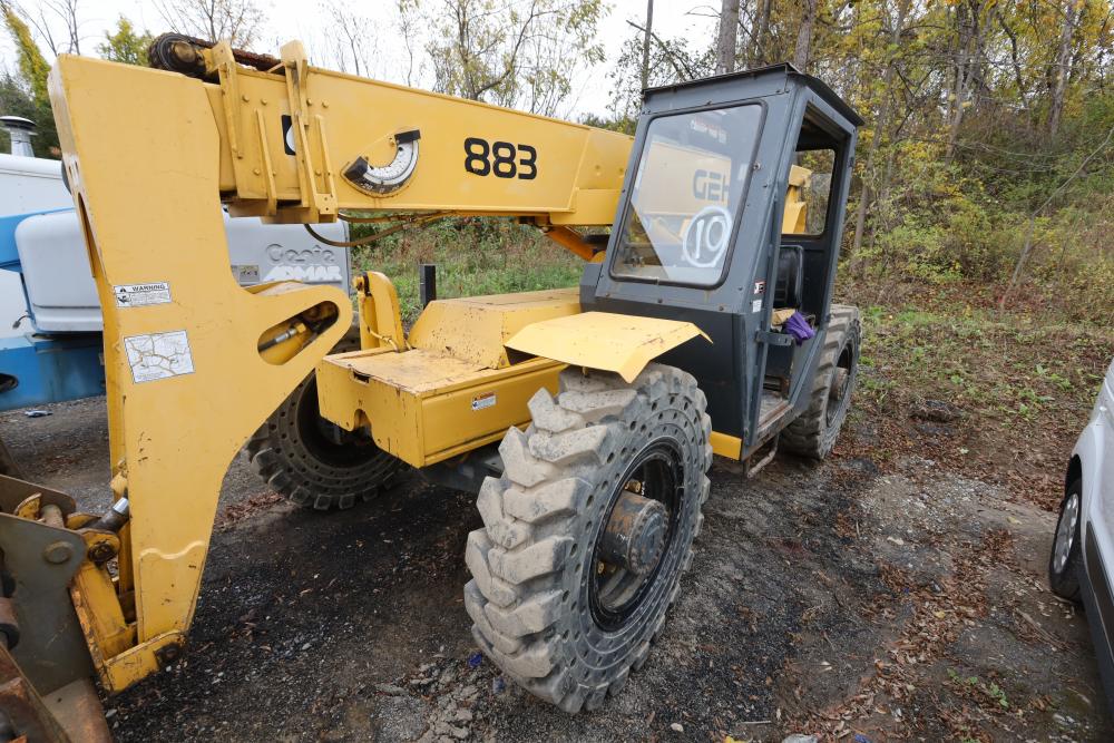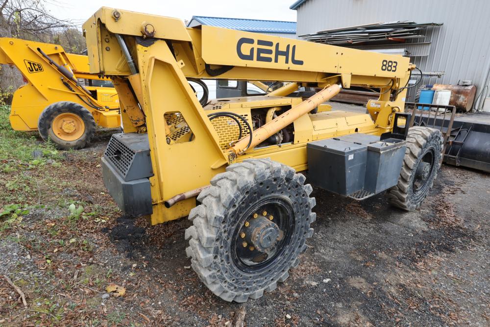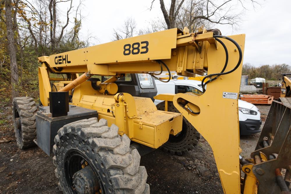 Gehl 883 telehandler part number 070PP128-1, John Deere engine, airless tires, with fork attachment, hour meter reading 6919 hours at time of photography. Runs and Drives, see video. See lots 52 for bucket not included in this lot.