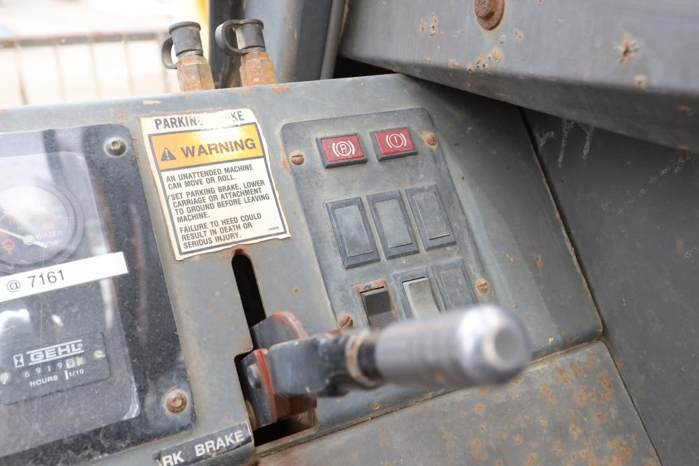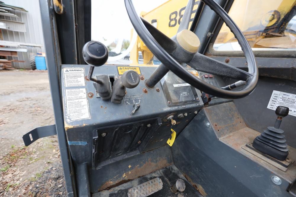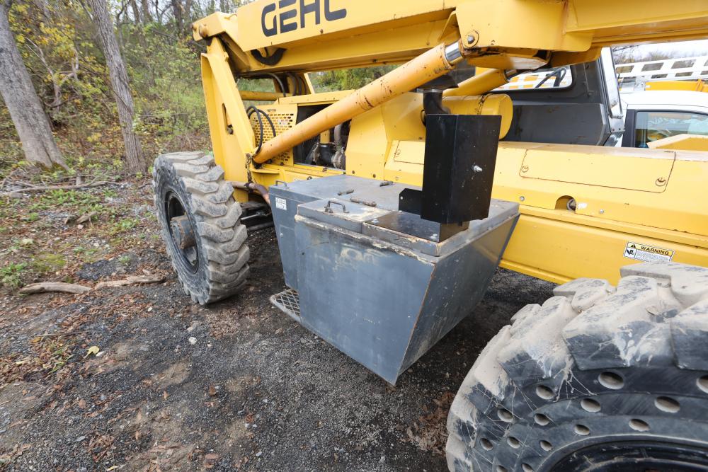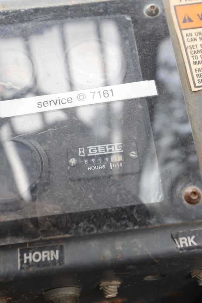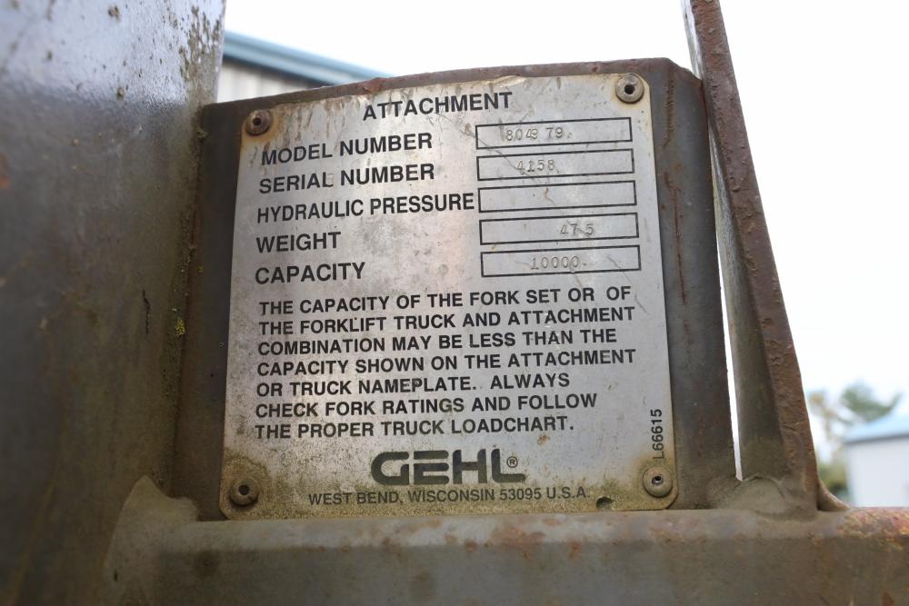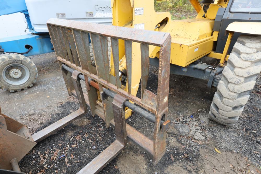 Gehl 883 telehandler part number 070PP128-1, John Deere engine, airless tires, with fork attachment, hour meter reading 6919 hours at time of photography. Runs and Drives, see video. See lots 52 for bucket not included in this lot.