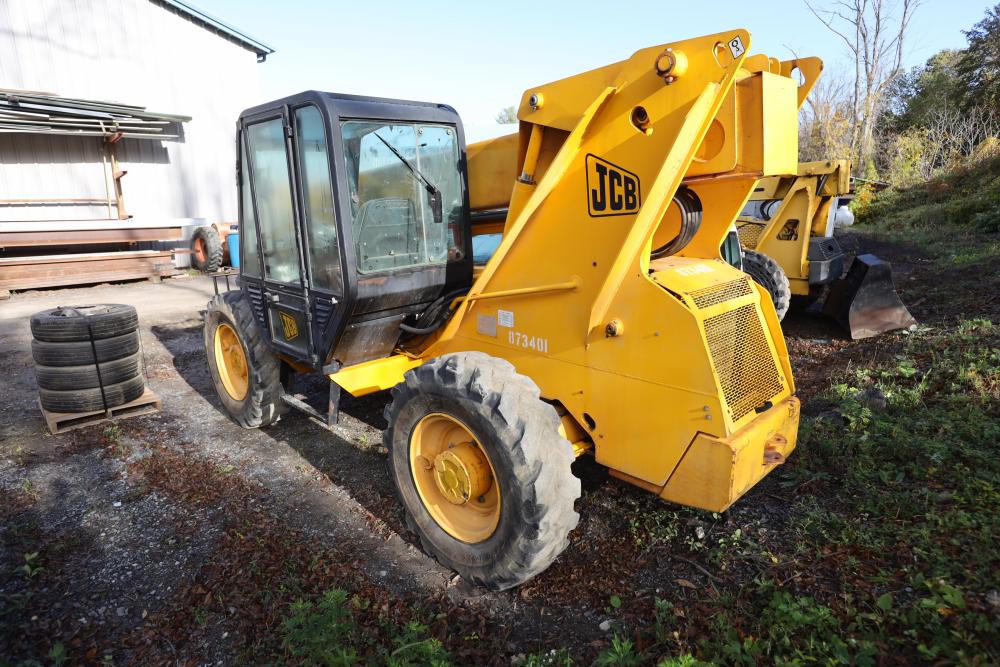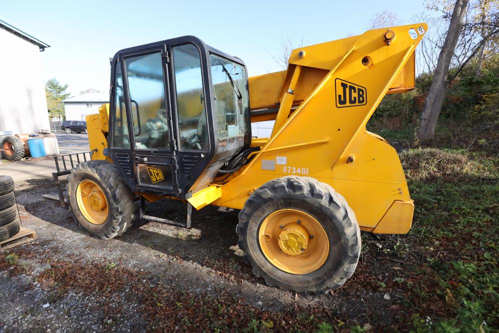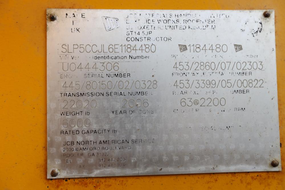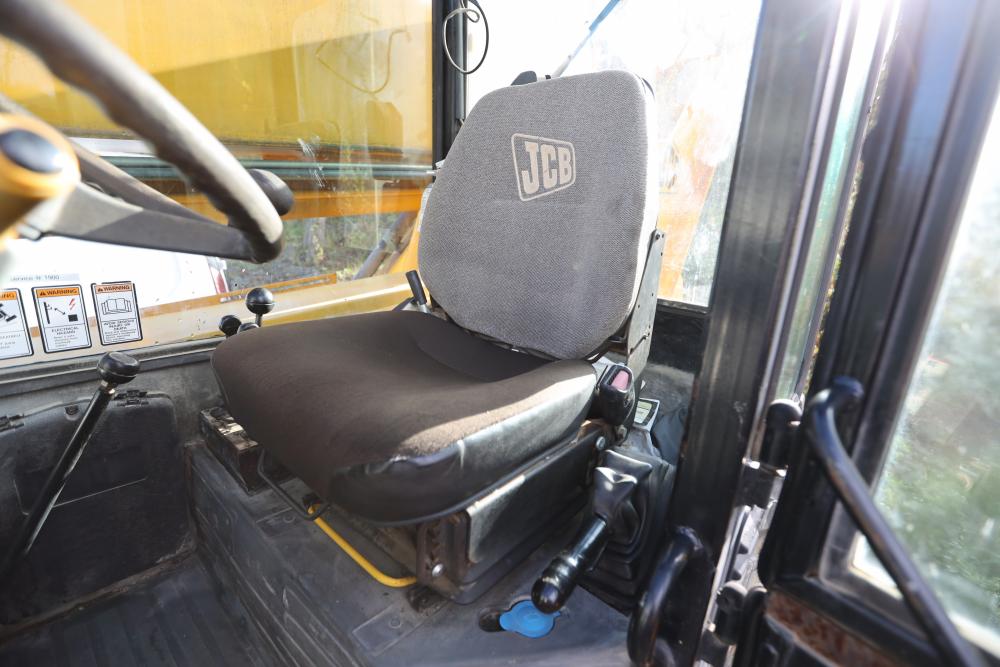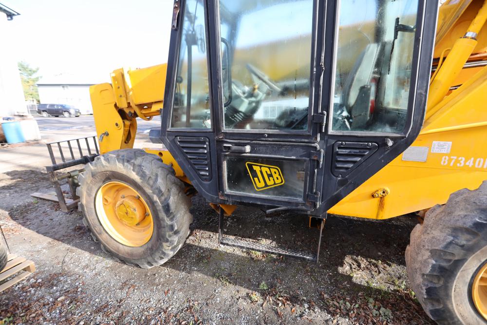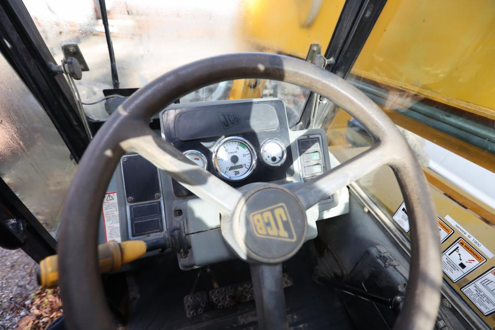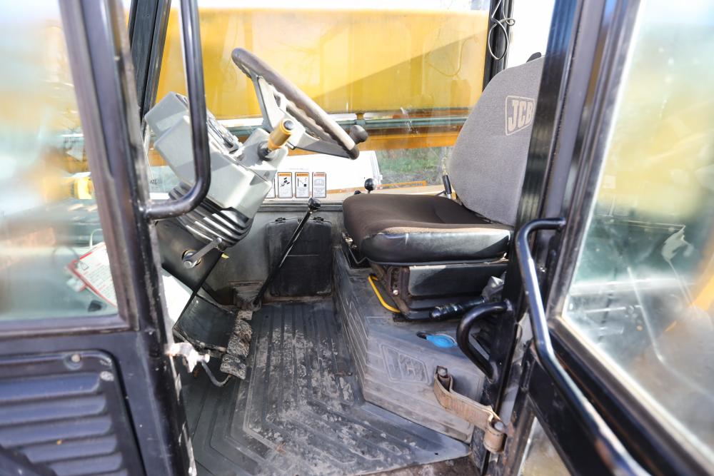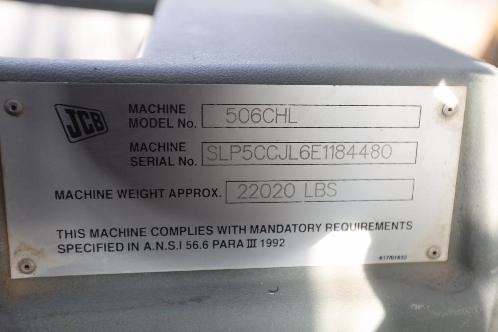 2006 JCB telehandler model 506CHL, with fork attachment, enclosed cab, hand and foot controls, hour meter reading 16902 at time of cataloging. PIN number 1184480. Runs and drives, see video.