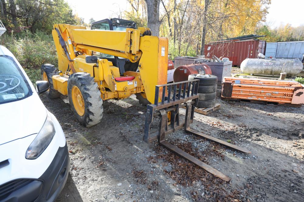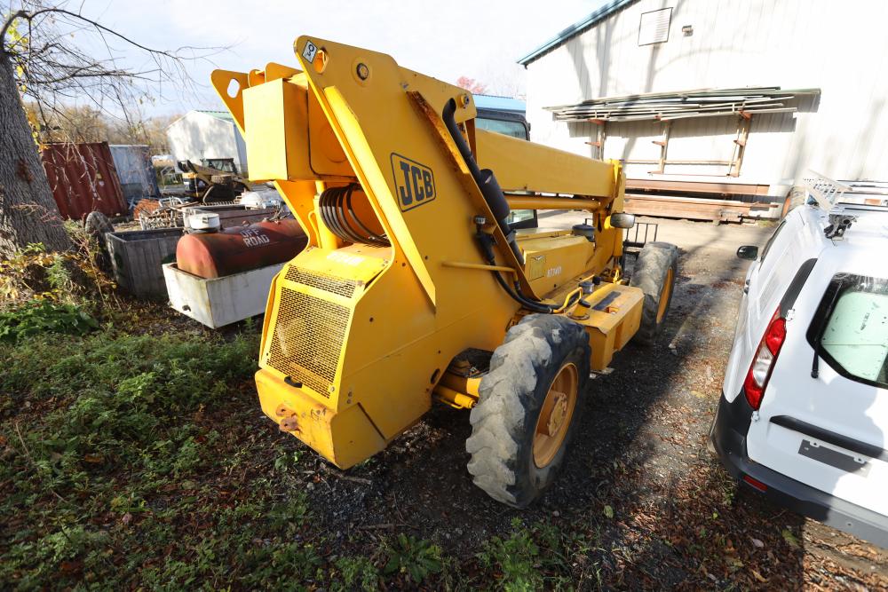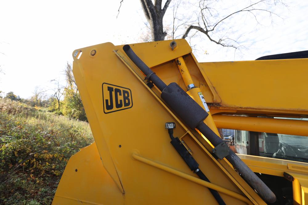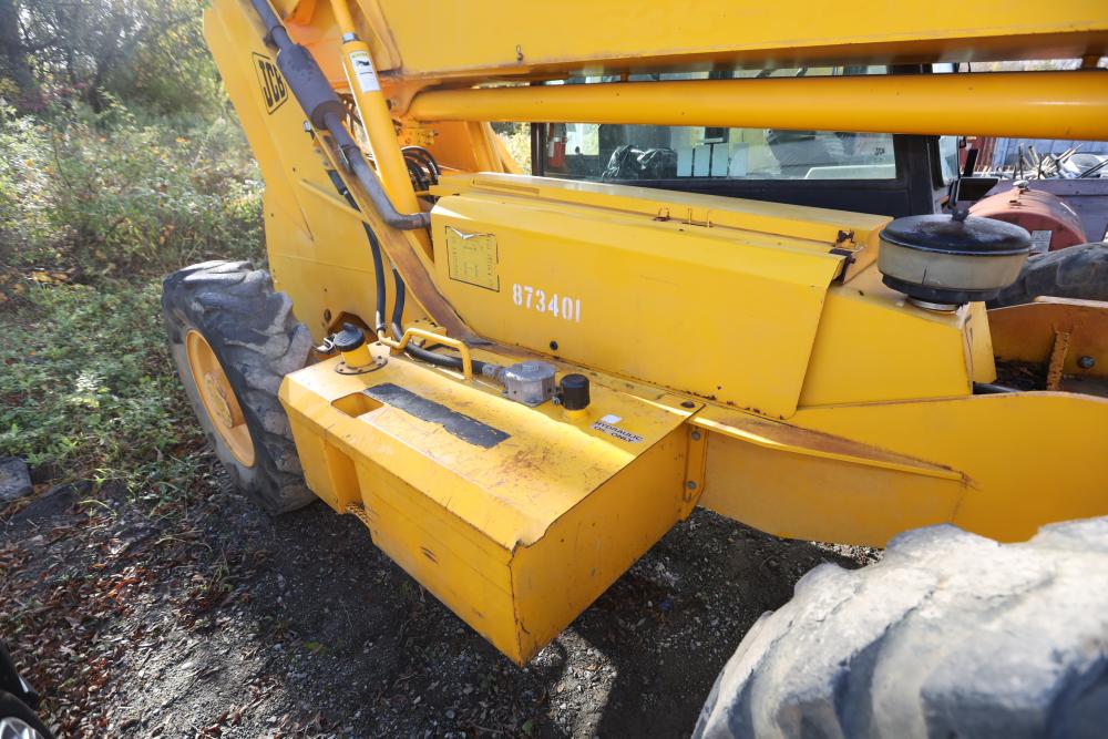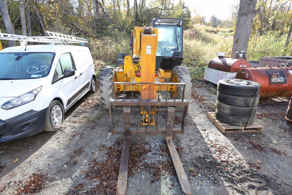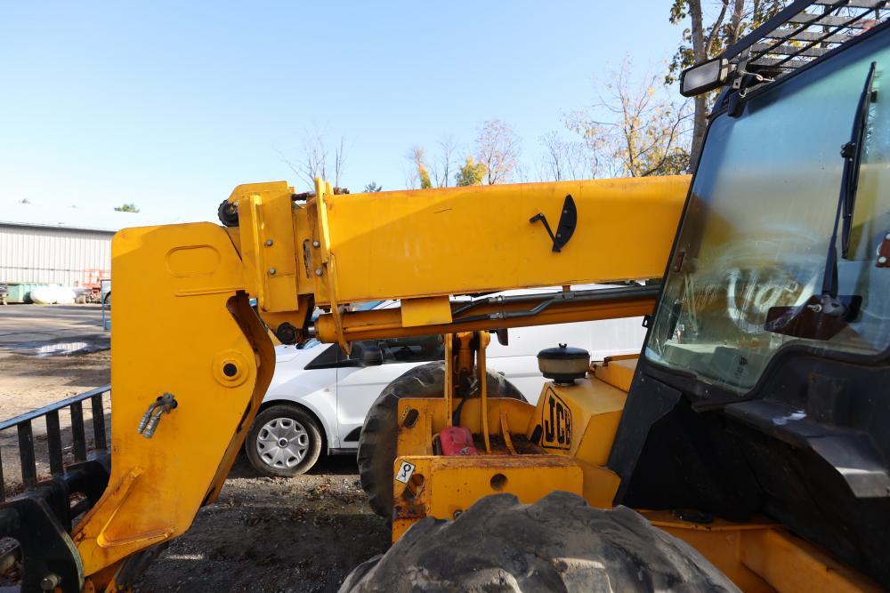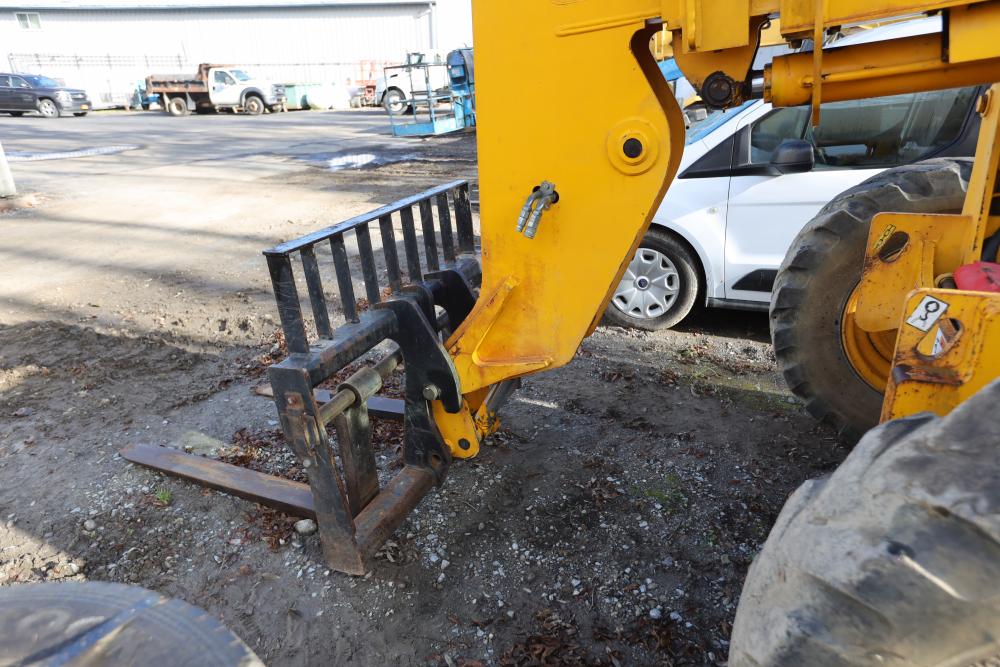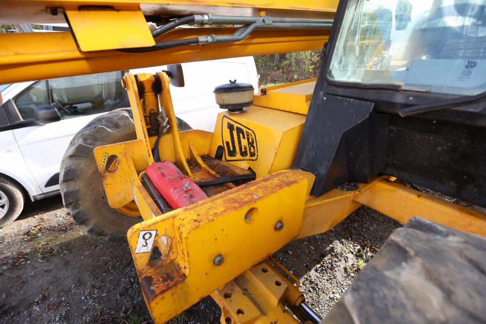 2006 JCB telehandler model 506CHL, with fork attachment, enclosed cab, hand and foot controls, hour meter reading 16902 at time of cataloging. PIN number 1184480. Runs and drives, see video.