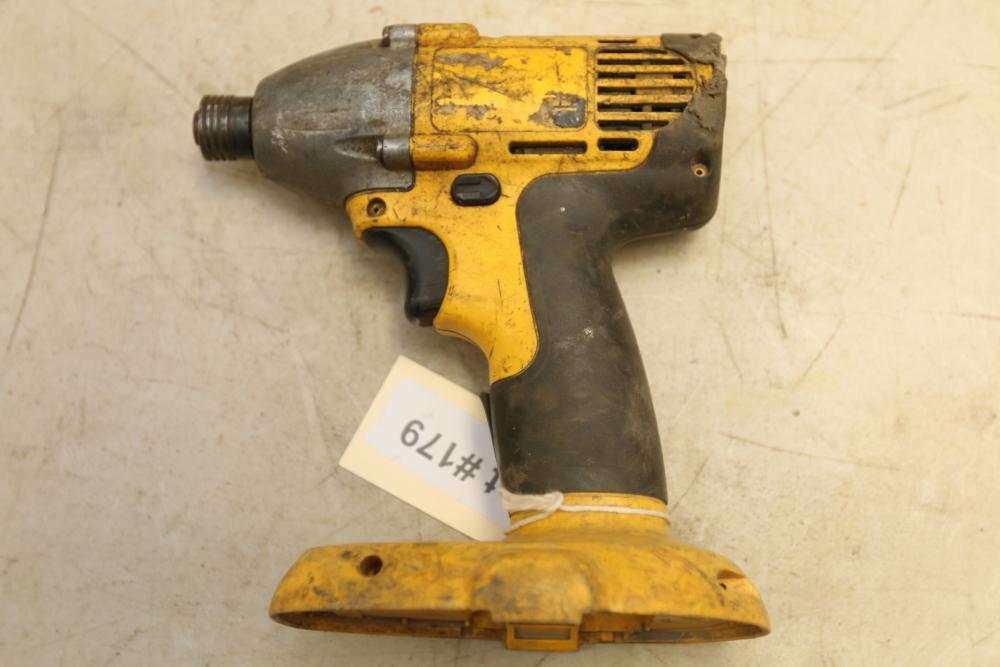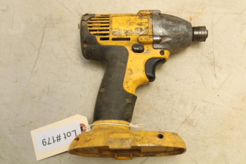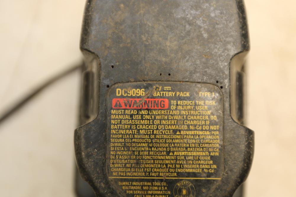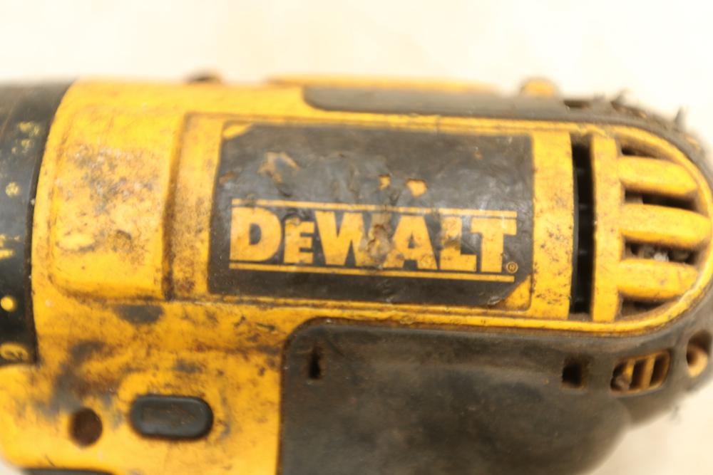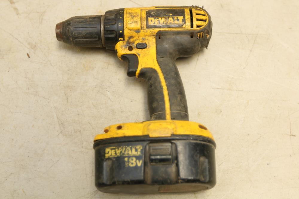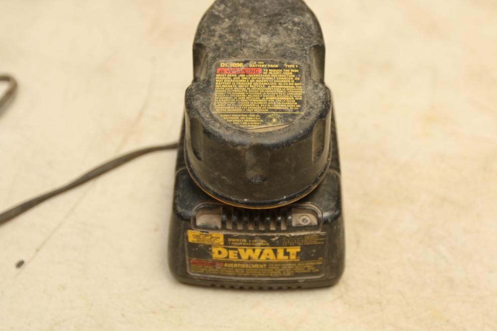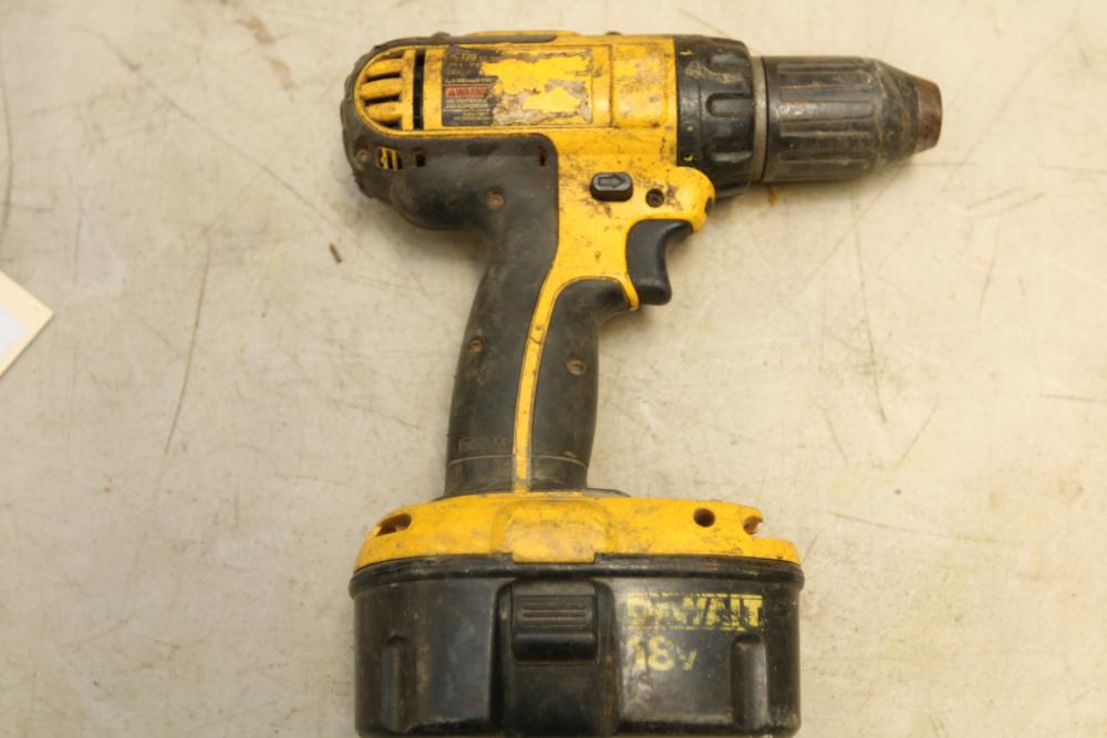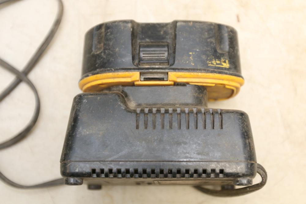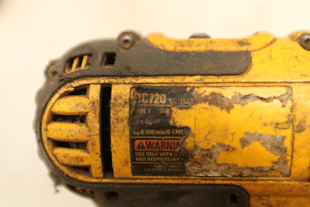 DeWalt battery powered 1/2" drill model DC720, nut drive with no visible markings, also incl two 18V batteries and one battery charger.