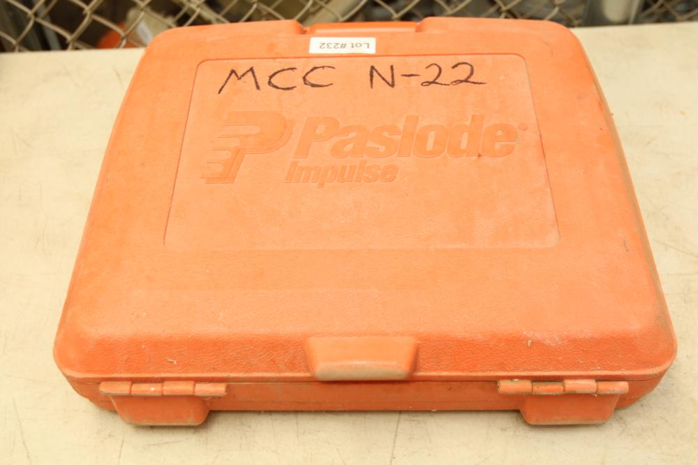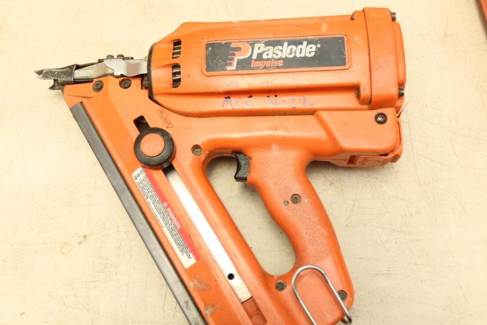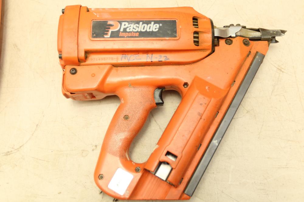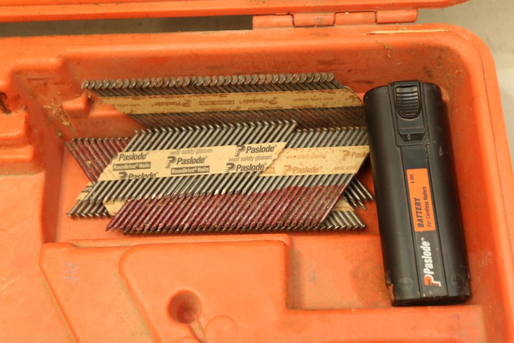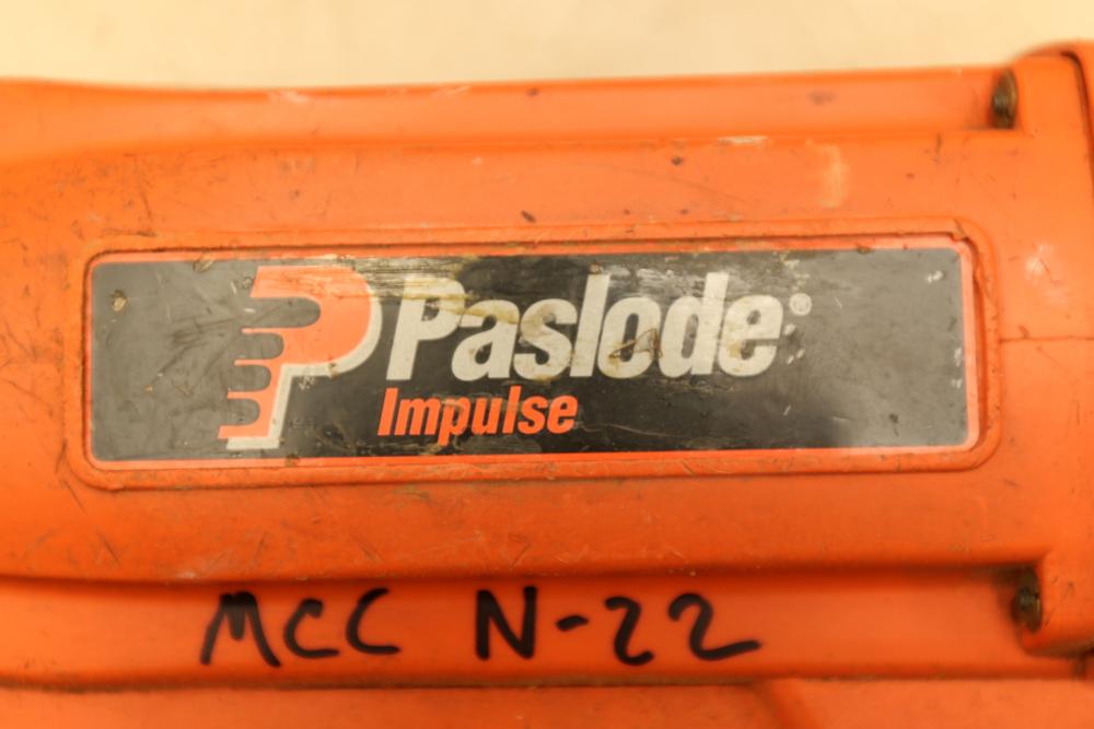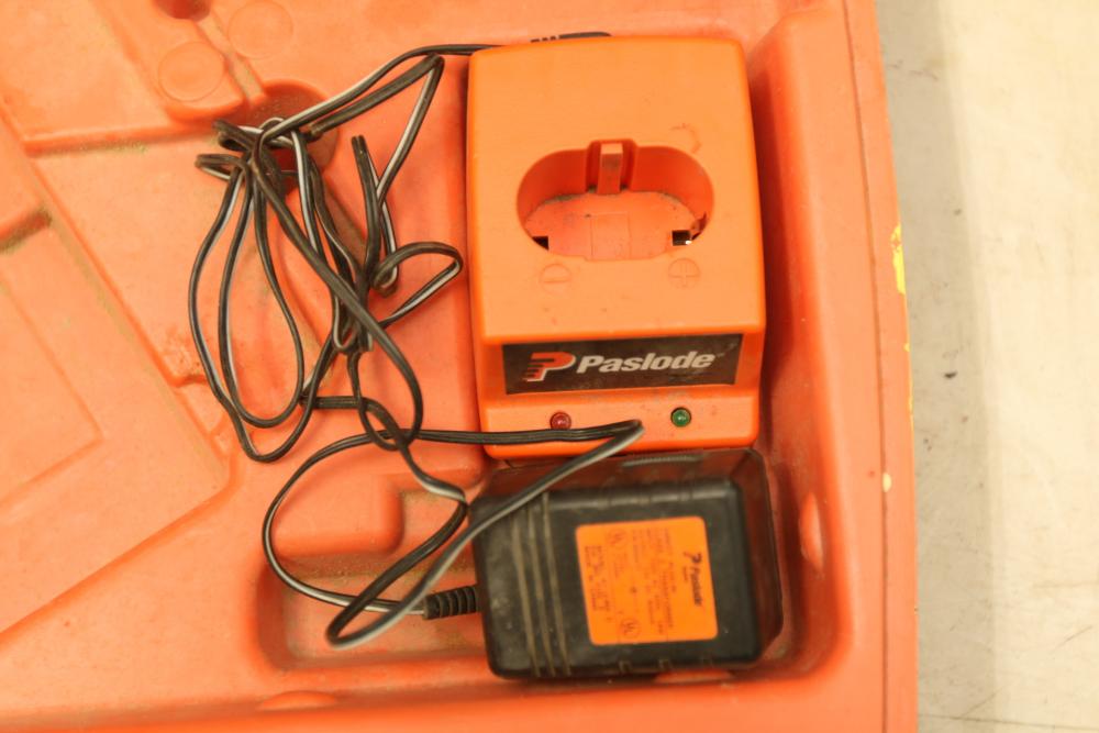 Paslode Impulse battery powered cordless utility framing nailer model IMCT with one battery, charger, and plastic case.