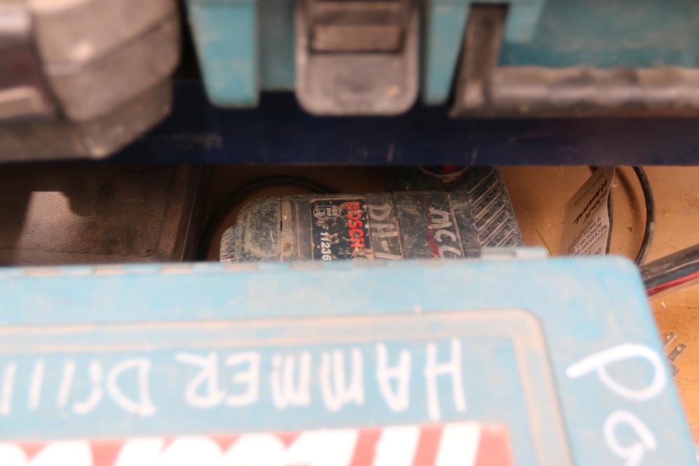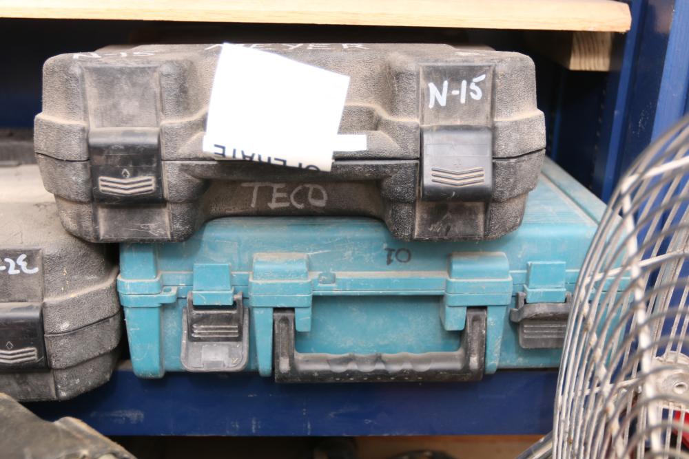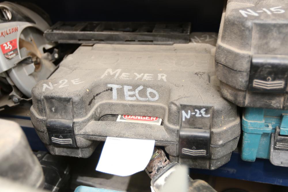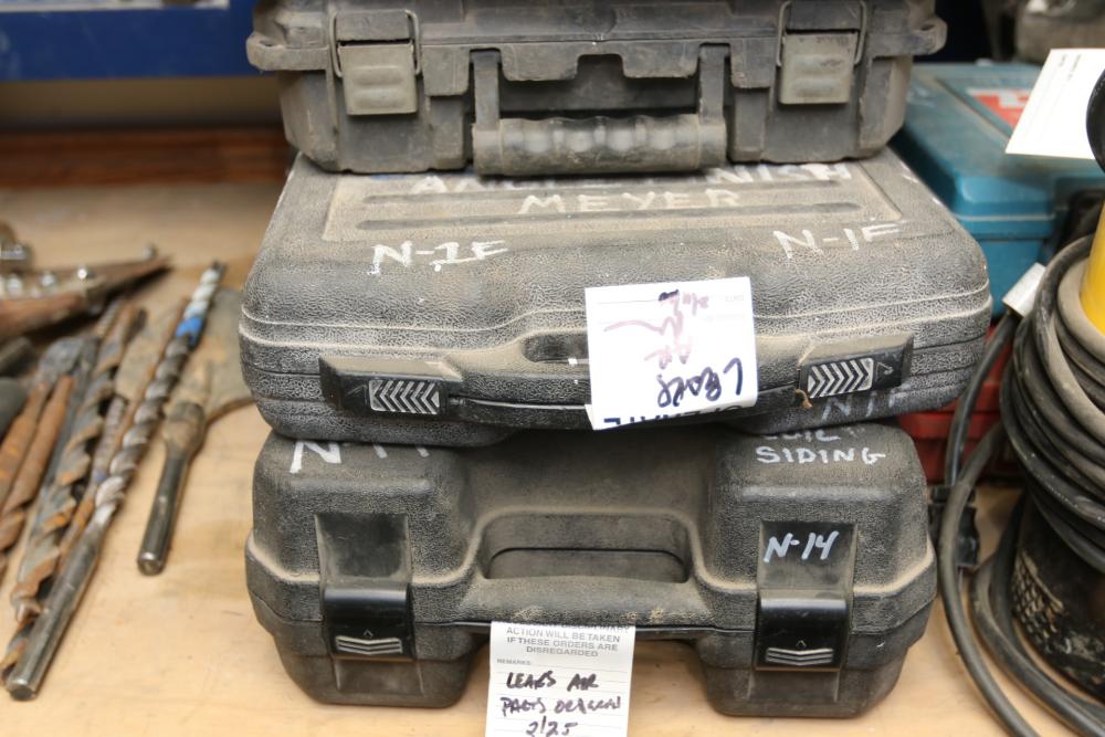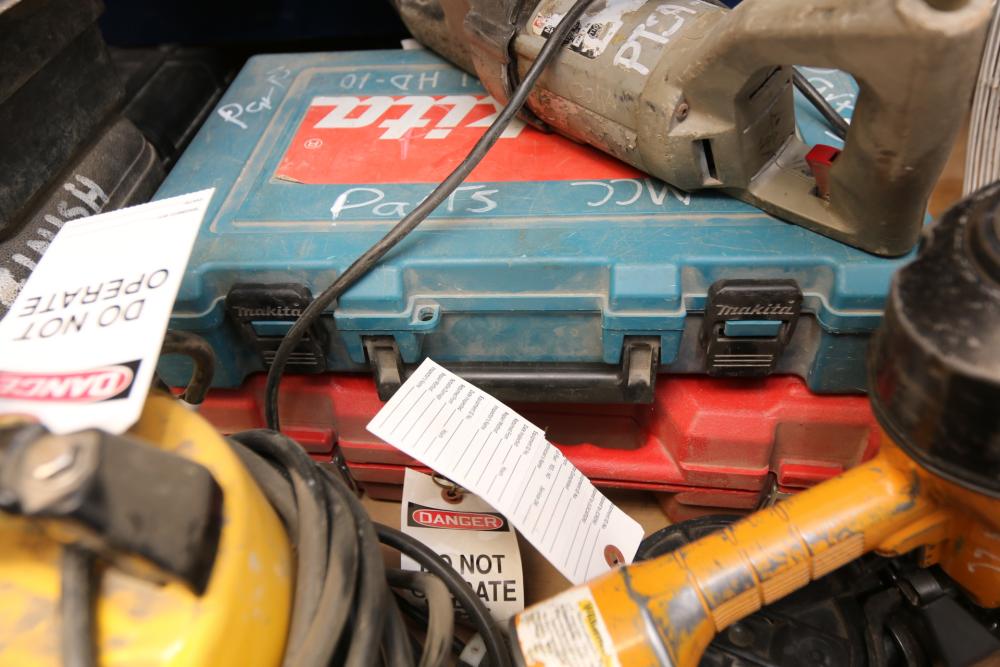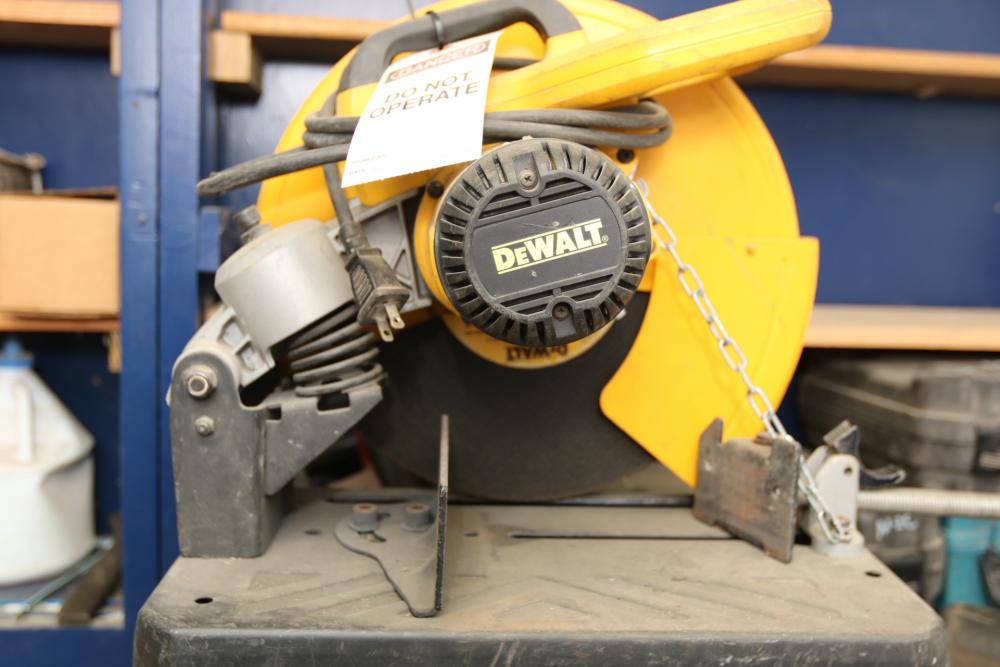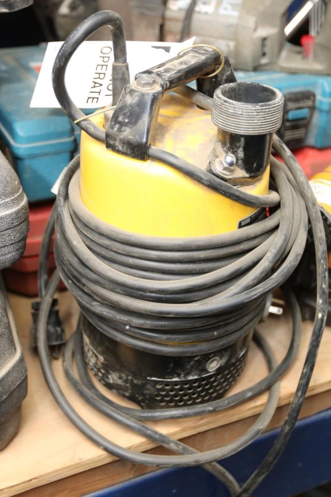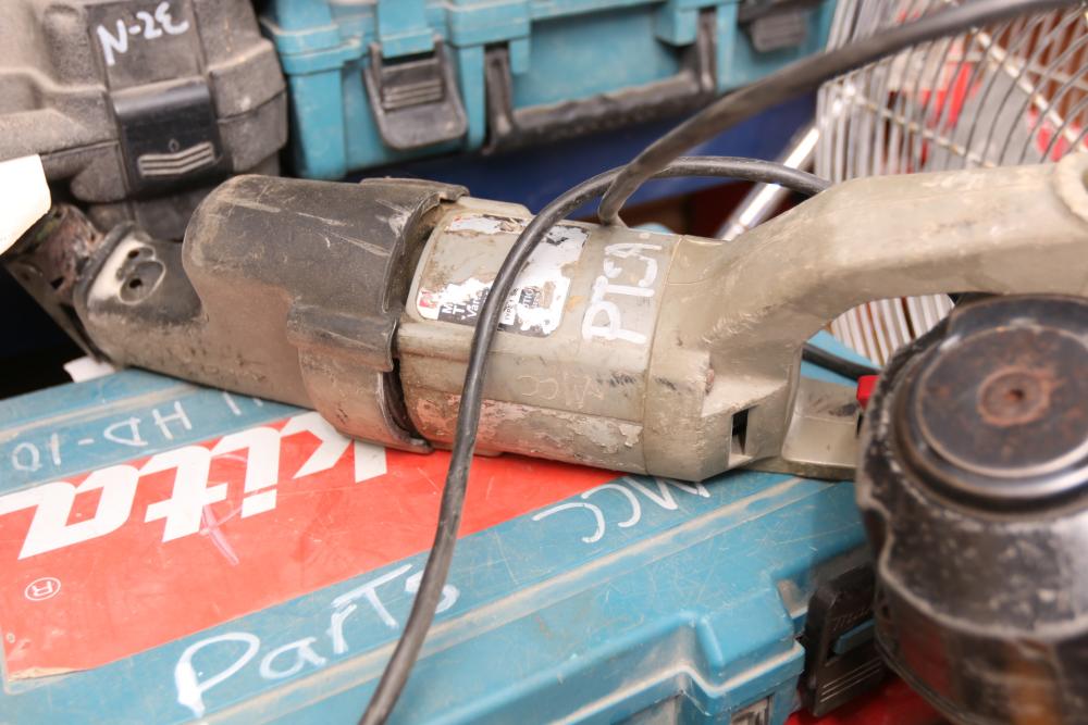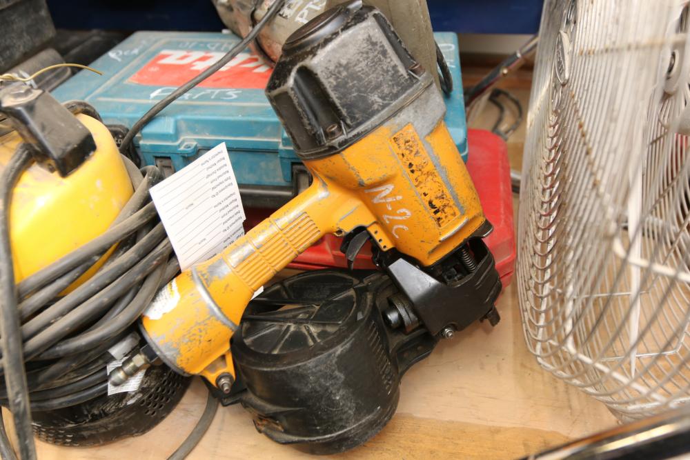 Power tools some incl DeWalt chop saw model D28710 (seller reports bad arbor shakes bad), Bostitch coil nailer missing parts, Wacker Neuson submersible pump model PS2 800, Porter Cable saw-zall 120V, Makita concrete drill model HR2621 (needs wiring), Porter cable nailer (seller reports leaks air), Bostitch coil nailer model N66C (seller reports leaks air), empty DeWalt tool box, etc. All tools for parts or repair.