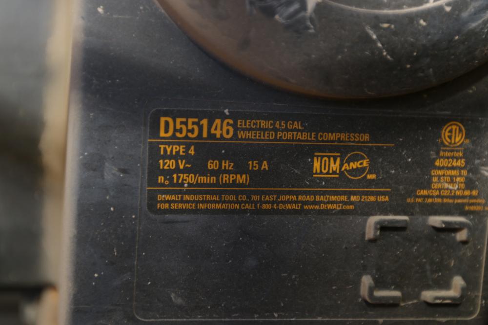 DeWalt 4.5 gallon wheeled portable compressor model D55146, 200psi max, single phase 120V.