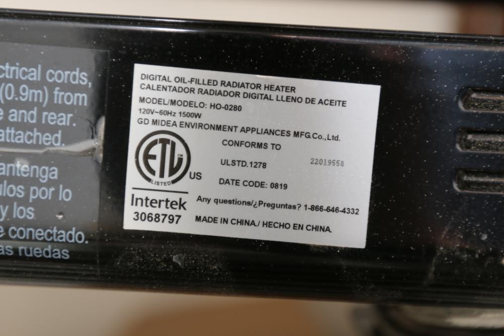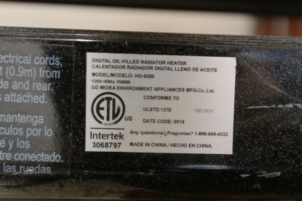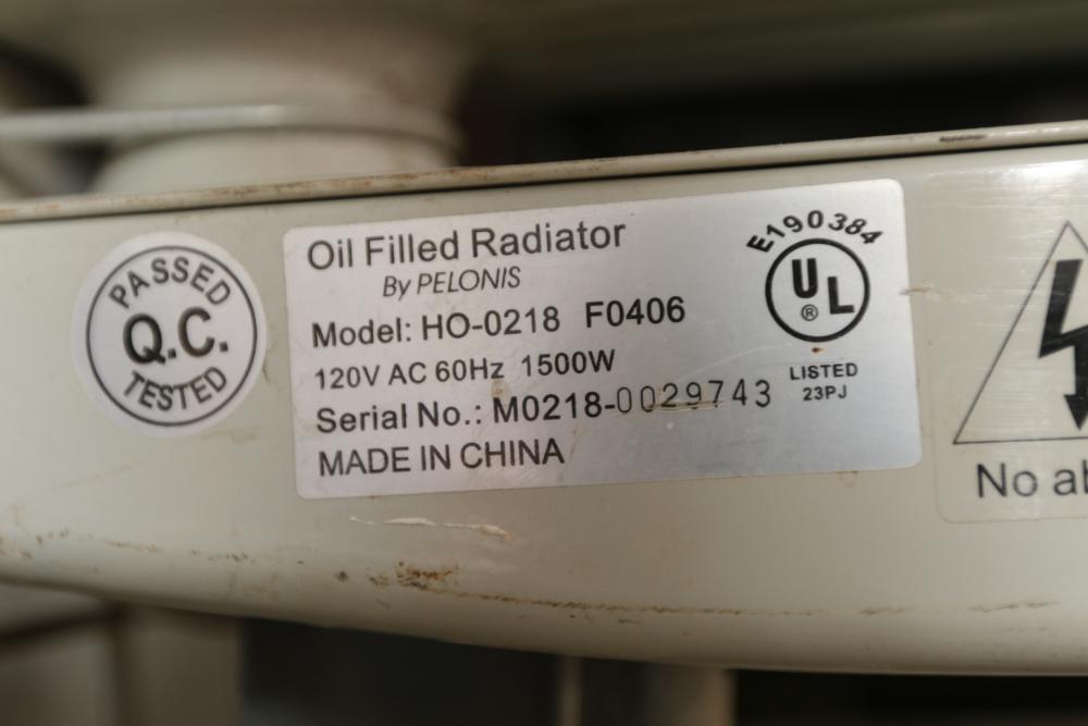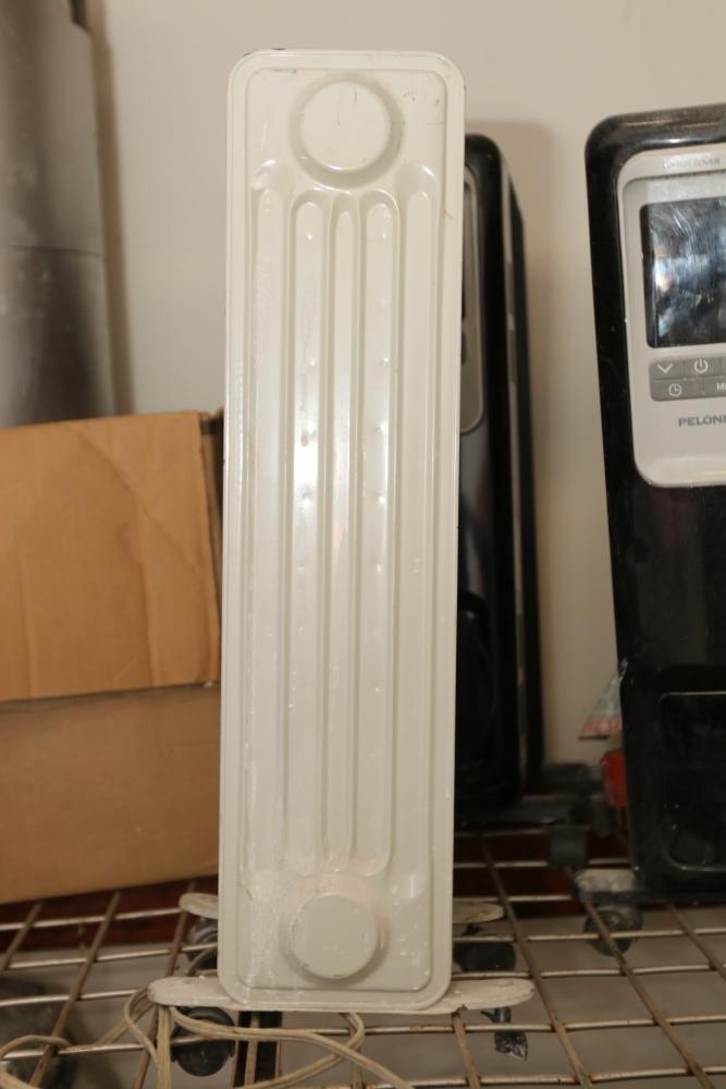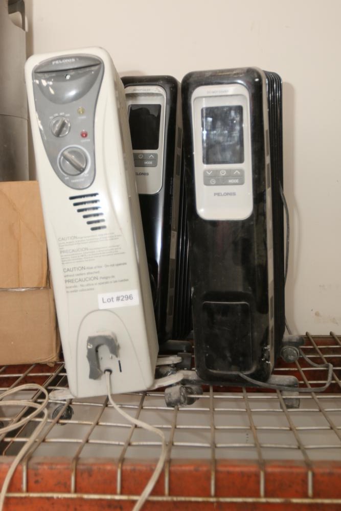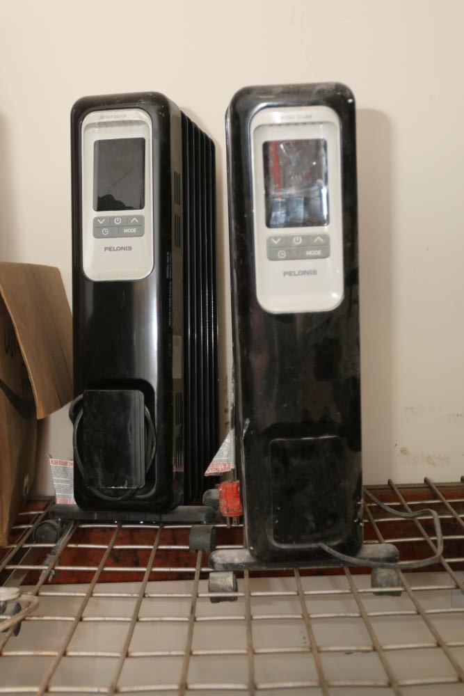 Three electric heaters incl Pelonis model HO-0218 F0406, 1500W, and two Intertek model HO-0280, 1500W.