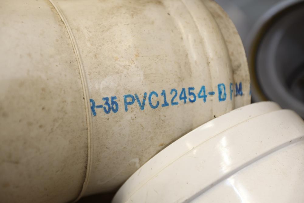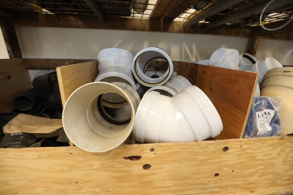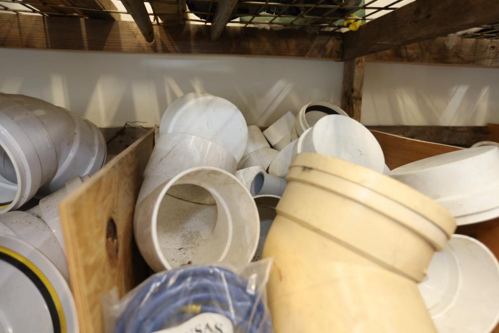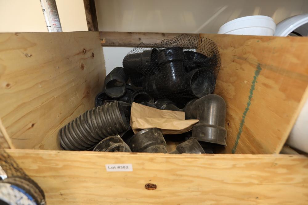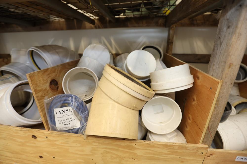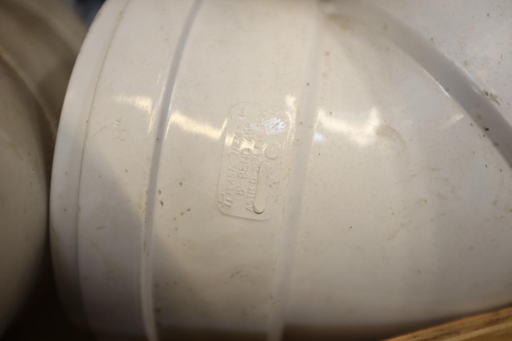 PVC pipe fittings some being 90 degrees, some 45 degrees, some "y's", some openings incl 5", 5.5", 7", 8", 9", 10".