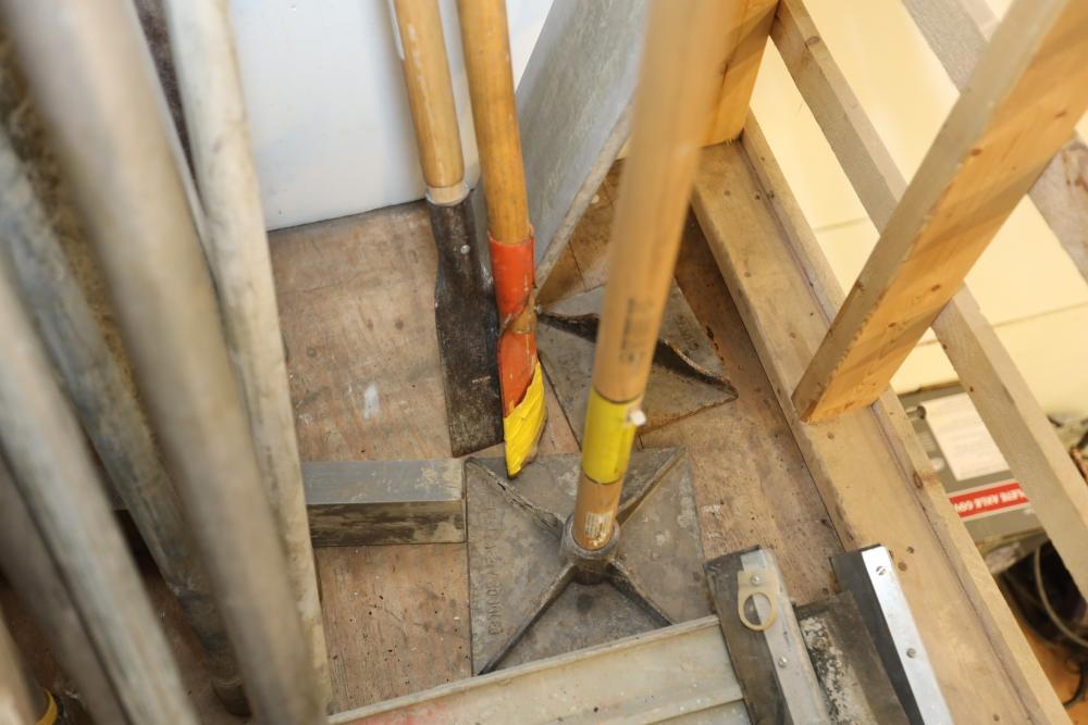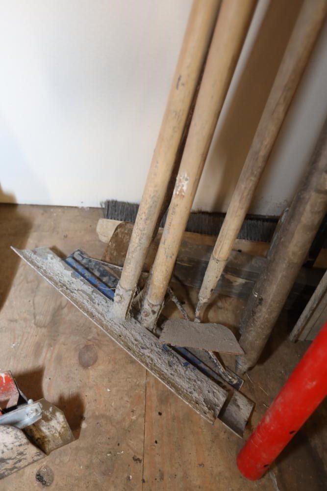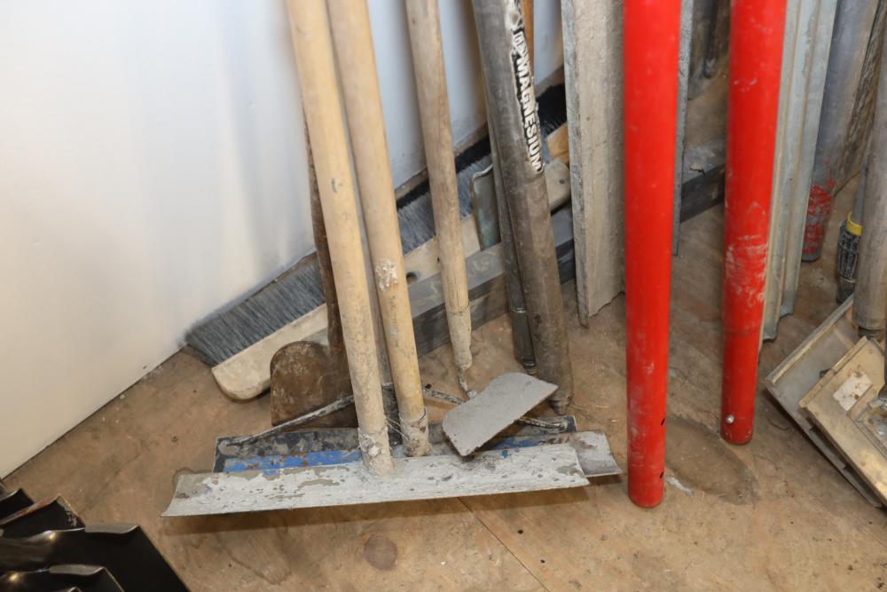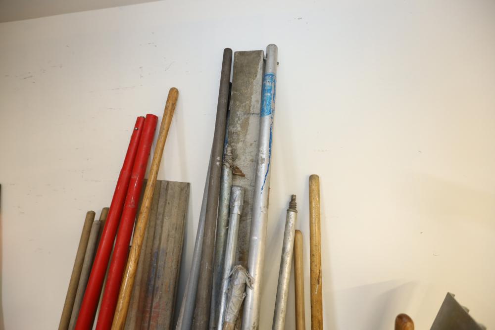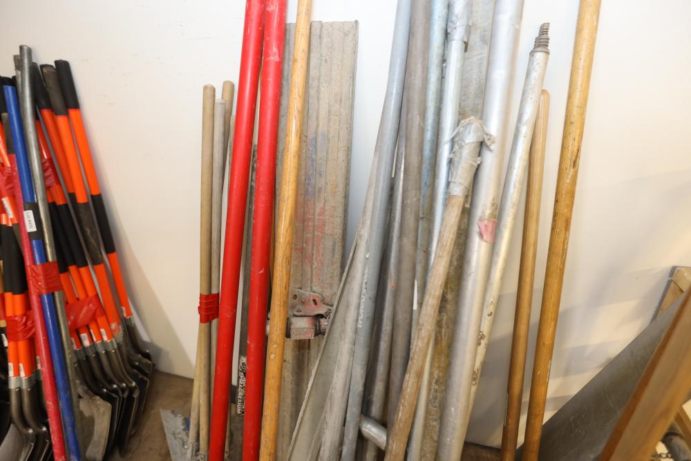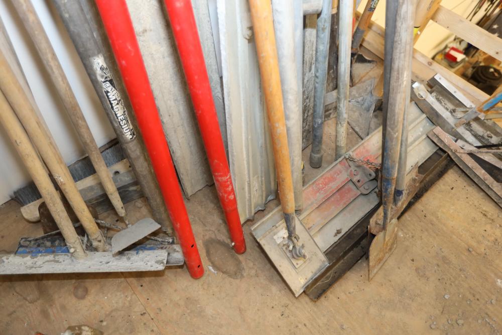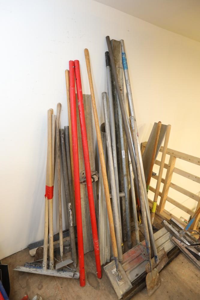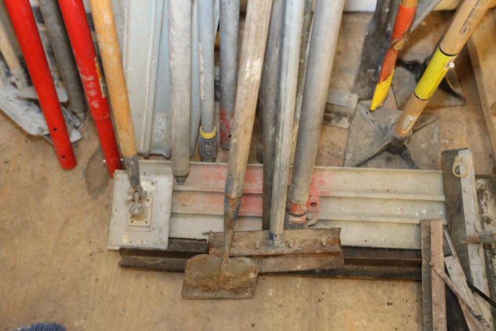 Grouping of concrete tools including floats, scrapers, tampers, brooms, squeegees, etc.