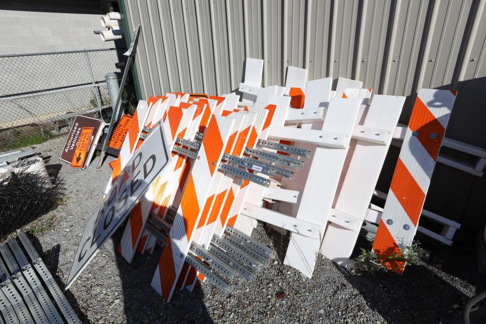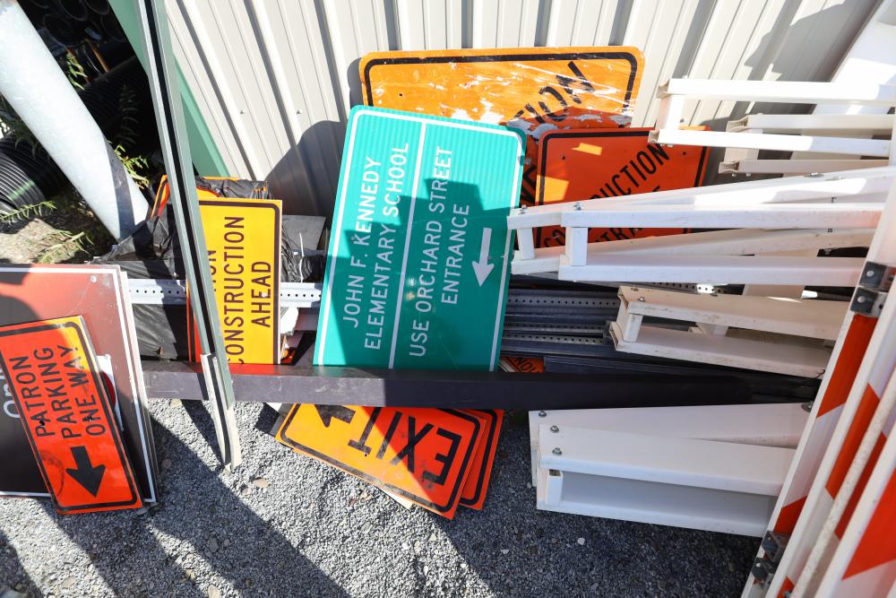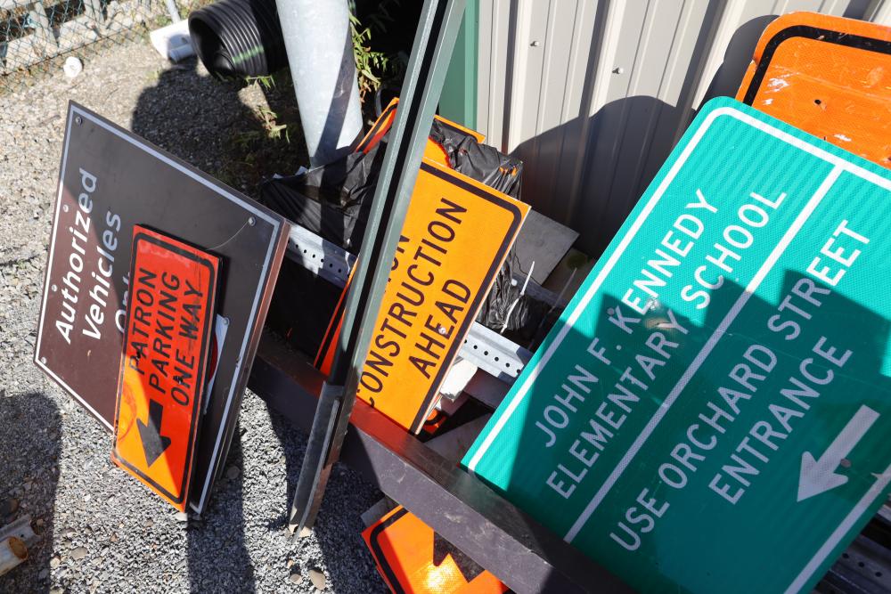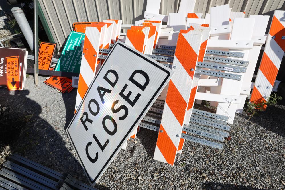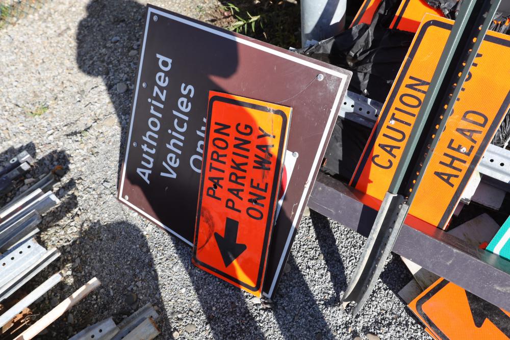 Road signs incl "Road Closed", "Patron Parking One-Way", "Exit", "Authorized Vehicles Only", "Caution Ahead", "Emergency and Authorized Vehicles Only", "Caution Construction Ahead", etc.