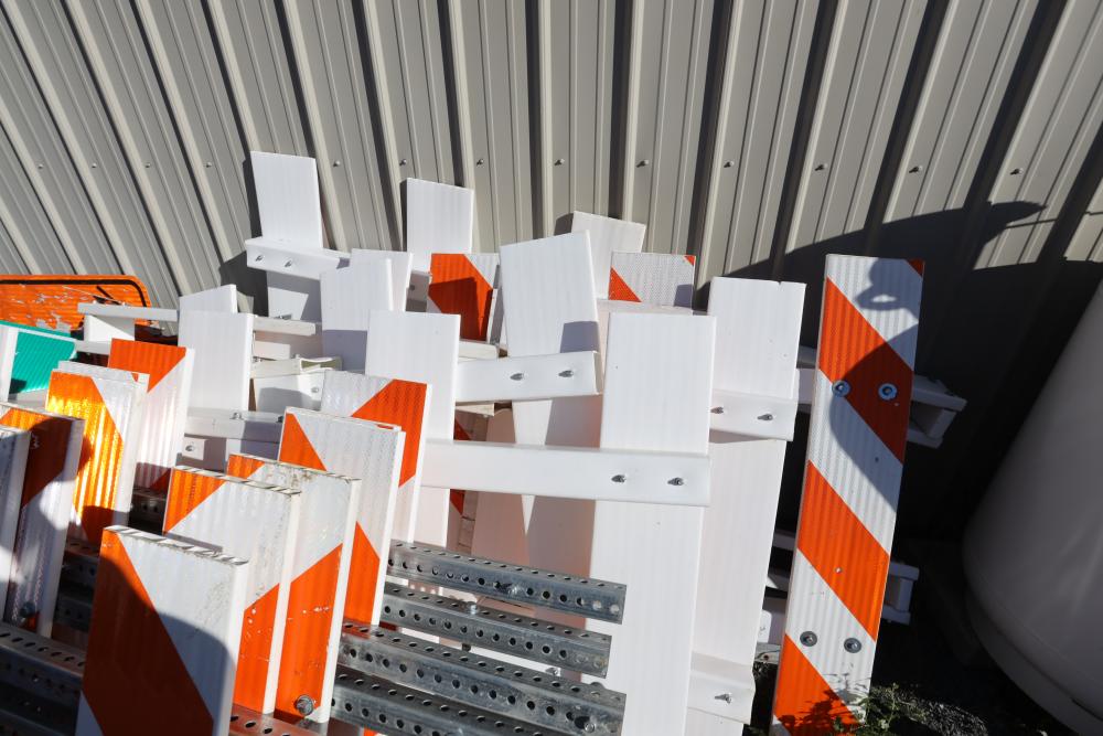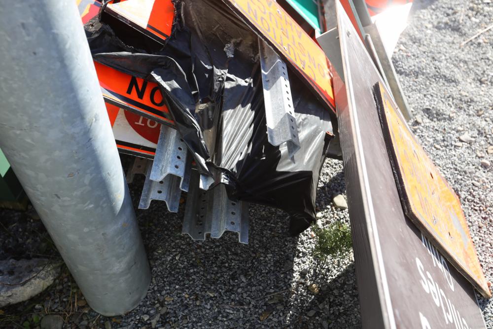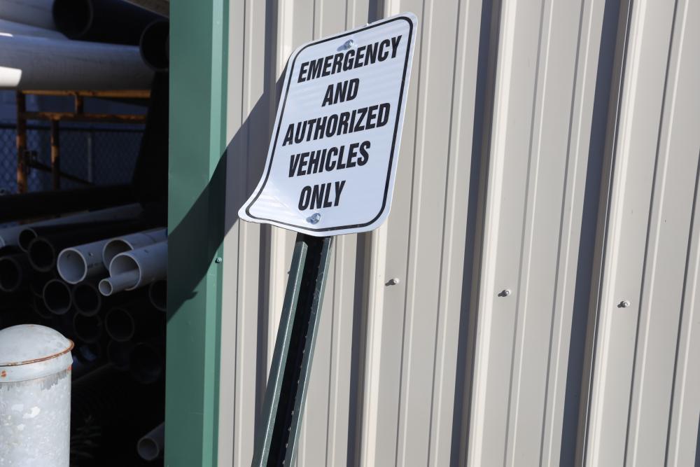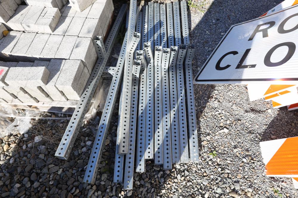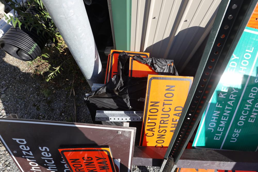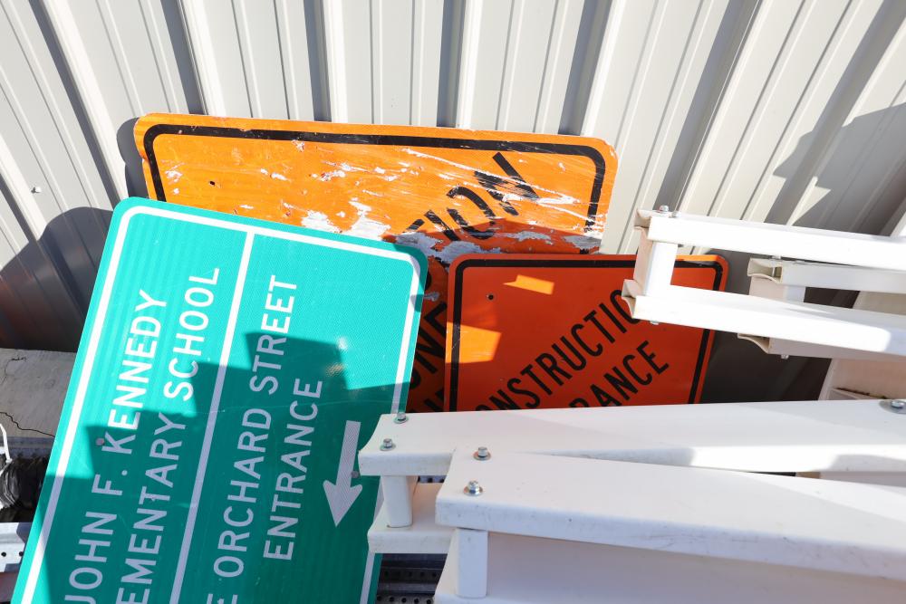 Road signs incl "Road Closed", "Patron Parking One-Way", "Exit", "Authorized Vehicles Only", "Caution Ahead", "Emergency and Authorized Vehicles Only", "Caution Construction Ahead", etc.
