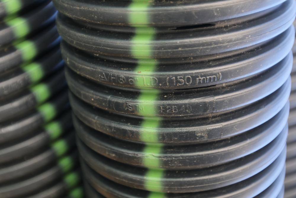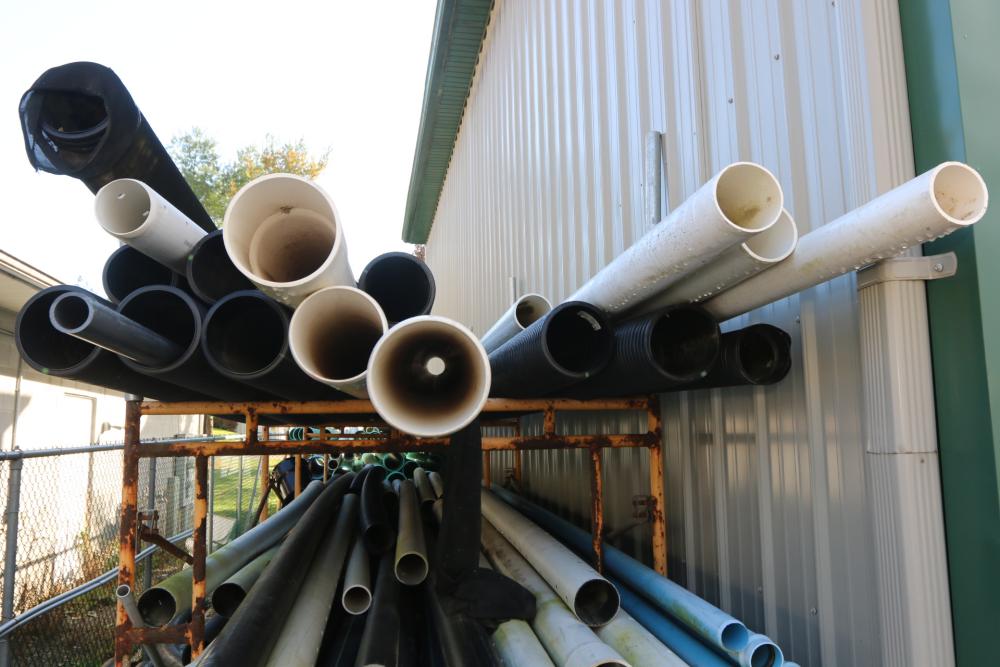 Various length and dia French drain pipe hose, and pvc pipe, smallest being 2"dia, largest dia being 6.5", largest pipe measuring approx. 242"L.