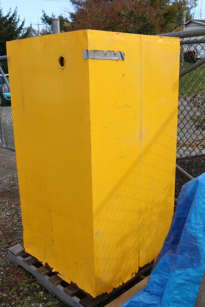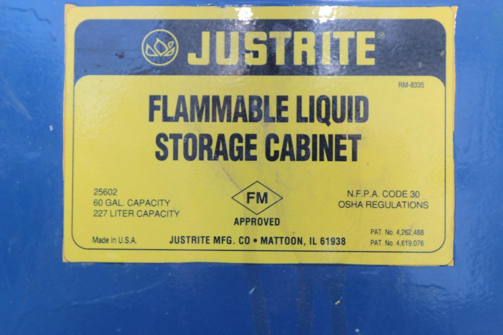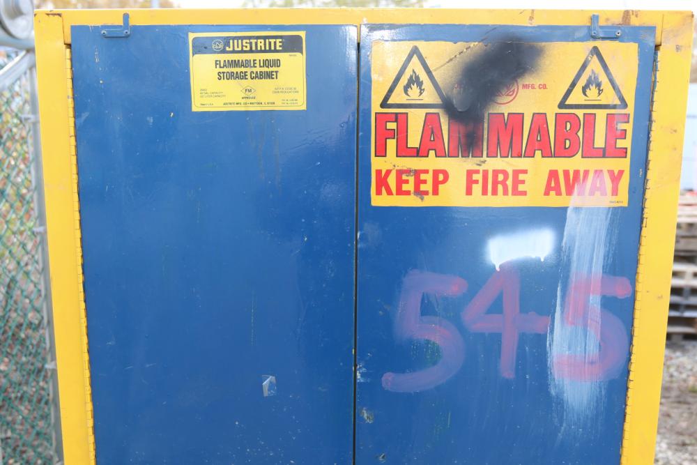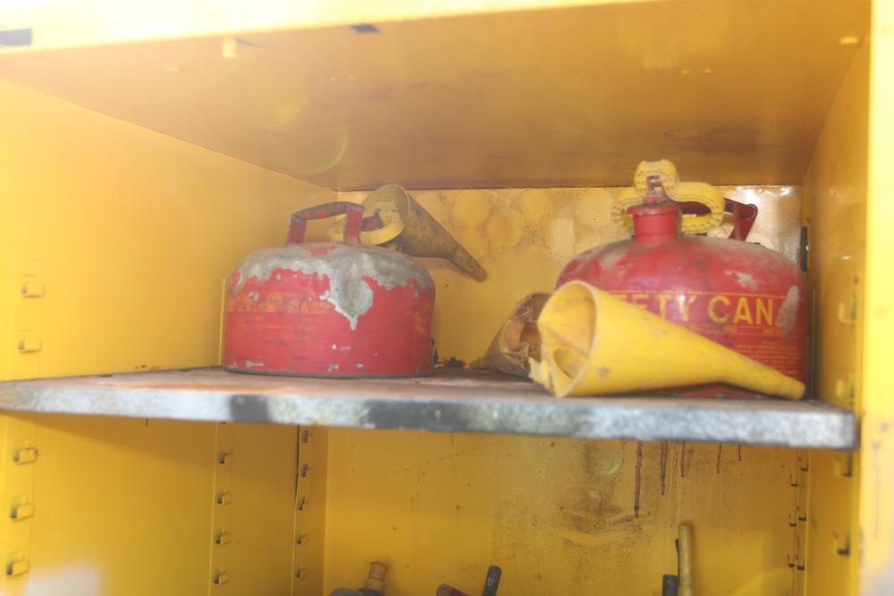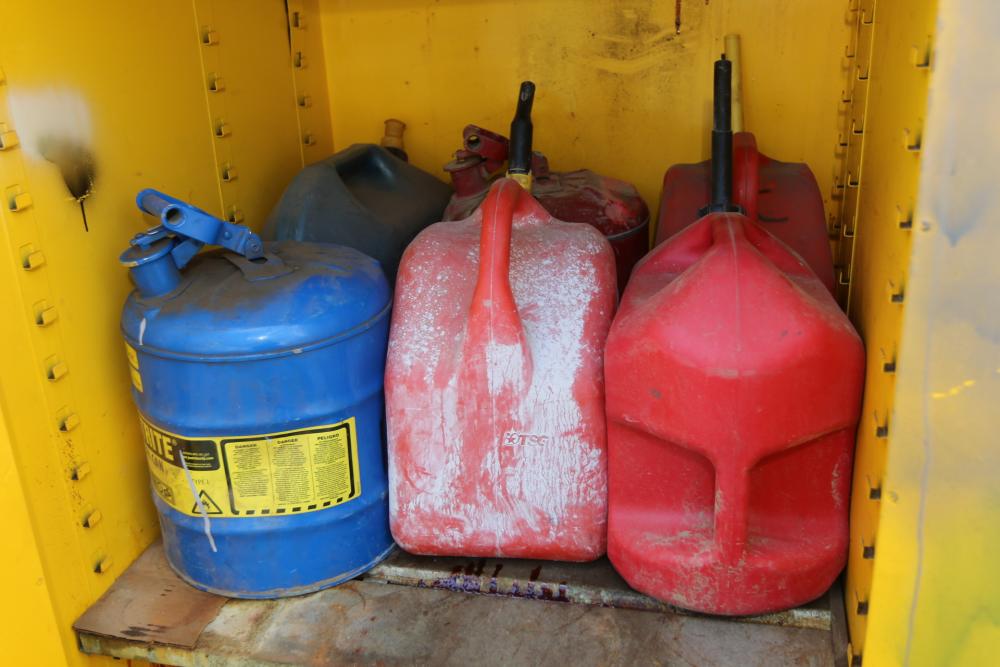 Justrite flammable liquid storage cabinet model RM-8335 60Gal capacity, 34" X 34" X 65"T, also incl gas cans incl metal and plastic.