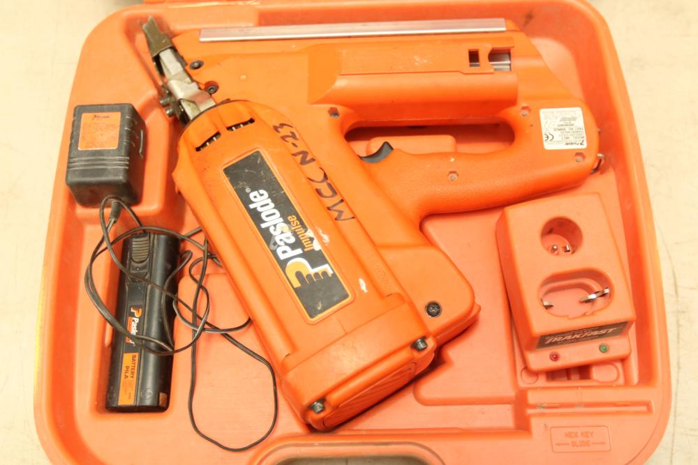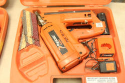 Paslode Impulse battery powered cordless utility framing nailer model IMCT with one battery, charger, and plastic case.
