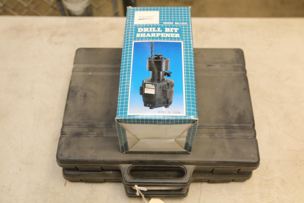 Drill Sharpener model 15206, 100~120V 1/10Hp, also incl drill bits in cases, one appearing to be complete.