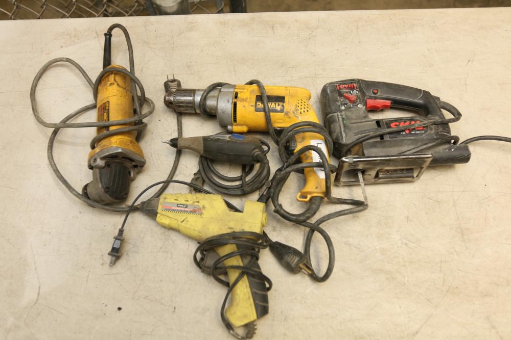 Corded power tools incl Stanley contractor grade glue pro glue gun GR100, Dremel engraver, Skil Jig saw model 4470, DeWalt 1/2" VSR drill model 235G, Dewalt 4-1/2" angle grinder model D28110.