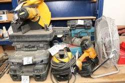 Power tools some incl DeWalt chop saw model D28710 (seller reports bad arbor shakes bad), Bostitch coil nailer missing parts, Wacker Neuson submersible pump model PS2 800, Porter Cable saw-zall 120V, Makita concrete drill model HR2621 (needs wiring), Porter cable nailer (seller reports leaks air), Bostitch coil nailer model N66C (seller reports leaks air), empty DeWalt tool box, etc. All tools for parts or repair.
