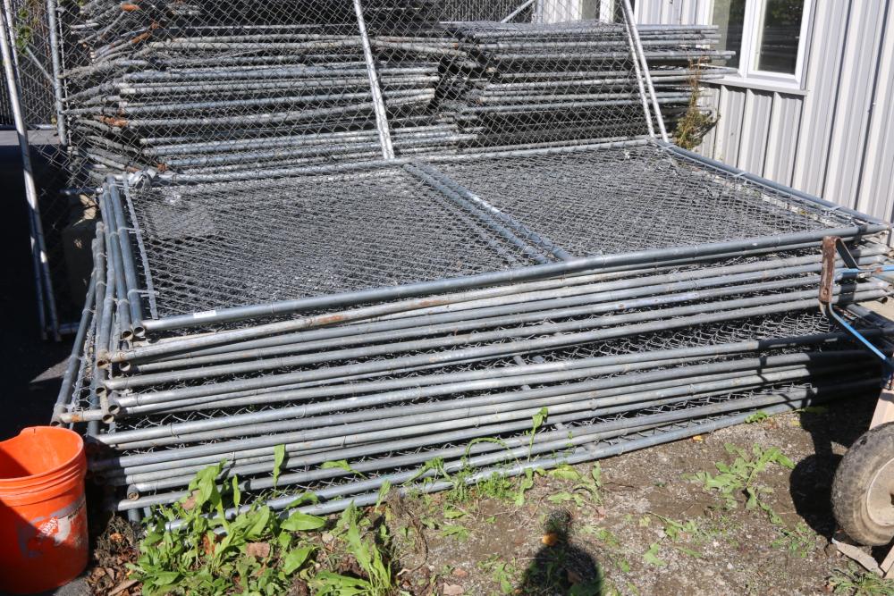 Approx. 120 pieces of temporary chain link fence panels, most 10' x 6' tall, two appear to be 12' x 6' tall, also including bases, weights, connectors, etc.