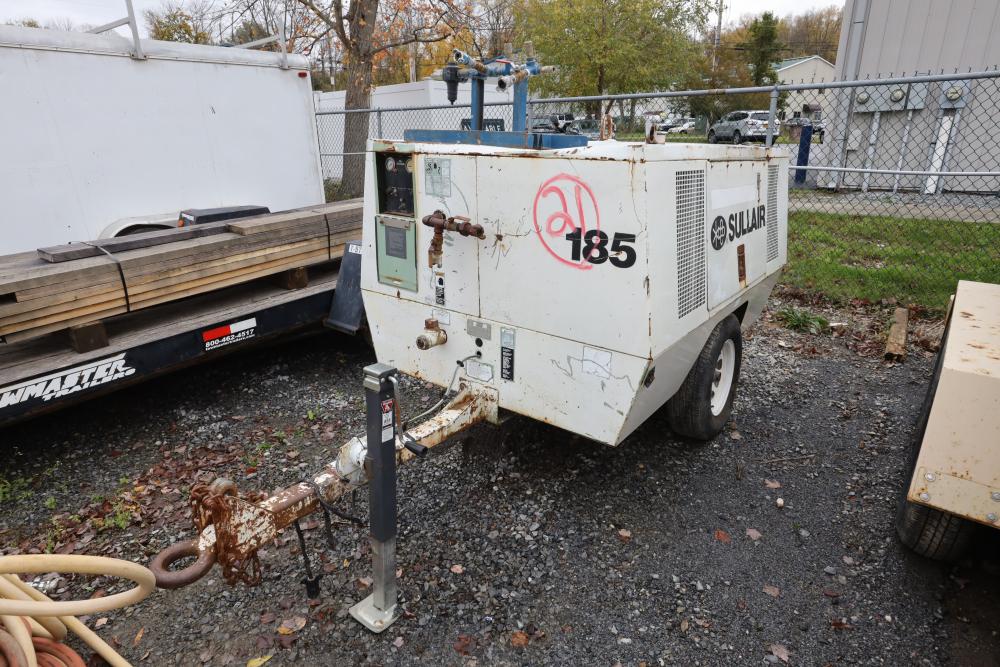 Sullair tow behind air compressor model 185 DPQ JD, with a pintle hitch, 100/125 PSIG, hour meter reading 1419 at time of photography, also incl pallet of various length air hoses some measuring 3/4".