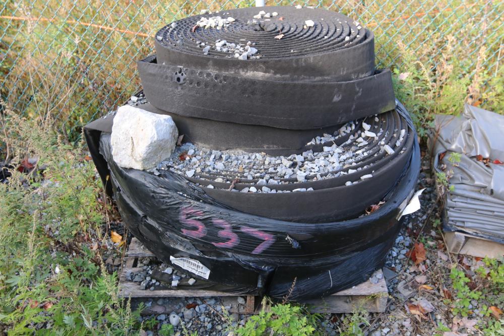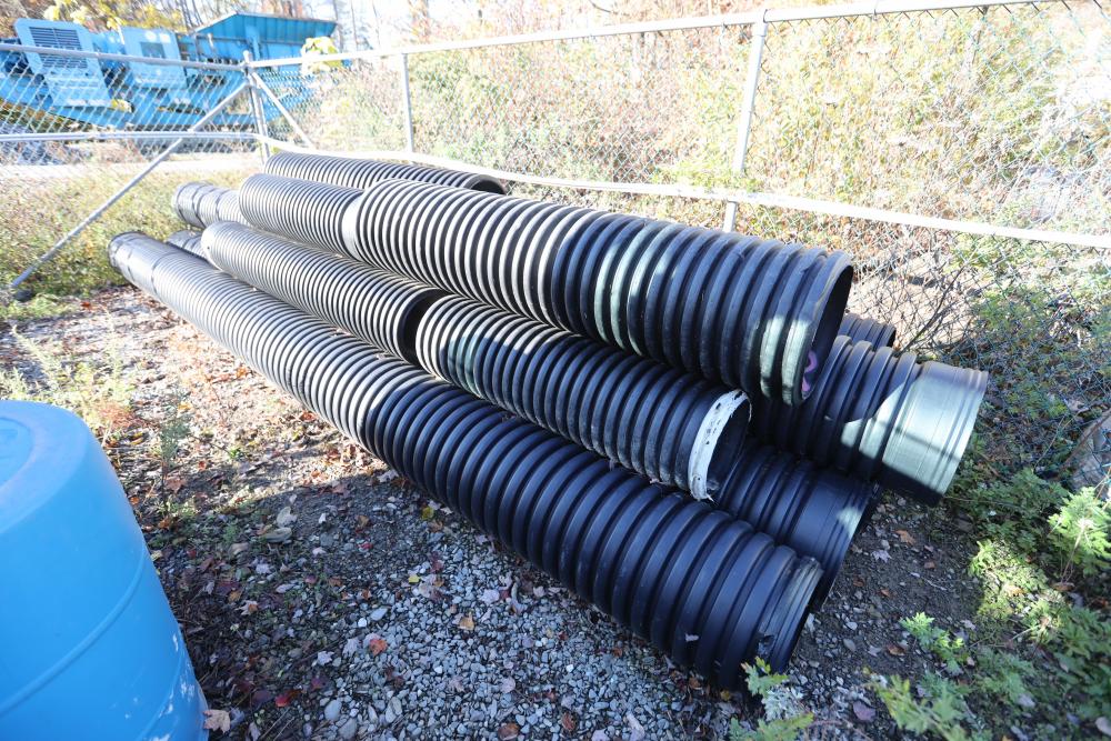 Various length and dia French drain pipe hose, and pvc pipe, smallest being 5"dia, largest dia being 12", largest pipe measuring approx. 245"L.