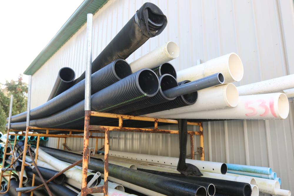 Various length and dia French drain pipe hose, and pvc pipe, smallest being 2"dia, largest dia being 6.5", largest pipe measuring approx. 242"L.