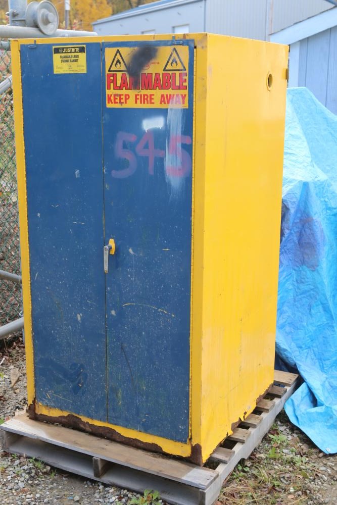 Justrite flammable liquid storage cabinet model RM-8335 60Gal capacity, 34" X 34" X 65"T, also incl gas cans incl metal and plastic.