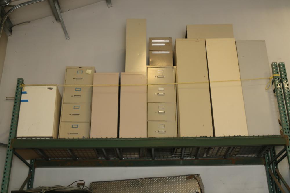Grouping of metal filing cabinets varying in sizes, also incl plastic, vinyl, and metal folding chairs.