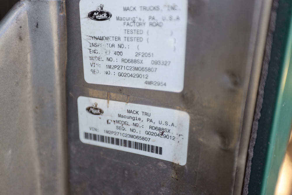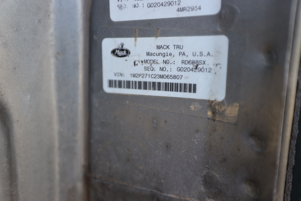 2003 Mack RD688SX Tandem Truck. VIN: 1M2P271C23M065807. Mileage: 240051. Starts and moves, Rust. Asset#: 220P20.