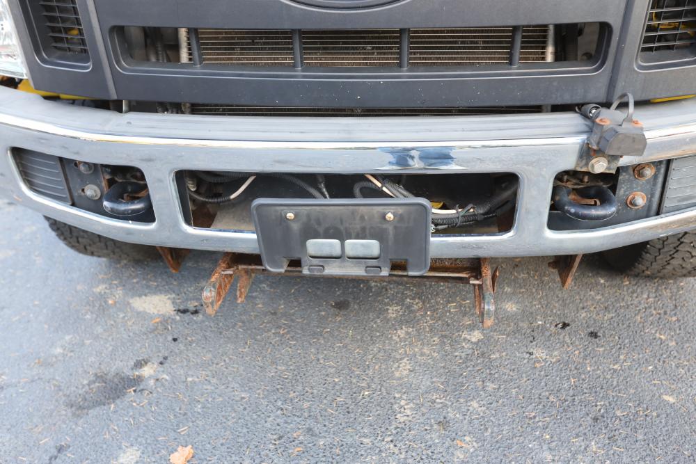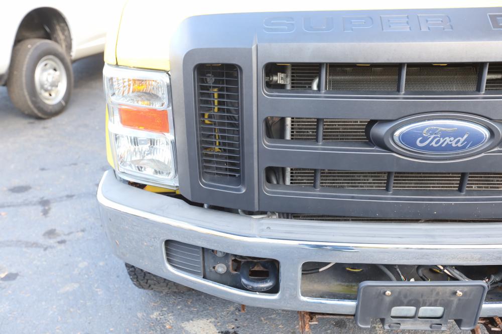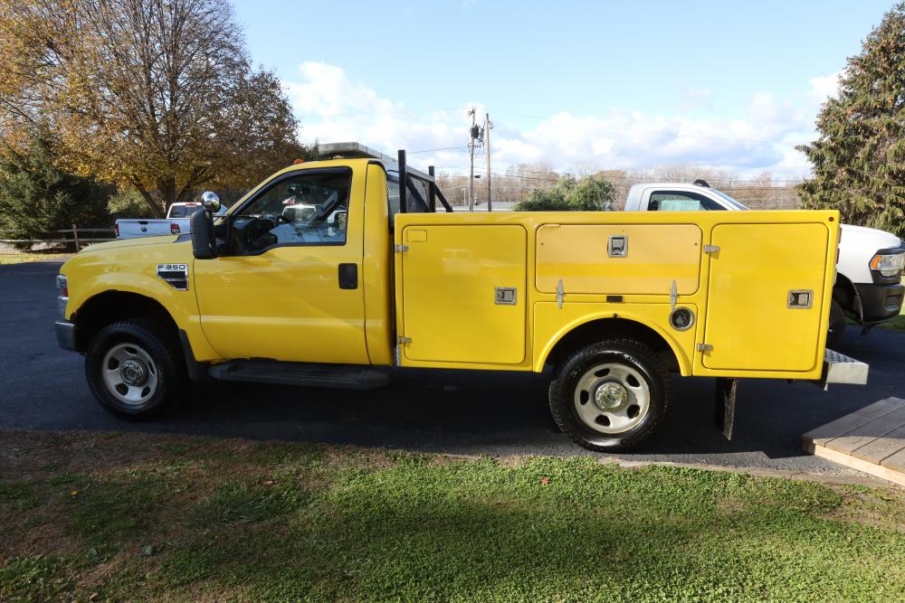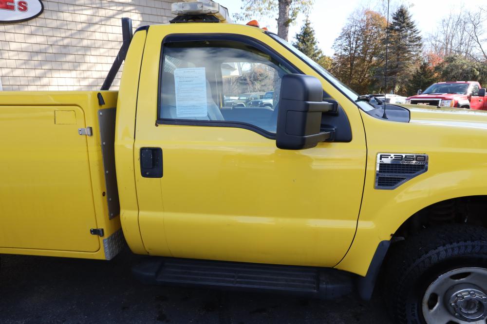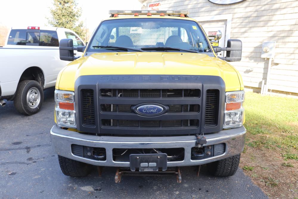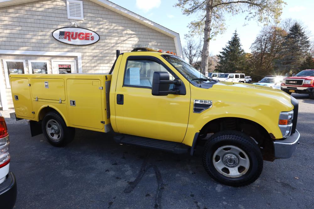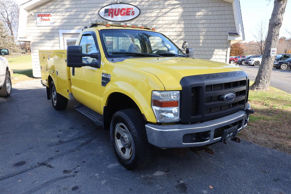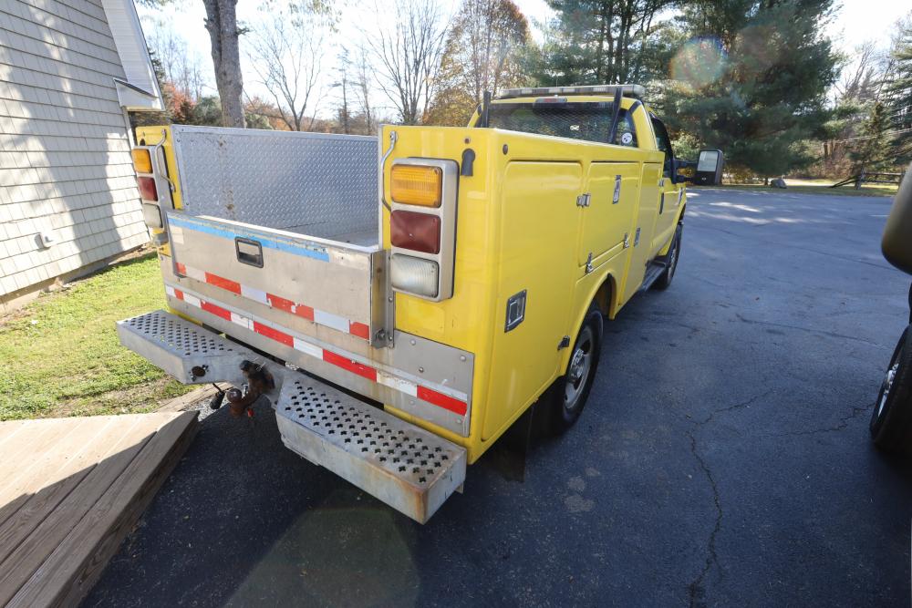 2008 Ford F-350 XL Super Duty 4x4 regular cab pickup truck with 6.8L Triton V10 cylinder gas engine, automatic transmission. VIN number: 1FDSF35Y68EC18851. Leather interior, manual windows, heat, A/C, AM/FM radio, plow frame and controller, brake force brake controller, fiberglass Brandfx service body with compartments, two Craftsman tool boxes model CMST98088R.0, bed lined with diamond plate, headache rack, mounted light bar, spot light. Odometer reading 137242. Spot light and passenger side lower mirror glass broken. Title and key available. Transfer will be handled through an MV-50.