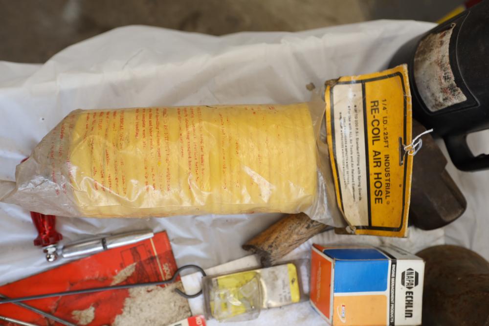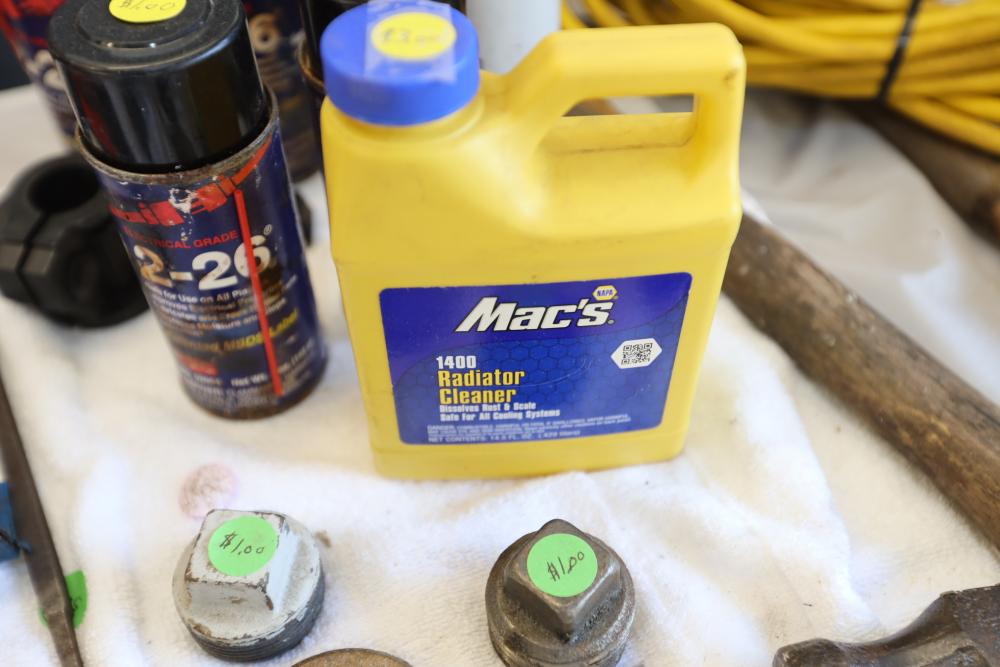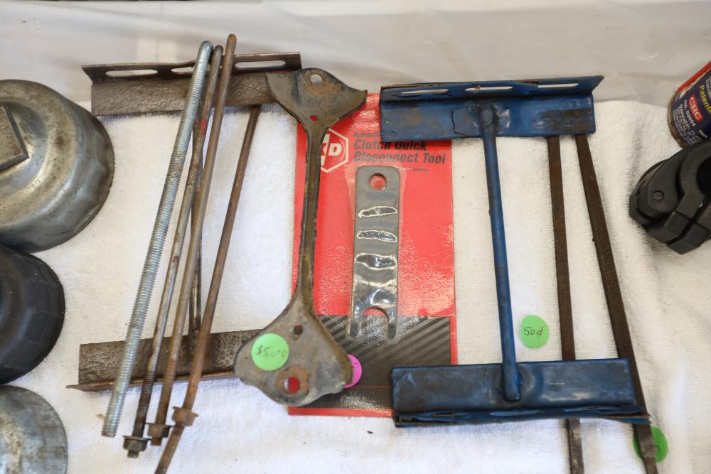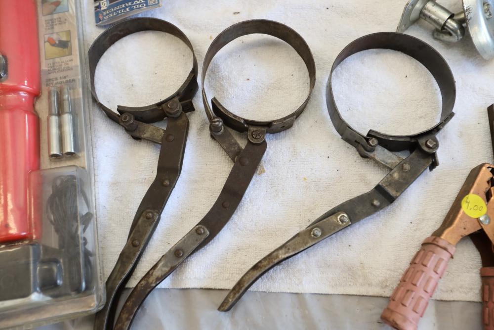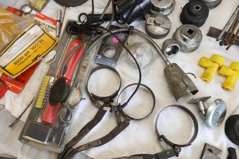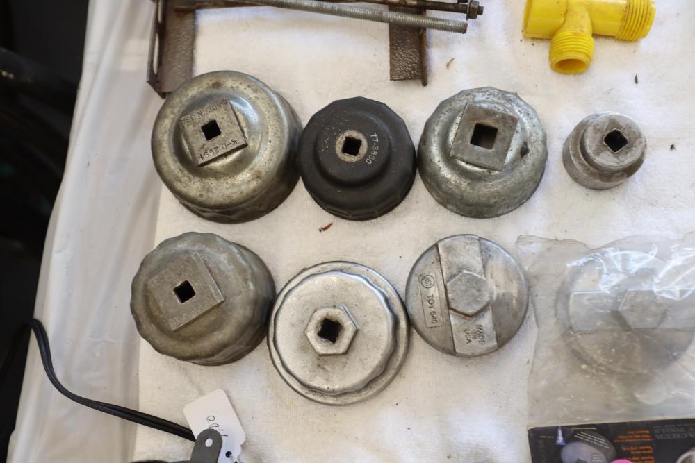 Automotive tools including hammers, sockets, oil filter sockets, digital pressure gauge, KD tools rear main bearing seal installer and removal set, GM rear brake spring tool, vintage tool box, water jug, etc.