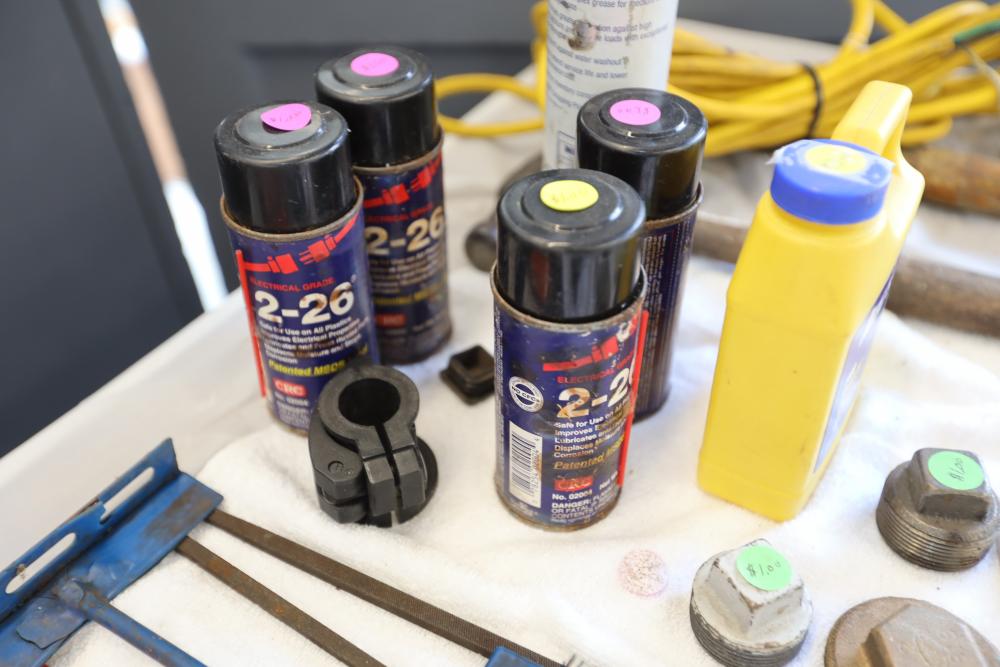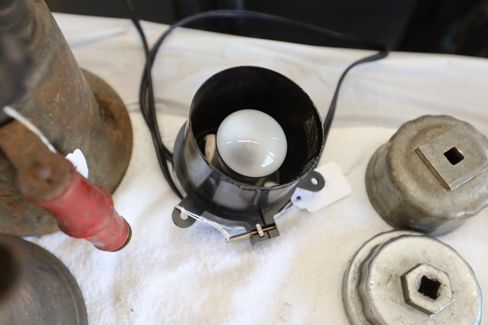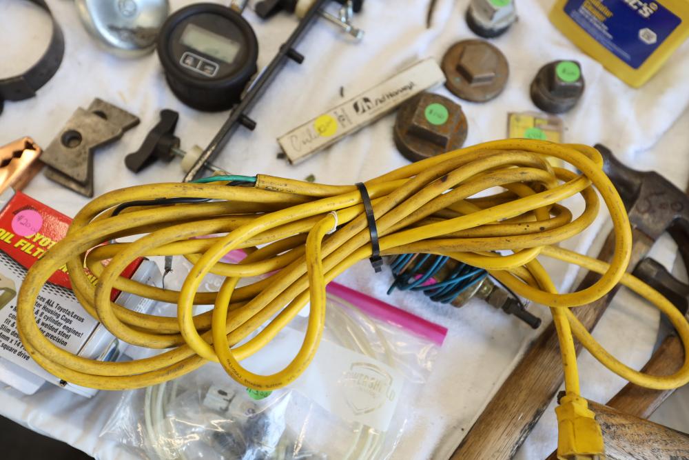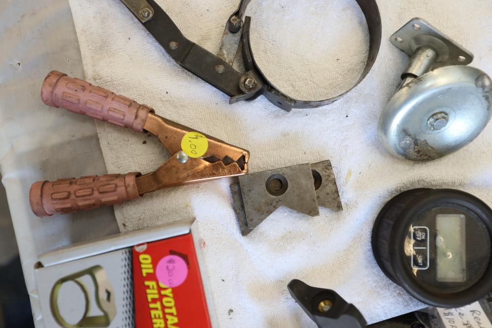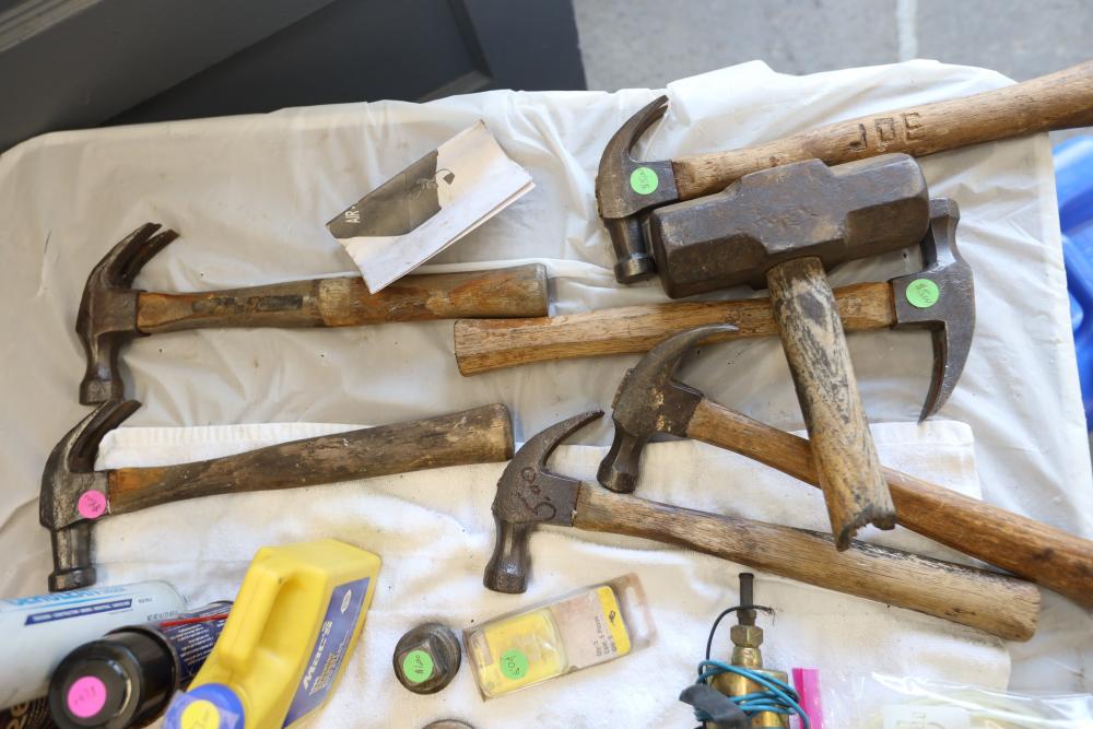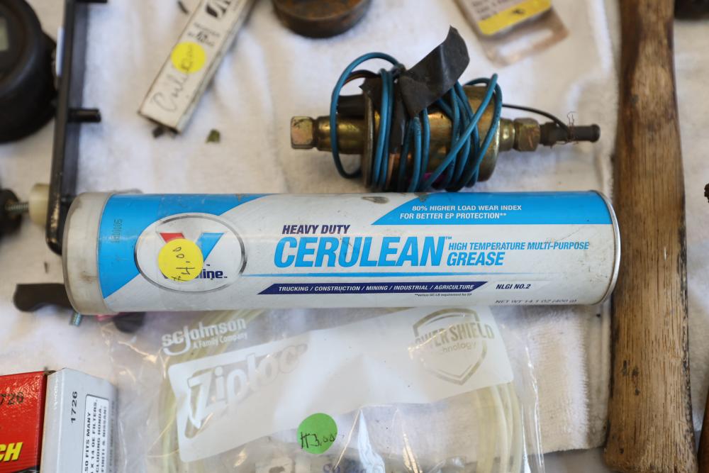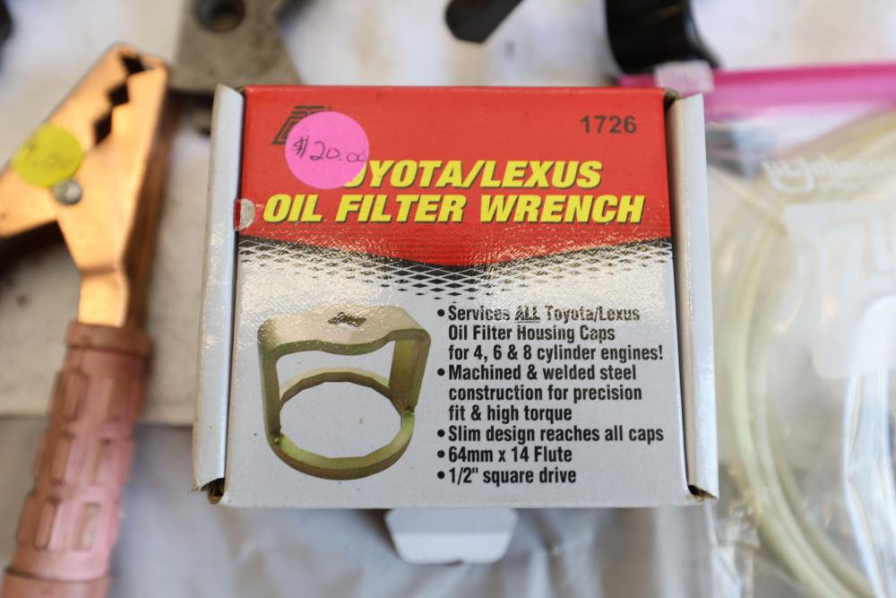 Automotive tools including hammers, sockets, oil filter sockets, digital pressure gauge, KD tools rear main bearing seal installer and removal set, GM rear brake spring tool, vintage tool box, water jug, etc.