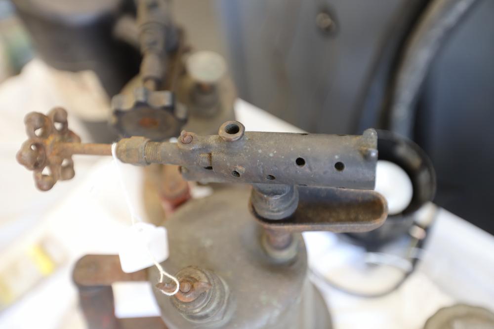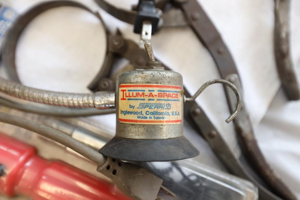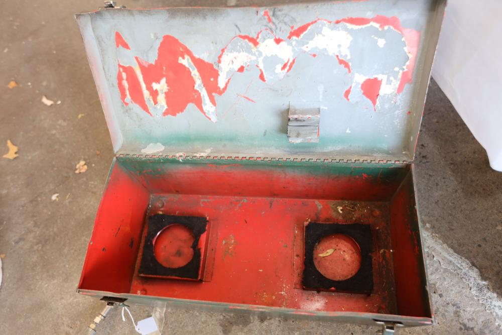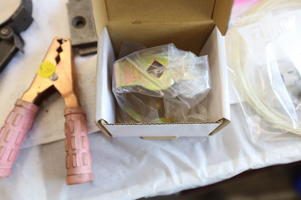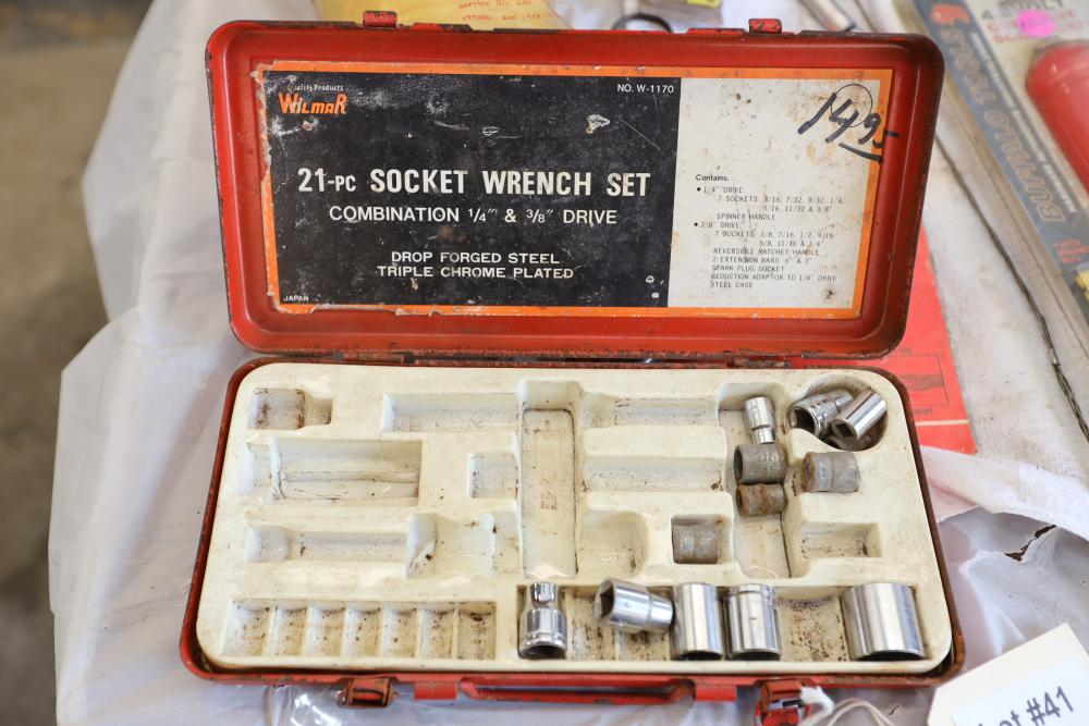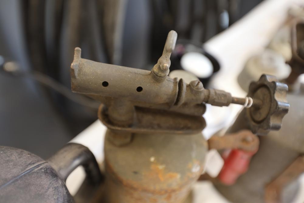 Automotive tools including hammers, sockets, oil filter sockets, digital pressure gauge, KD tools rear main bearing seal installer and removal set, GM rear brake spring tool, vintage tool box, water jug, etc.