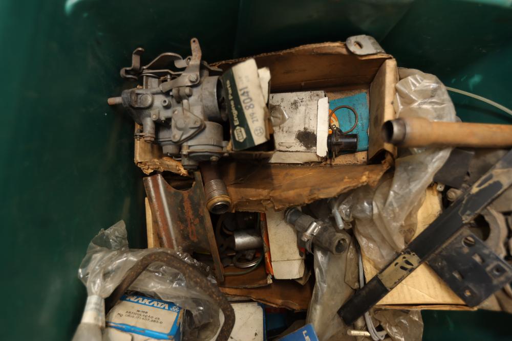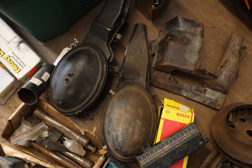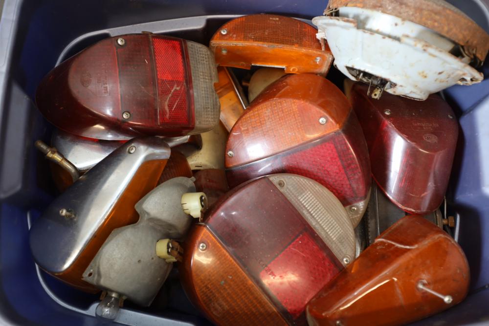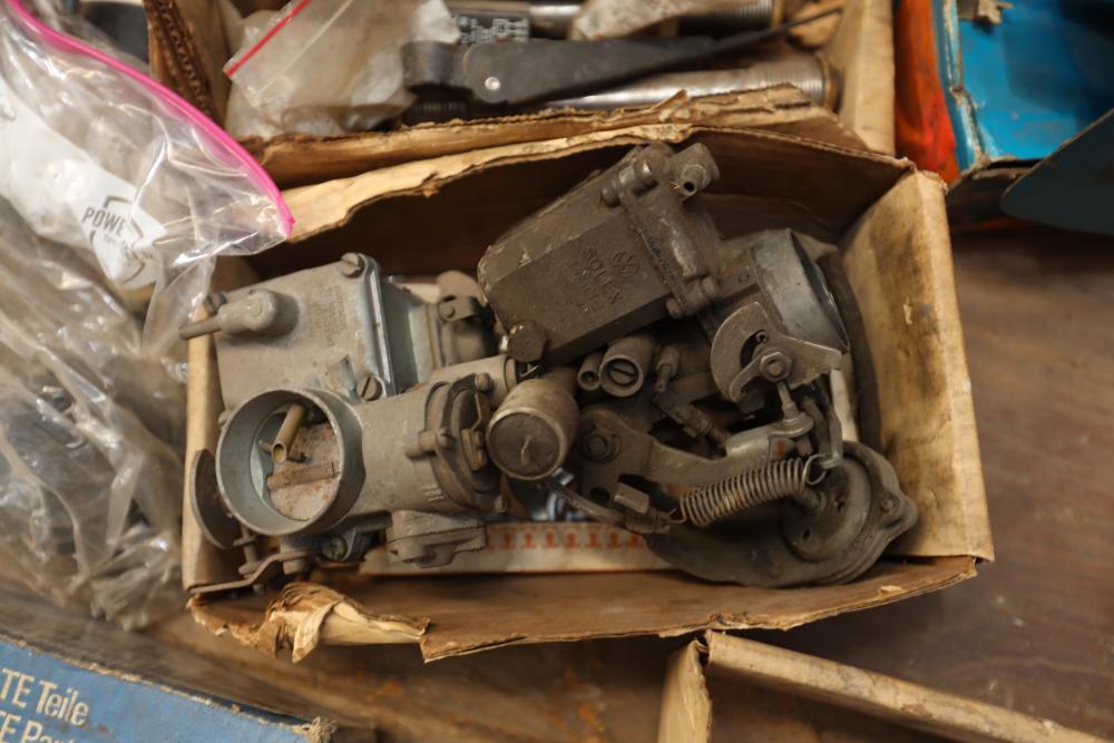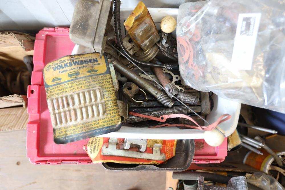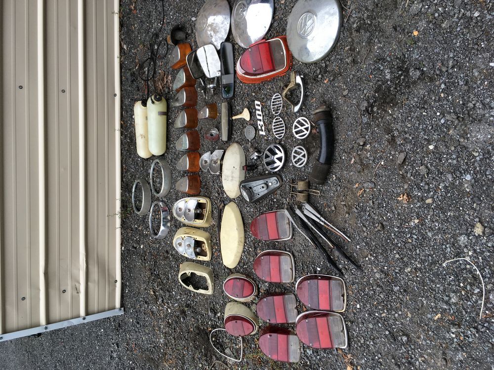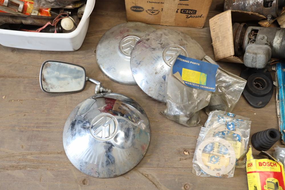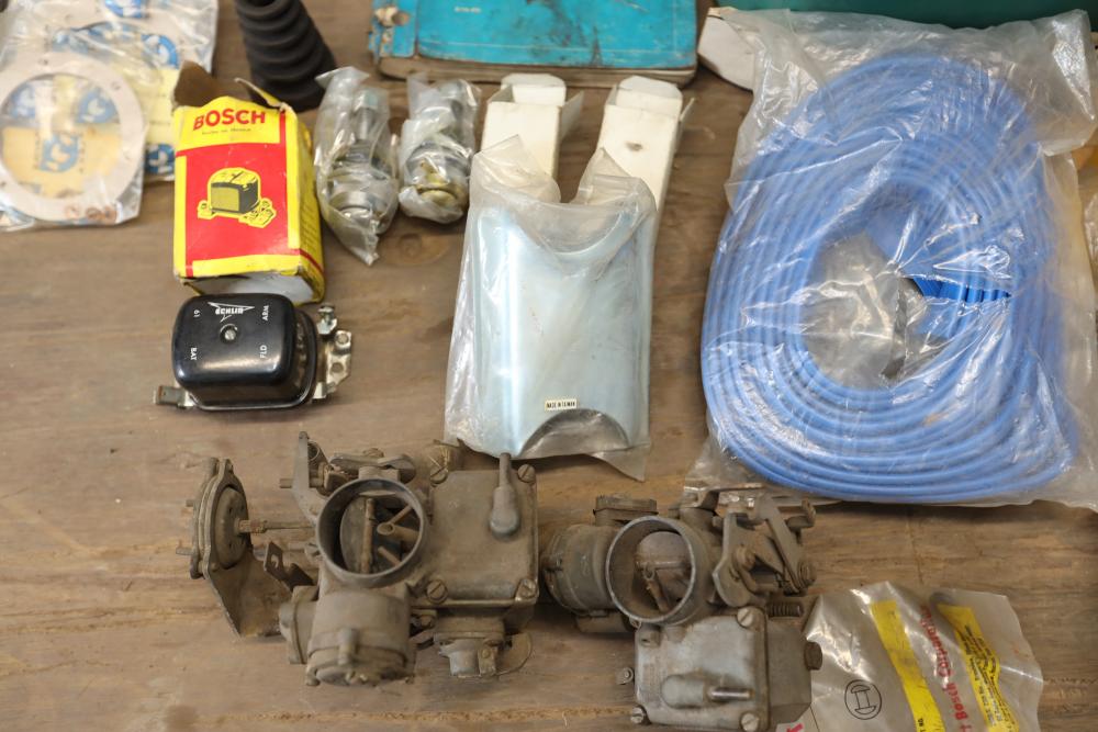 Assorted air cooled Volkswagen new and used car parts including headlights, bezels, numerous tail lights, hood, deck lid, seats, airboxes, heavy duty radial tuned shock absorbers, carburetors, fuse box, fender beading kit, engine stand, Audi/Volkswagen Globe replacement parts manual, many late and older model marker lights, master cylinder, electrical parts, hoses, fuses, engine parts, gaskets, left front fender complete with lights, etc. Buyer must take all.