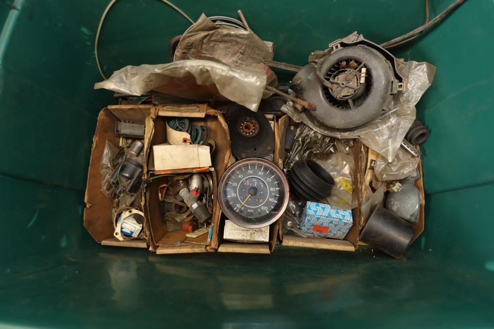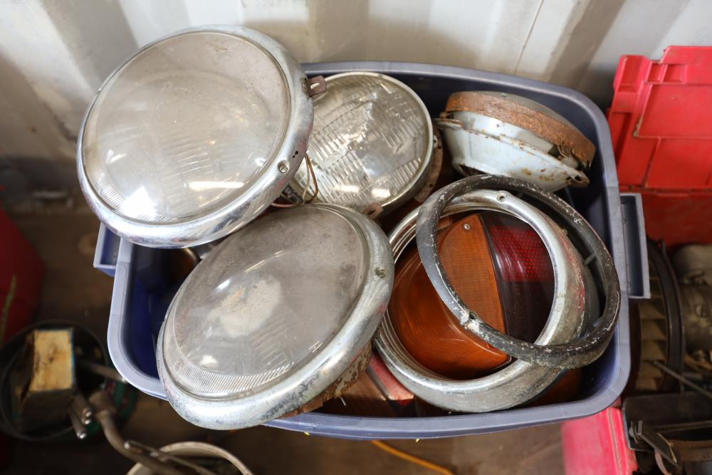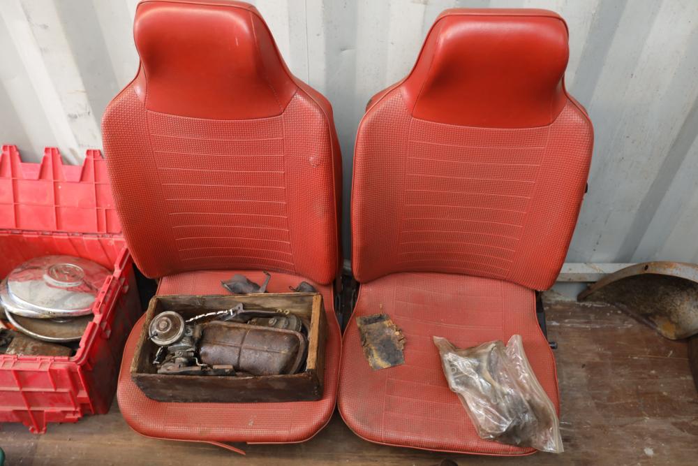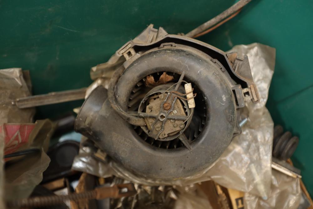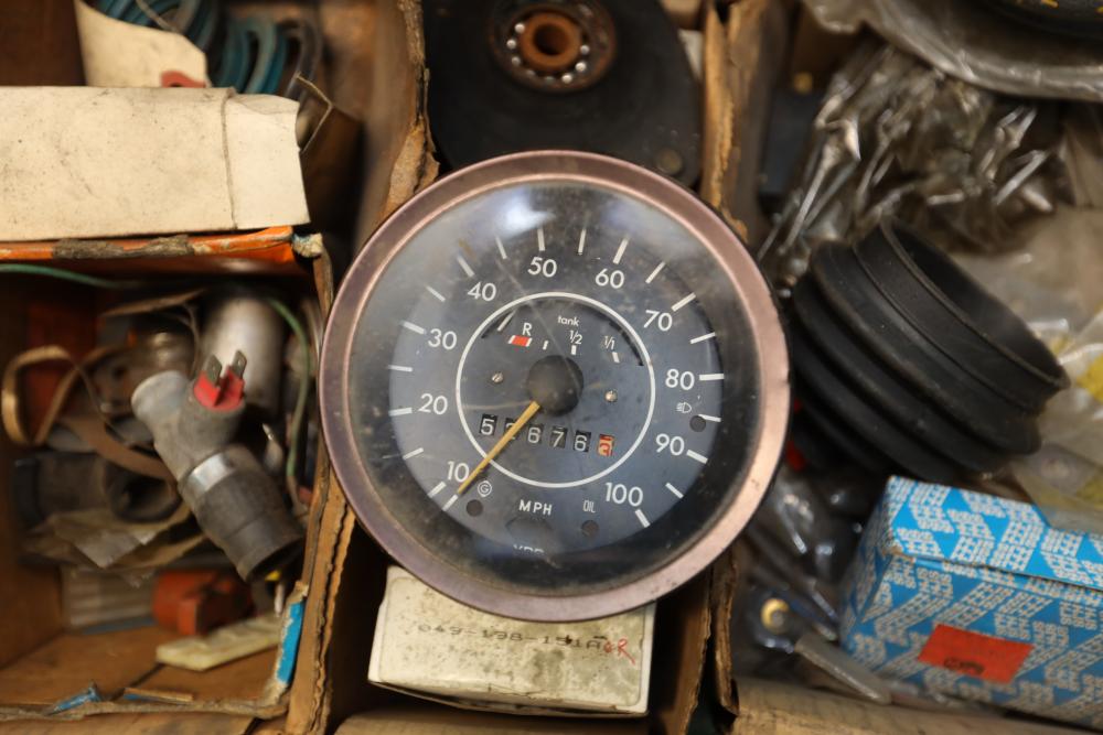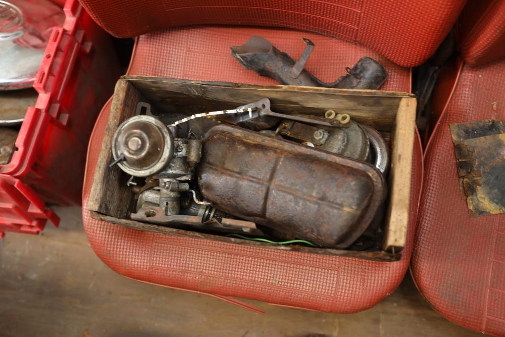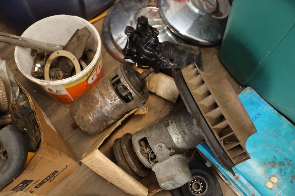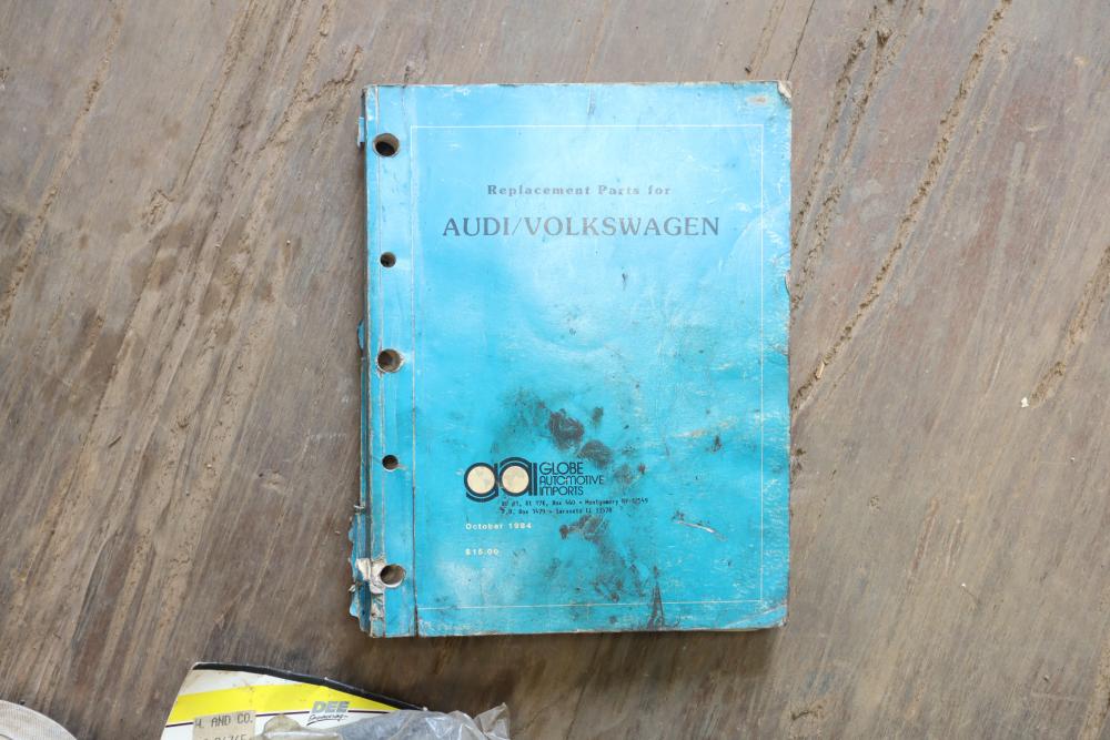 Assorted air cooled Volkswagen new and used car parts including headlights, bezels, numerous tail lights, hood, deck lid, seats, airboxes, heavy duty radial tuned shock absorbers, carburetors, fuse box, fender beading kit, engine stand, Audi/Volkswagen Globe replacement parts manual, many late and older model marker lights, master cylinder, electrical parts, hoses, fuses, engine parts, gaskets, left front fender complete with lights, etc. Buyer must take all.