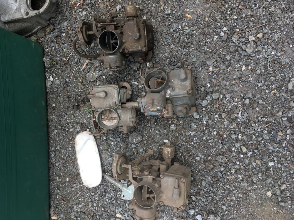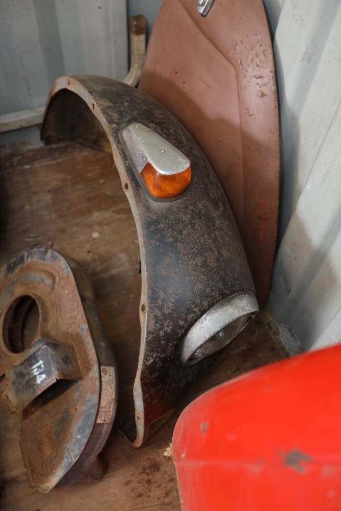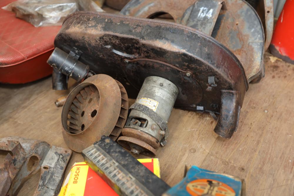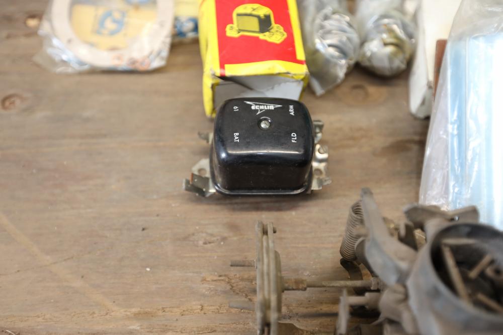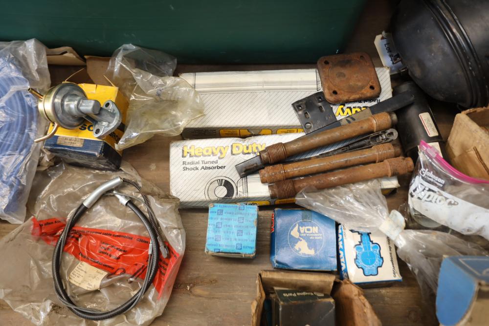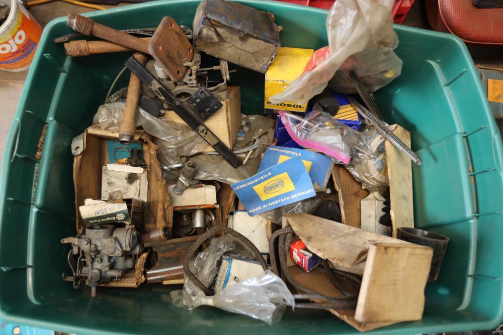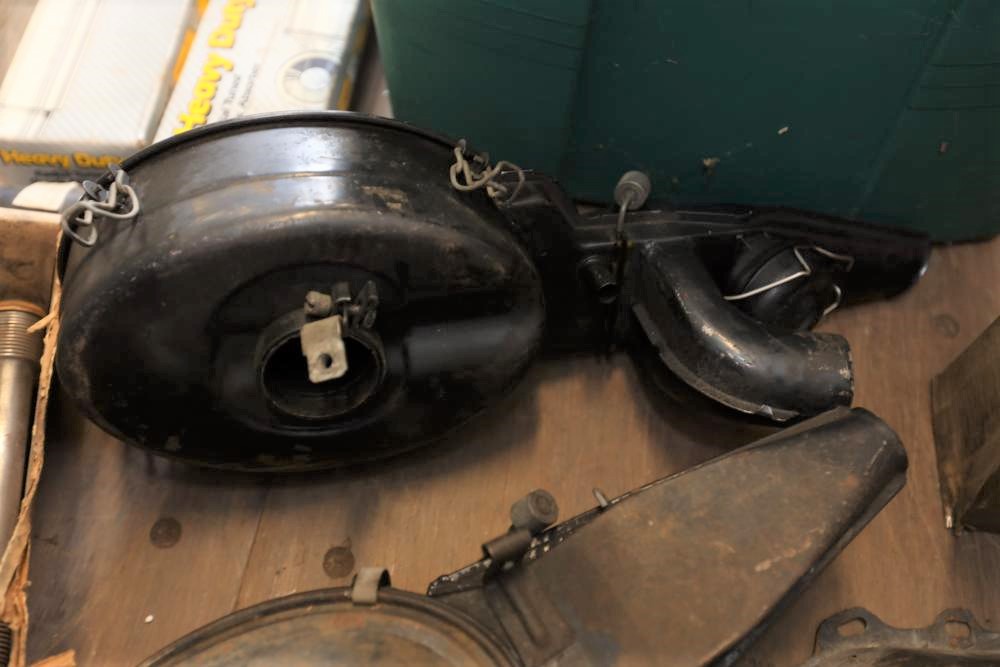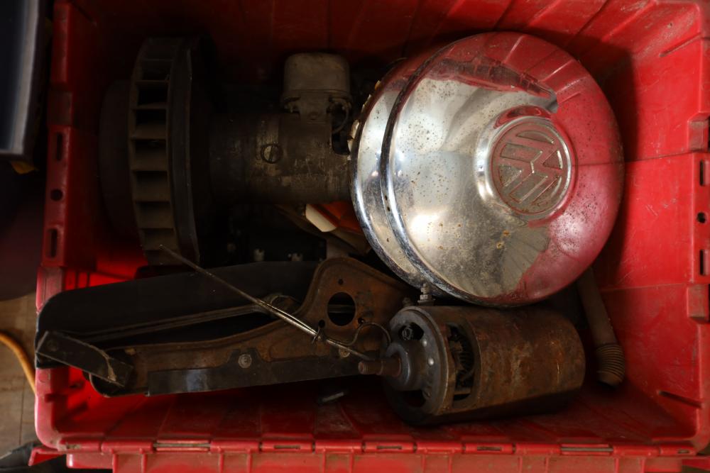 Assorted air cooled Volkswagen new and used car parts including headlights, bezels, numerous tail lights, hood, deck lid, seats, airboxes, heavy duty radial tuned shock absorbers, carburetors, fuse box, fender beading kit, engine stand, Audi/Volkswagen Globe replacement parts manual, many late and older model marker lights, master cylinder, electrical parts, hoses, fuses, engine parts, gaskets, left front fender complete with lights, etc. Buyer must take all.