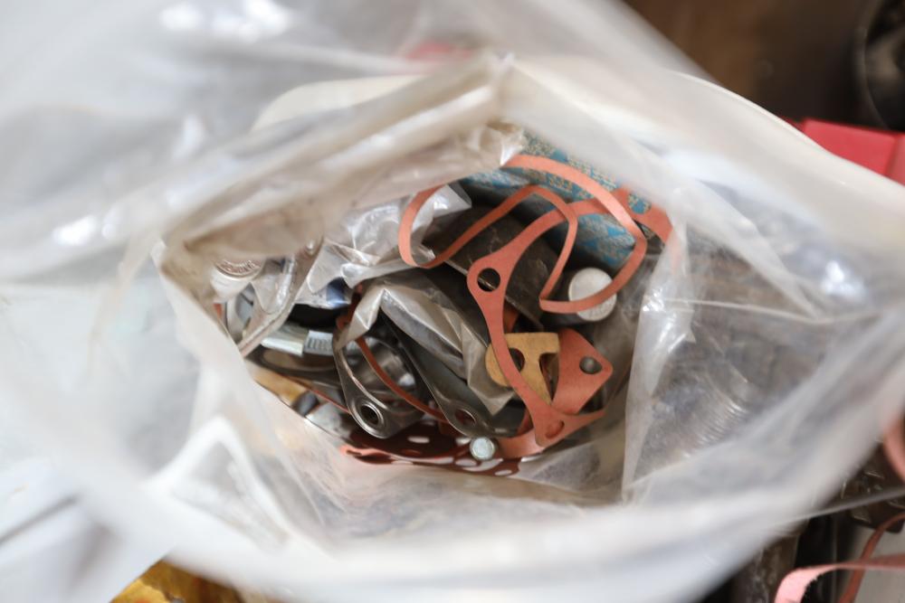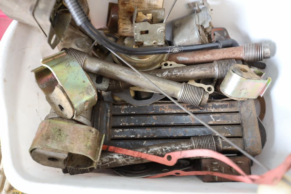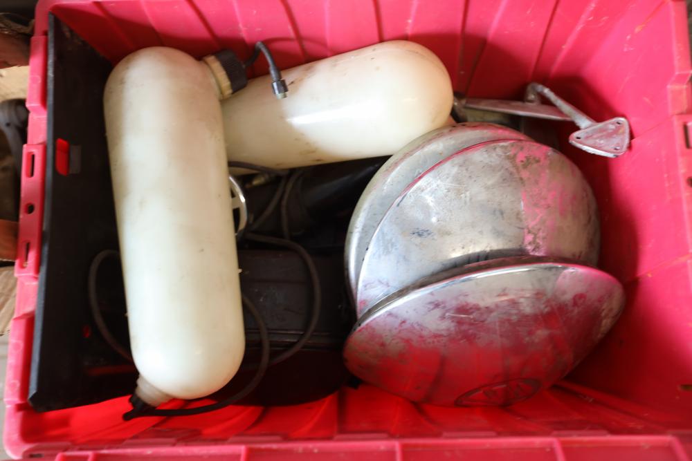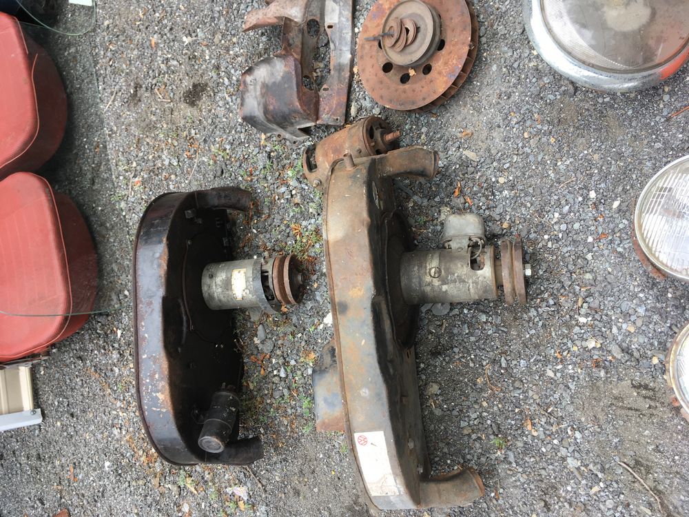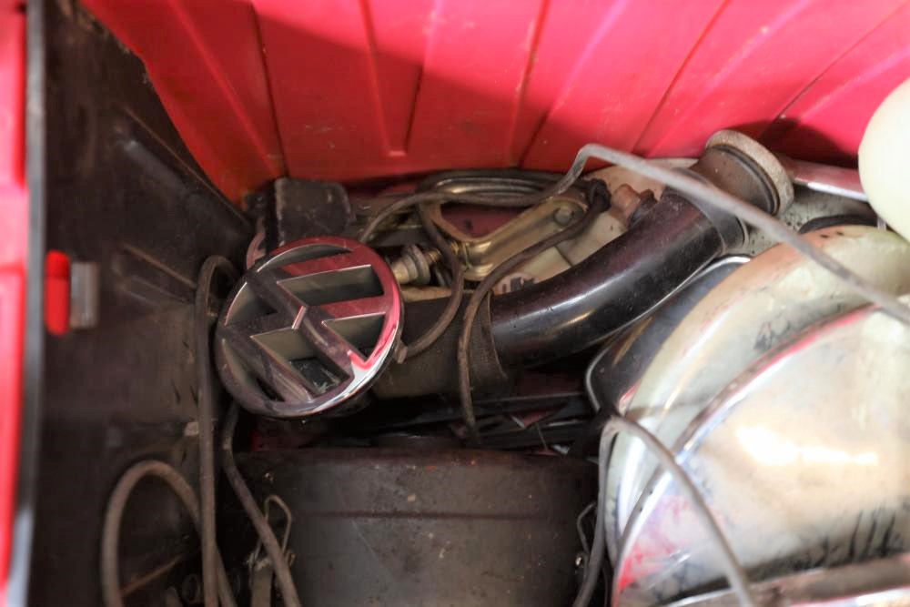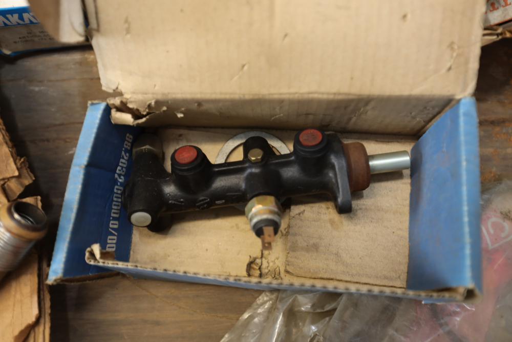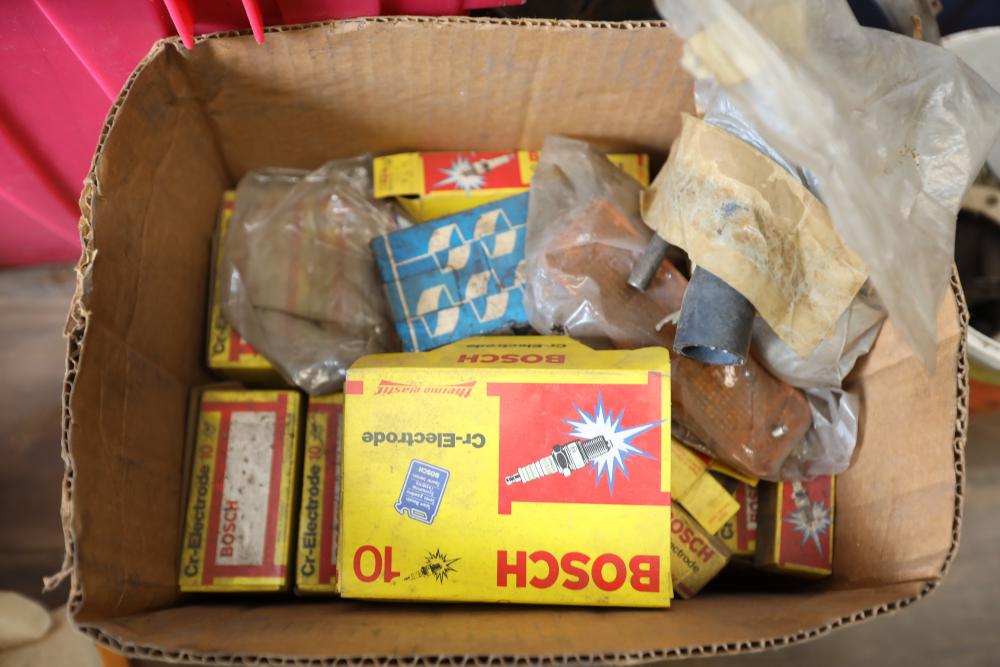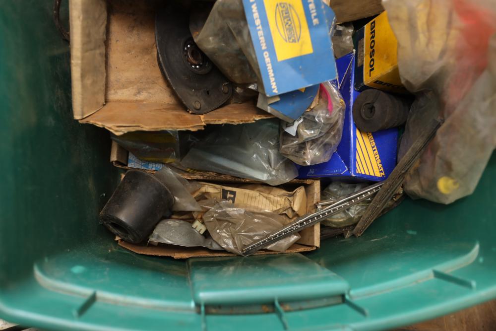 Assorted air cooled Volkswagen new and used car parts including headlights, bezels, numerous tail lights, hood, deck lid, seats, airboxes, heavy duty radial tuned shock absorbers, carburetors, fuse box, fender beading kit, engine stand, Audi/Volkswagen Globe replacement parts manual, many late and older model marker lights, master cylinder, electrical parts, hoses, fuses, engine parts, gaskets, left front fender complete with lights, etc. Buyer must take all.