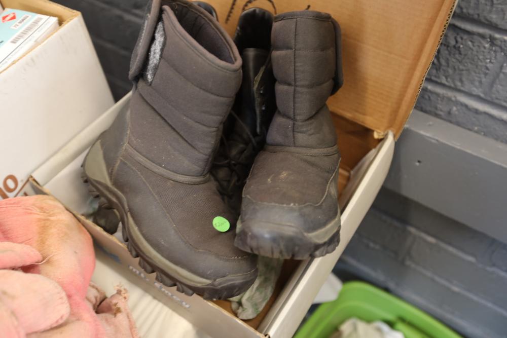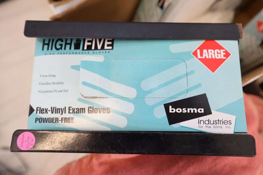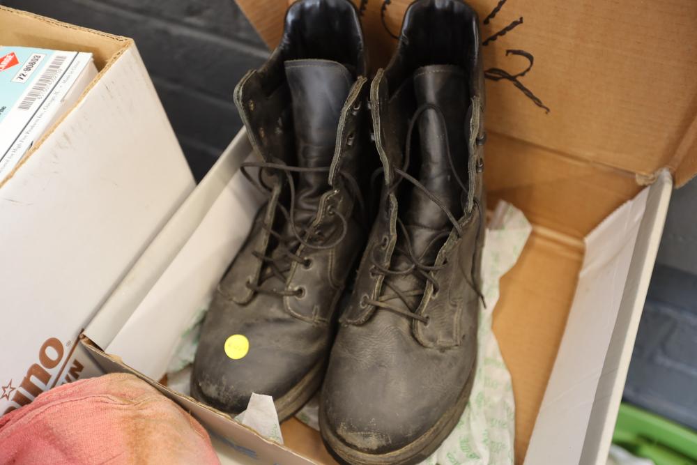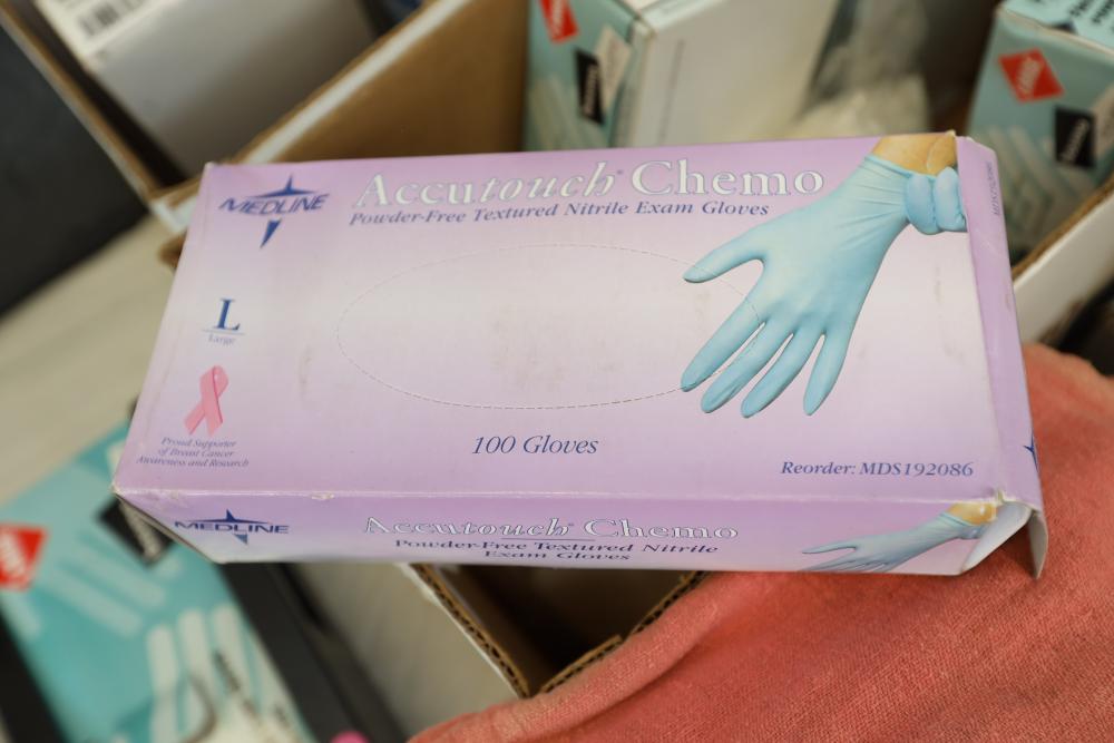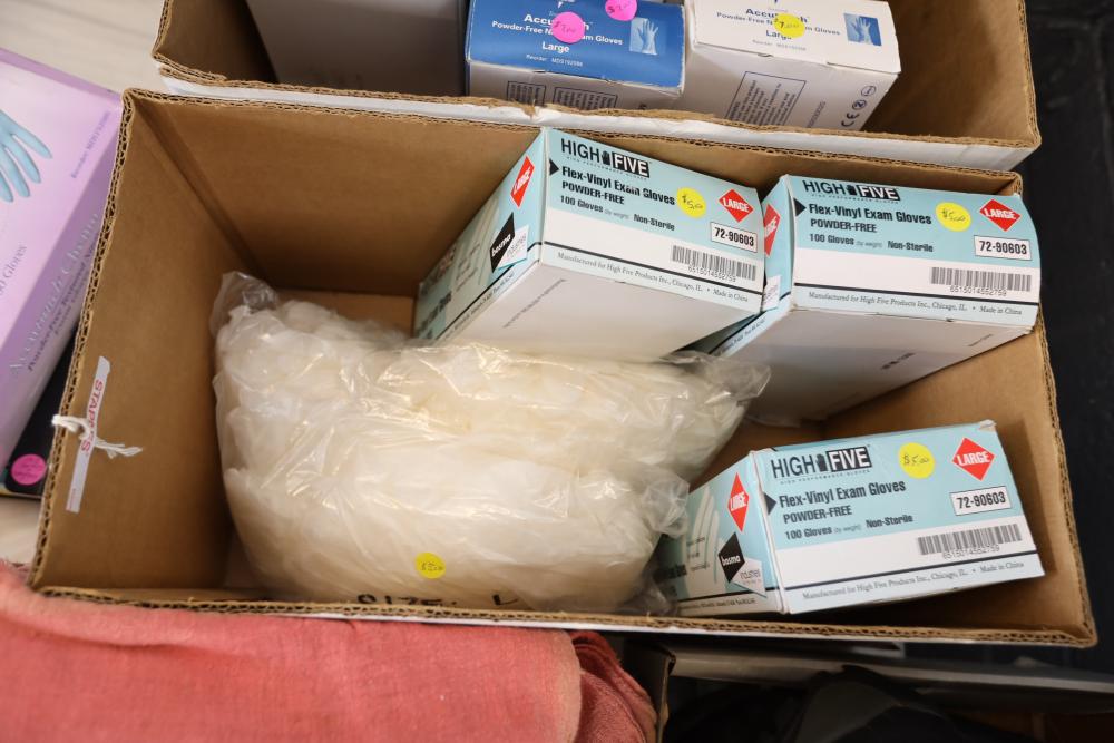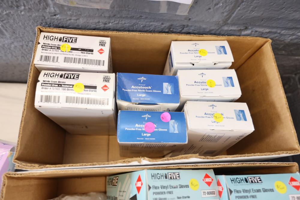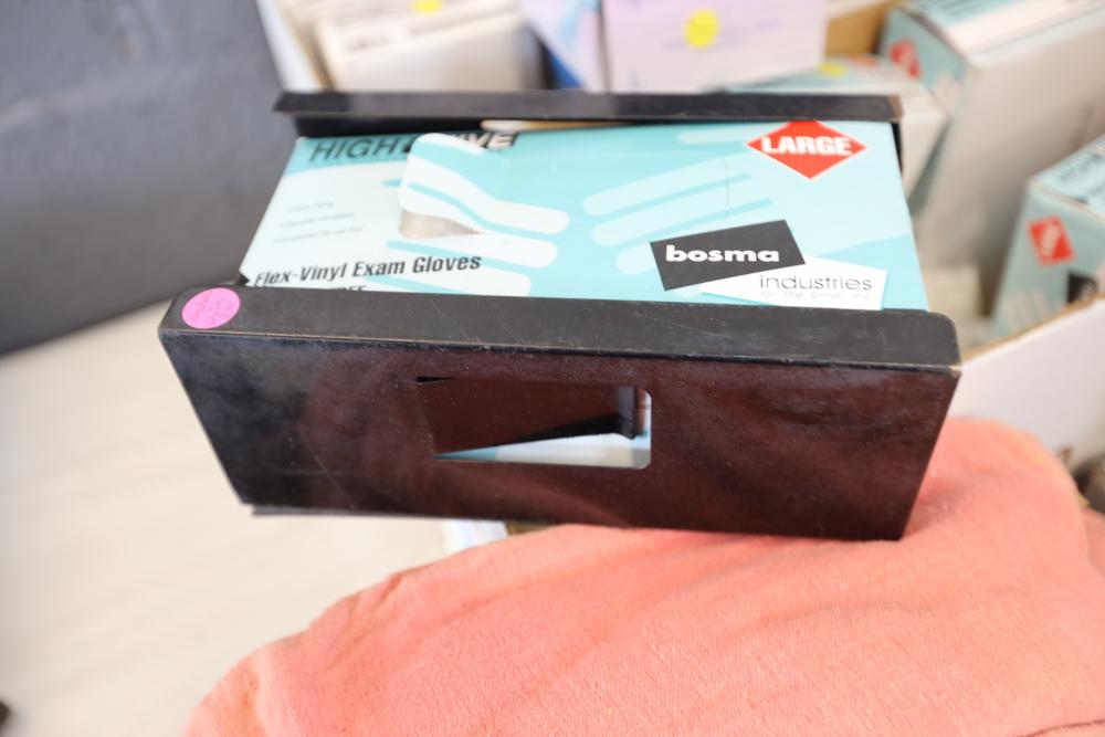 Shop rags, four boxes of High Five flex vinyl exam gloves powder free, five boxes of Medline Accutouch powder free Nitrile exam gloves, two boxes of High Five Nitrile exam gloves powder free, and one box of Medline Accutouch Chemo powder free textured nitrile gloves, all large, also including size 10 1/2 boots and woman's size 9 boots.