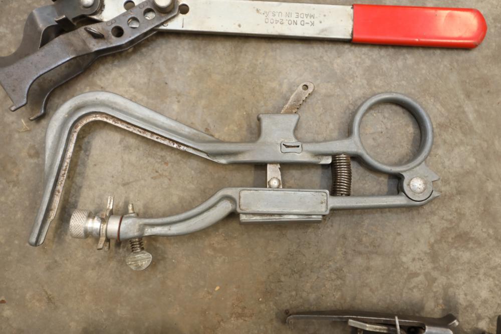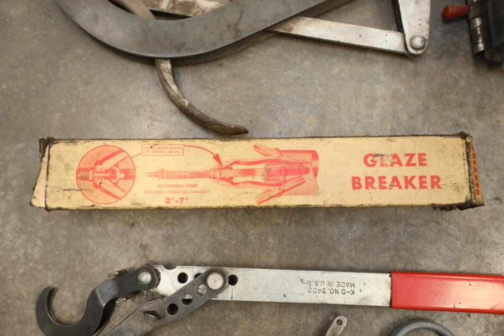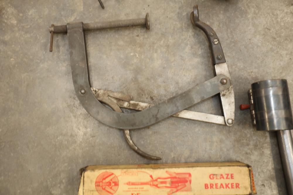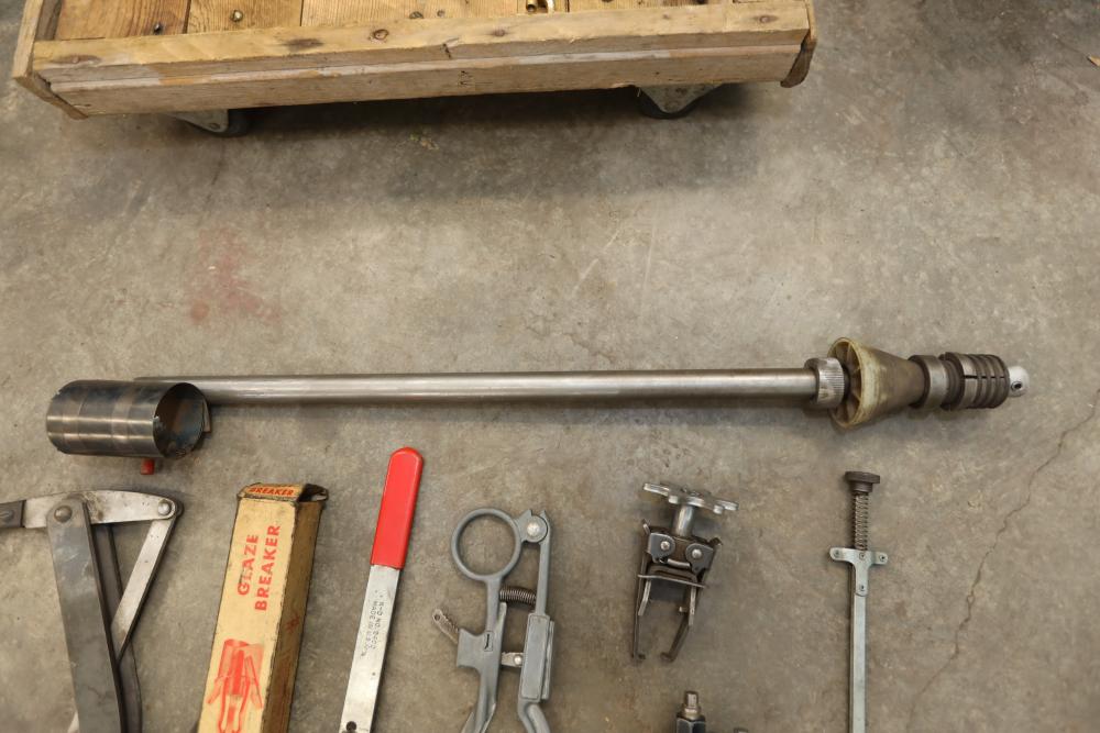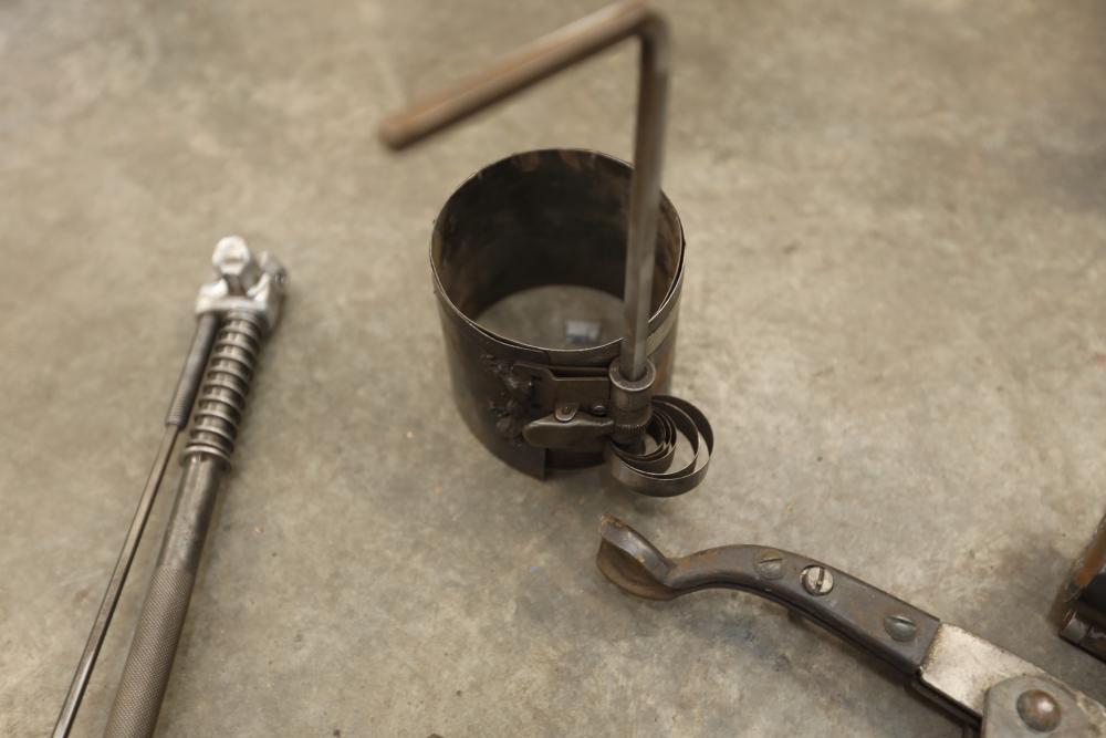 Engine rebuilding tools including piston ring compressors, brake caliper tool, cam bearing tool, valve spring compressor, glaze breaker, piston groove cleaner, ridge reamer, valve spring compressor on car, valve lifter remover, etc..
