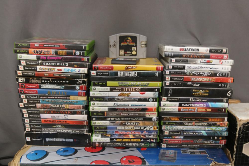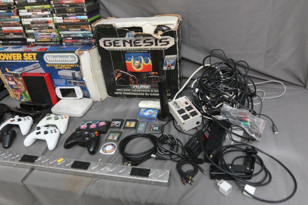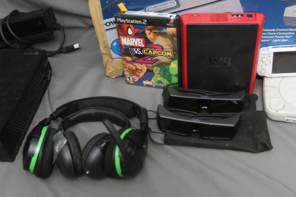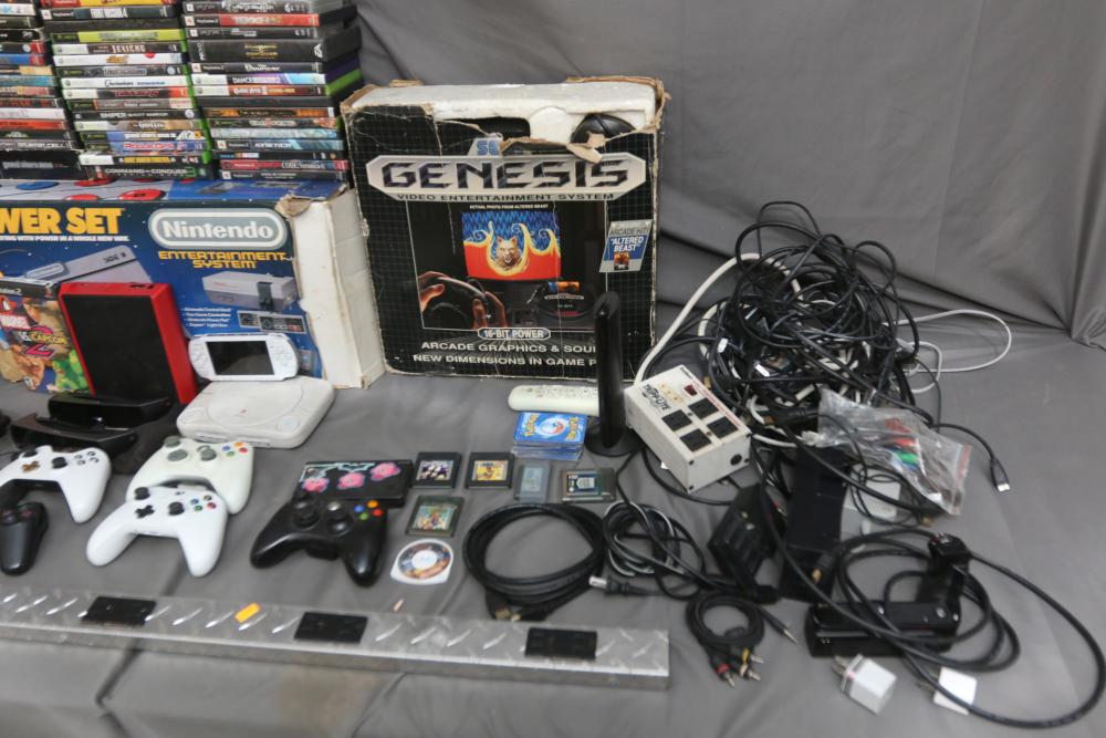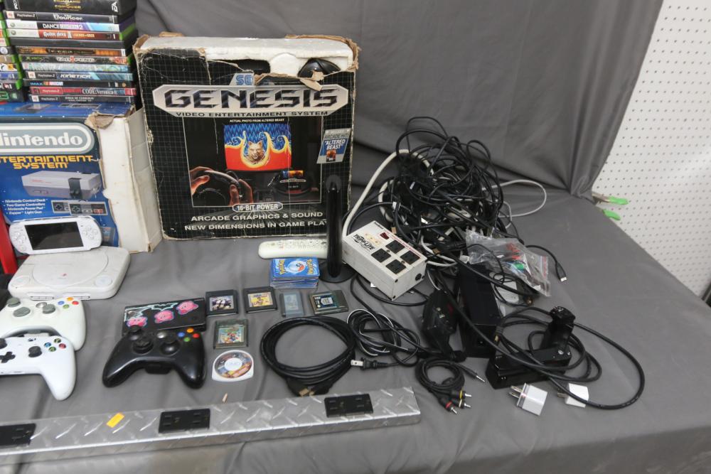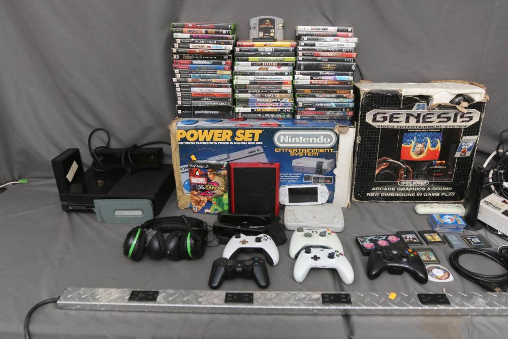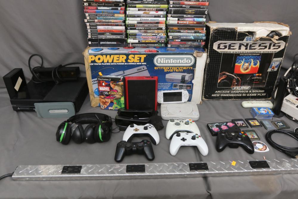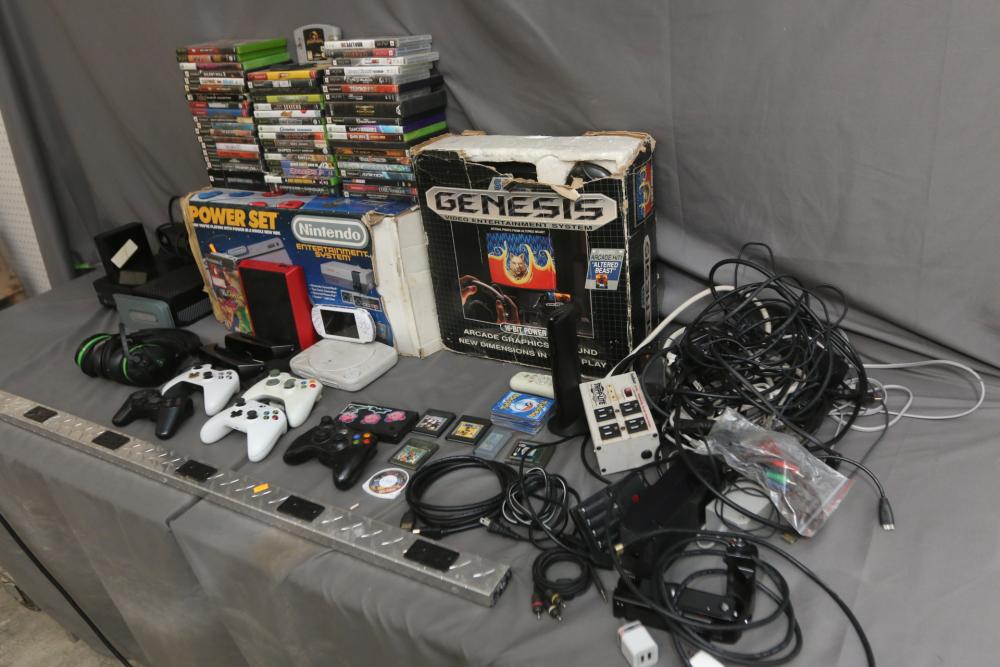 Gaming items incl Microsoft Xbox one, Nintendo Entertainment System, Sega Genesis, Sony PSP, Nintendo DS, Sony PlayStation 1, Nintendo Wii, Xbox and PlayStation controllers, 360 hard drive, Sony 3D glasses, headphones, X Rocker gaming chair, some games incl Marvel vs Capcom 2, Silent Hill 3, Need For Speed Underground 2, Final Fantasy X2, Grand Theft Auto, God of War, Sniper Ghost Warrior, Command & Conquer 3, Tekken 6, Need for Speed Underground, Dead of Alive Xtreme Beach Volleyball, Tekken 4, Virtual Tennis, Crazy Taxi, Duke Nukem Forever, Tom Clancys Splinter Cell, Bully, Fallout, etc. Pickup only.